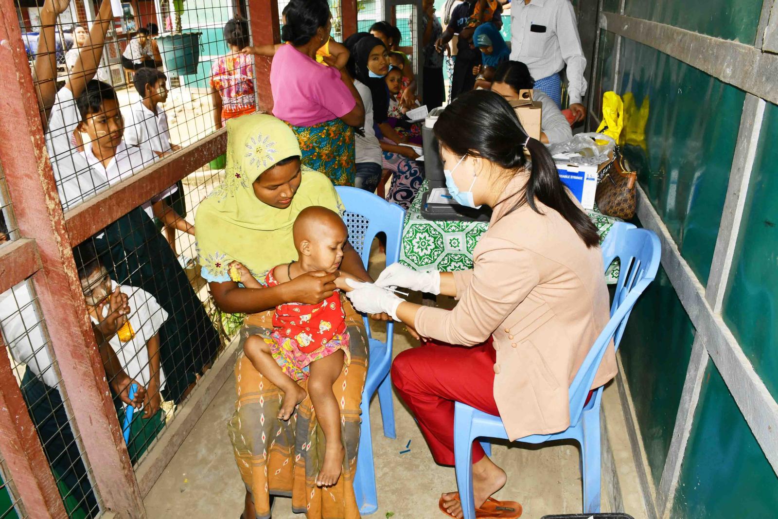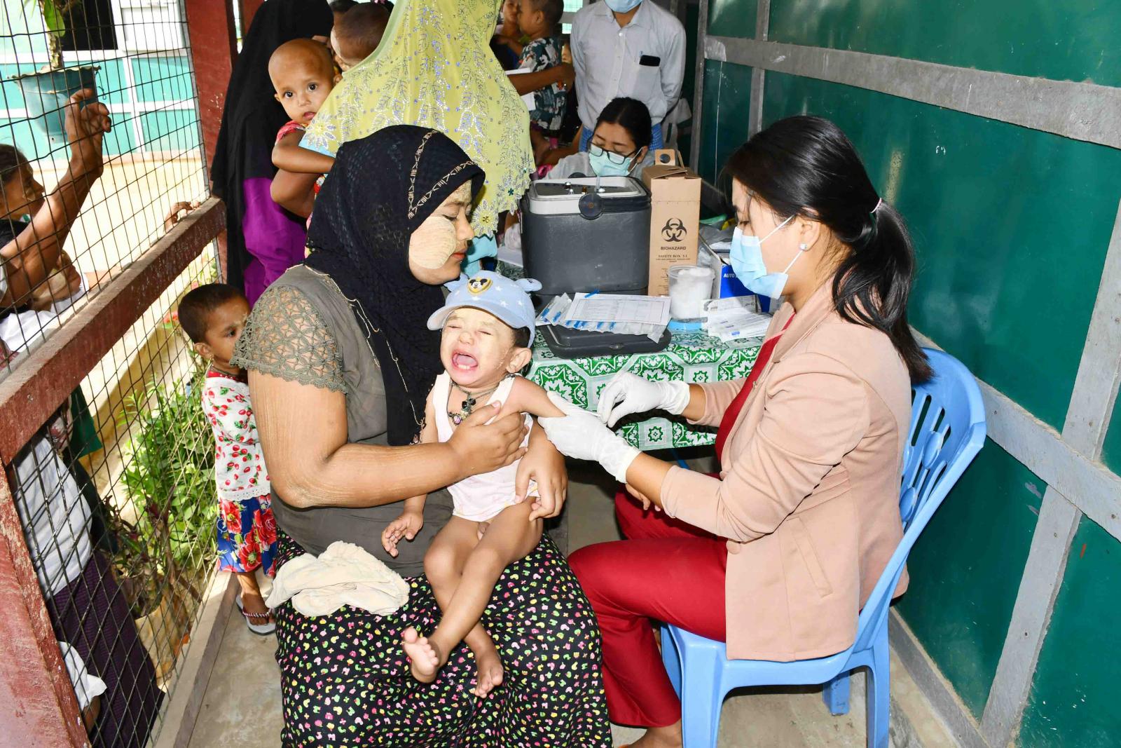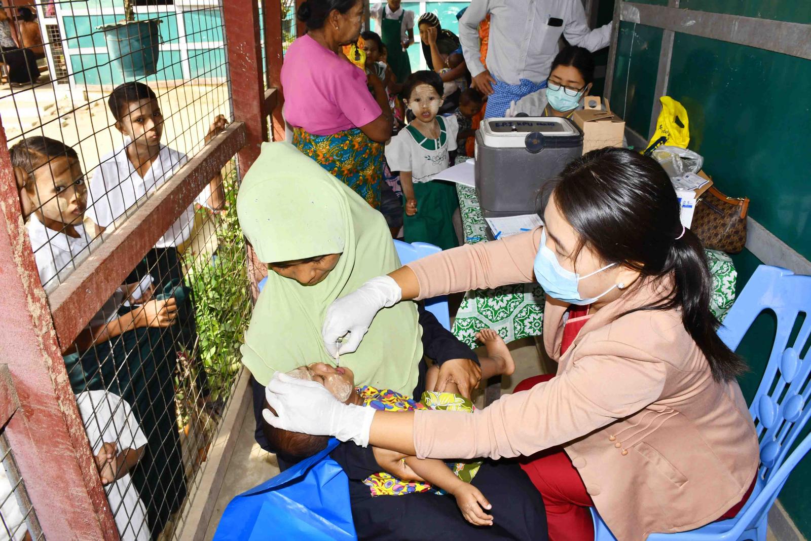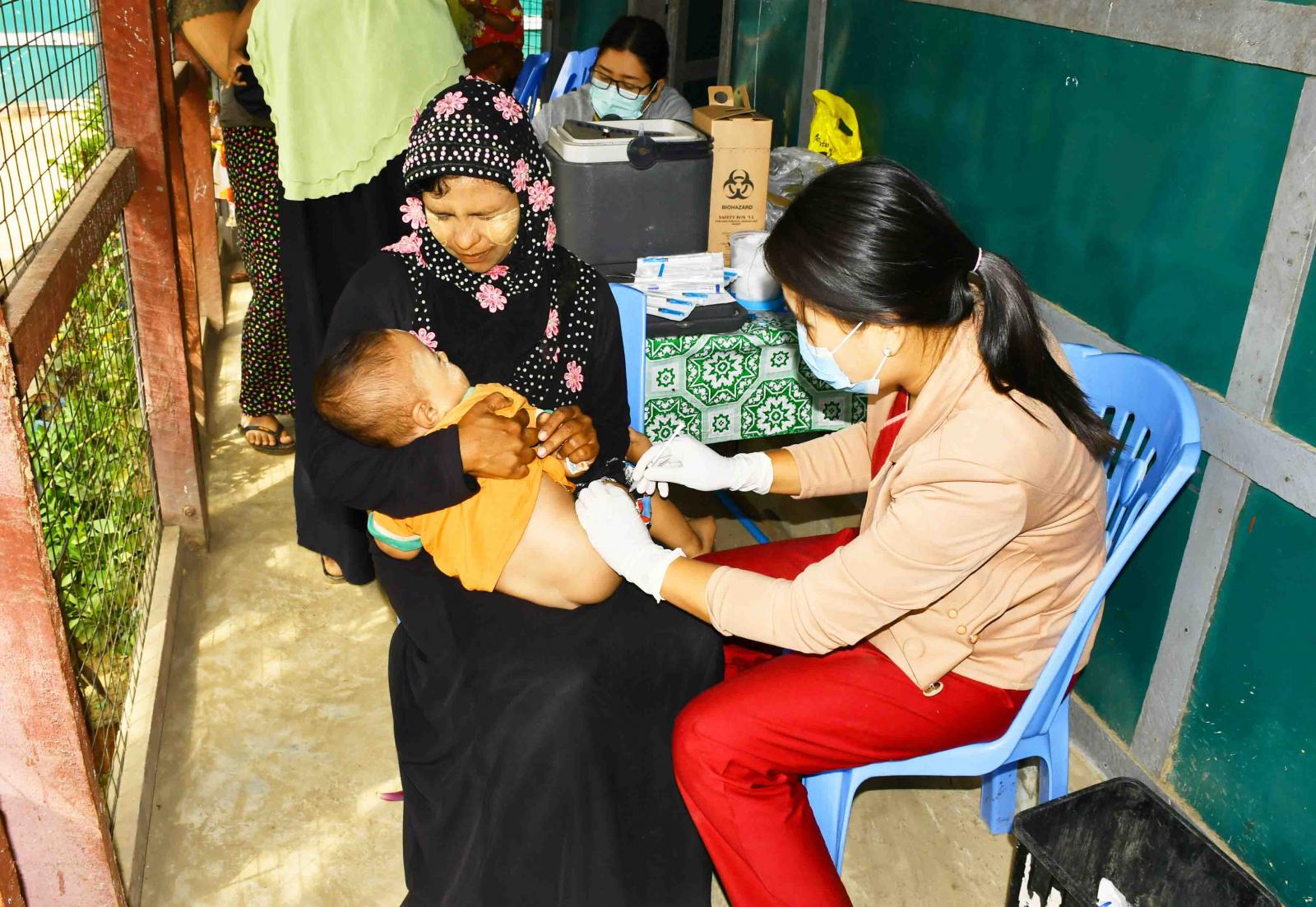 ရခိုင်ပြည်နယ်၊ ကျောက်ဖြူမြို့၊ ကျောက်တစ်လုံး IDPs စခန်းရှိ ကိုယ်ဝန်ဆောင်မိခင်များနှင့်မွေးကင်းစမှ အသက်(၂)နှစ်အောက်ကလေးငယ်များအား ပုံမှန်ကာကွယ်ဆေးထိုးနှံပေးခြင်းကို ယနေ့နံနက်ပိုင်းက ကျန်းမာရေးဌာနမှဝန်ထမ်းများက အဆိုပါစခန်းရှိ အခြေခံပညာမူလတန်းလွန်ကျောင်းတွင် ထိုးနှံပေးလျက်ရှိသည်။