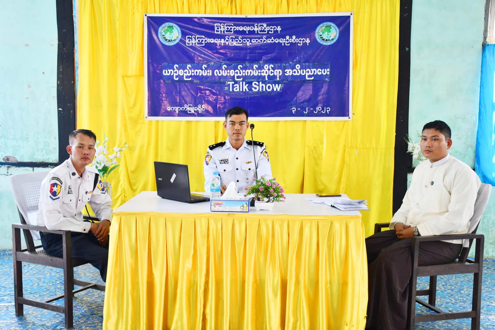 ရခိုင်ပြည်နယ်၊ ကျောက်ဖြူခရိုင်၊ ပြန်ကြားရေးနှင့်ပြည်သူ့ဆက်ဆံရေးဦးစီးဌာန၊ Community Centre ခန်းမတွင် ယမန်နေ့နံနက် ၁၀ နာရီက ပြန်ကြားရေးနှင့်ပြည်သူ့ဆက်ဆံရေးဦးစီးဌာနနှင့် အမှတ်(၂၁) ယာဉ်ထိန်းရဲတပ်ဖွဲ့စုတို့ ပူးပေါင်း၍ ယာဉ်စည်းကမ်း၊ လမ်းစည်းကမ်းဆိုင်ရာ အသိပညာပေးဆွေးနွေးပွဲ Talk Show ကျင်းပပြုလုပ်သည်။