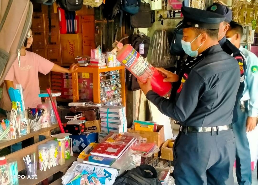 ဆက်လက်၍ မြို့နယ်မီးသတ်ဦးစီးမှူး ဦးလှဝင်းနှင့် မီးသတ်တပ်ဖွဲ့ဝင်များ၊ မြို့နယ်စည်ပင်သာယာရေးအဖွဲ့ ဒုတိယဦးစီးမှူး ဦးမောင်မောင်တို့က မီးဘေးအန္တရာယ် ကြိုတင်ကာကွယ်ရေးအတွက် ရေကန်များ၊ ရေပိုက်ခေါင်းများ၊ မီးချတ်၊ မီးကပ်များ၊ မီးသတ်ဆေးဘူးများ ထားရှိမှု၊ မီးသတ်ဆေးဘူးများ ဟောင်းနွမ်းနေပါက အသစ်လဲလှယ်တပ်ဆင်ကြစေရန်နှင့် ဈေးအတွင်း လှည့်လည်ကြည့်ရှု စစ်ဆေးခြင်း၊ ဈေးအနီးအနားတွင် ဈေးရောင်းချသည့် ဆိုင်ရှေ့ရေမြောင်းများအတွင်း ရေများပိတ်ဆိုမှုမဖြစ်ပေါ်စေရေးနှင့် စွန့်ပစ်အမှိုက် များအား စနစ်တကျစွန့်ပစ်စေရေးတို့ကို ကွင်းဆင်းစစ်ဆေးခဲ့ကြောင်း သိရသည်၊၊