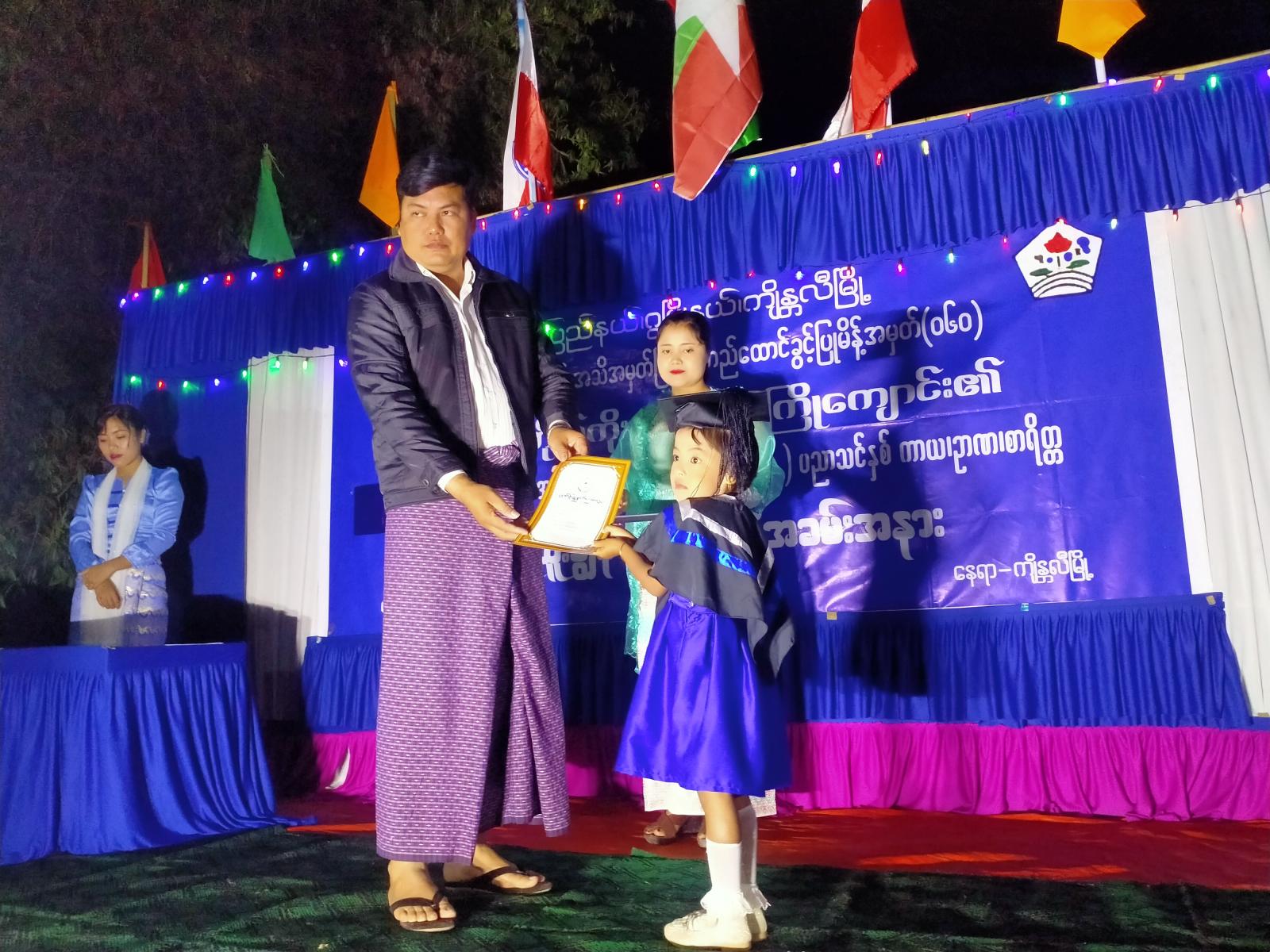 ရခိုင်ပြည်နယ်၊ သံတွဲခရိုင်၊ ကျိန္တလီမြို့၌ မြန်နိုင်ငံကလေးများနေ့ အထိမ်းအမှတ် ကာယ၊ ဉာဏနှင့် စာရိတ္တ ထူးချွန်ဆုများ ချီးမြှင့်ခြင်းအခမ်းအနားကို ယမန်နေ့ ညက ကိုယ့်အားကိုယ်ကိုး မူလတန်းကြိုကျောင်းတွင် ကျင်းပပြုလုပ်ခဲ့သည်။