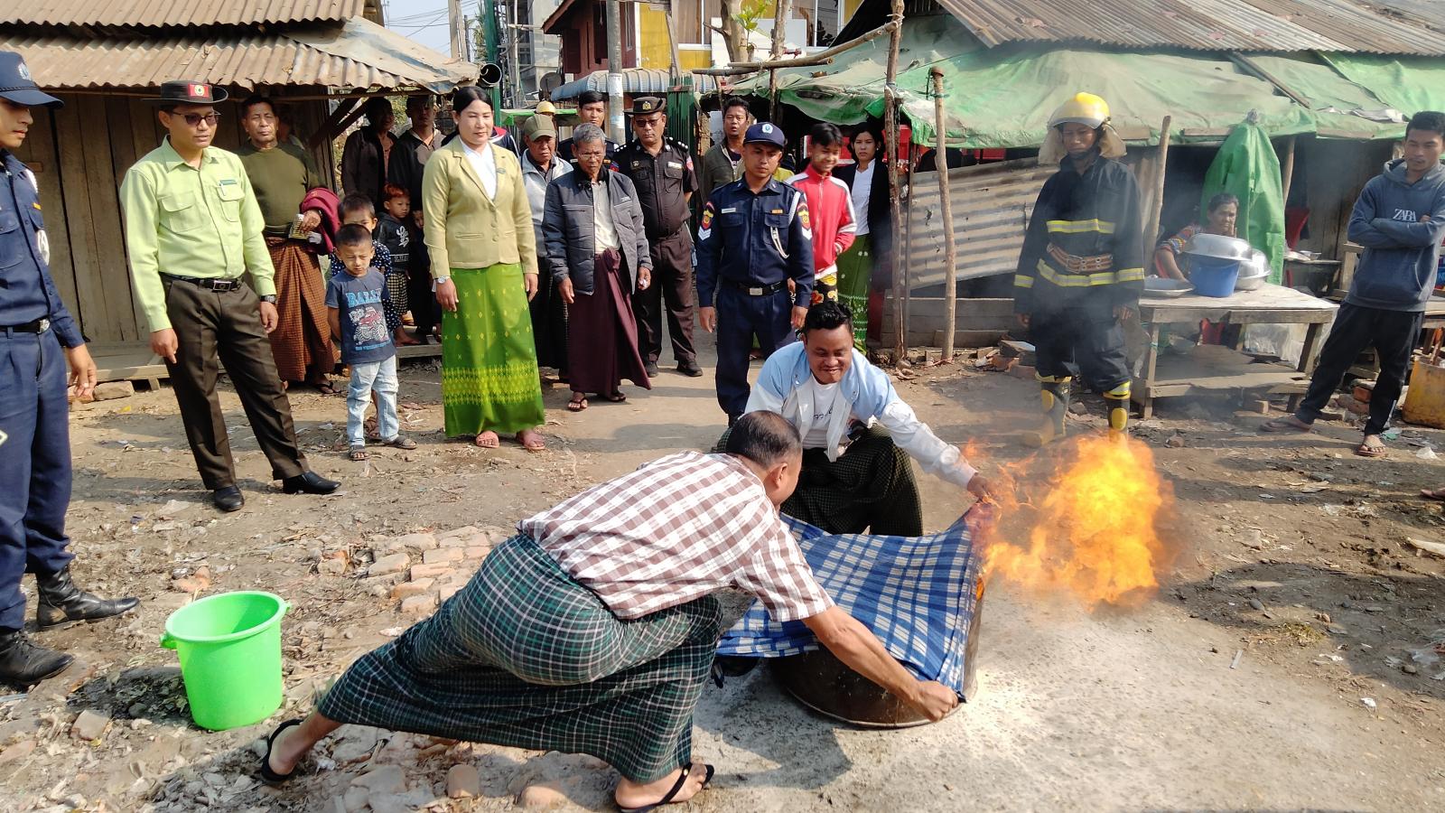 ထိုသို့ဆောင်ရွက်ရာတွင် မြို့နယ်မီးသတ်ဦးစီးမှူး ဦးစီးအရာရှိ ဦးလူမော်တို့က ဈေးမီးဘေးလုံခြုံရေးအတွက် မတော်တဆမီးလောင်မှုဖြစ်ပွားပါက ရှေးဦးစွာ မီးငြိမ်းသတ်ဆေးဘူးဖြင့် စနစ်တကျမီးငြှိမ်းသတ်မှုများကို ရှင်းလင်းပြောကြားပြီး မီးလောင်မှုဖြစ်ပွားနေစဉ် မီးသတ်ဆေးဘူးဖြင့် မီးငြှိမ်းတတ်စေရန် ဆီမီးလောင်ကျွမ်းမှုအား အဝတ်ဖြင့်ဖုံးအုပ်မီးငြှိမ်းသတ်ခြင်းများကို ဈေးသူ၊ ဈေးသားများအား လက်တွေ့ သရုပ်ပြသစေခြင်းတို့ကို ဇာတ်တိုက်လေ့ကျင့်ဆောင်ရွက်ခဲ့ကြသည်။