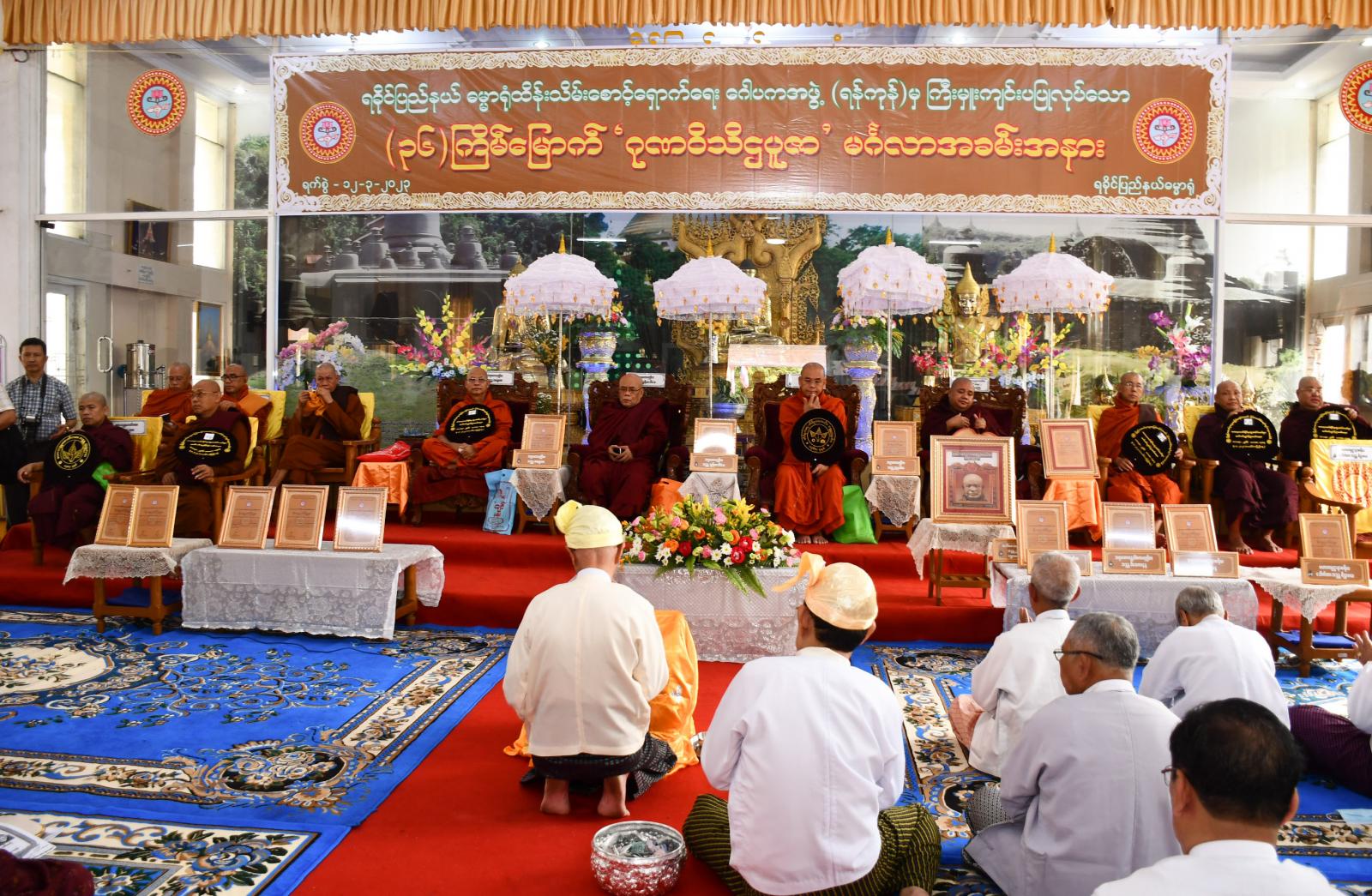ရခိုင်ပြည်နယ် ဓမ္မာရုံထိန်းသိမ်းစောင့်ရှောက်ရေးအဖွဲ့(ရန်ကုန်)က ကြီးမှုးကျင်းပသော (၃၆)ကြိမ်မြောက် ဂုဏဝိသိဋ္ဌပူဇာမင်္ဂလာအခမ်းနားကို ယနေနံနက်ပိုင်းက ရန်ကုန်တိုင်းဒေသကြီး ဗဟန်းမြို့နယ်၊ အာဇာနည်လမ်း၊ ရွှေတိဂုံစေတီတော်အရှေ့မုခ်အနီးရှိ ရခိုင်ပြည်နယ် ဓမ္မာရုံ၌ကျင်ပရာ ဘွဲ့တံဆိပ်တော်ရနိုင်ငံတော်မှ သာသနာတော်ဆိုင်ရာ ဘွဲ့တံဆိပ်တော်ဆက်ကပ်ခြင်းခံရသော သံဃာတော်အရှင်သူမြတ်(၁၅)ပါးနှင့် ရခိုင်ပြည်နယ် ဓမ္မာရုံဂေါအကအဖွဲ့ဥက္ကဋ္ဌနှင့်အဖွဲ့ဝင်များ၊ အလှူရှင်များ၊ ဖိတ်ကြားသည့် ဧည့်သည်တော်များ တက်ရောက်ပူဇော်ကြသည်။