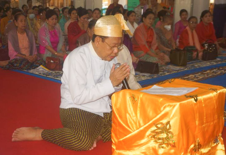 ယင်းနောက်တက်ရောက်လာကြသည့် ဧည့်ပရိတ်သက်များက အဂ္ဂမဟာပဏ္ဍိတဘွဲ့တံဆိပ်တော်ရ၊ မင်းကျောင်းစာသင်တိုက်ဆရာတော် ဘဒ္ဒန္တသူရိယာဘိဝံသထံမှ ငါးပါးသီလခံယူဆောက်တည်ပြီး၊ ကြွရောက်တော်မှုလာကြသော ပင့်သံဃာတော်များထံမှ မေတ္တာသုတ်တရာတော်များ နာယူကြသည်။
