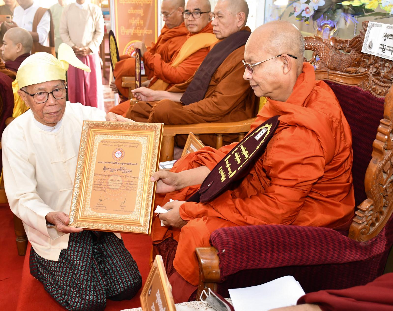 ဆက်လက်၍ အဂ္ဂမဟာပဏ္ဍိတဘွဲ့တံဆိပ်တော်ရ ဆရာတော်ကြီးများထံမှ၊ ဩဝါဒတရားတော်များနာယူကြပြီး ဘွဲ့တံဆိပ်တော်ရဆရာတော်များအား ဂုဏ်ပြုမှတ်တမ်းလွှာများကို ရခိုင်ပြည်နယ်ဓမ္မာရုံထိန်းသိမ်းစောင့်ရှောက်ရေးဂေါပကအဖွဲ့ (ရန်ကုန်)မှ တာဝန်ရှိသူများက ဆပ်ကပ်ပူဇော်ကြသည်။