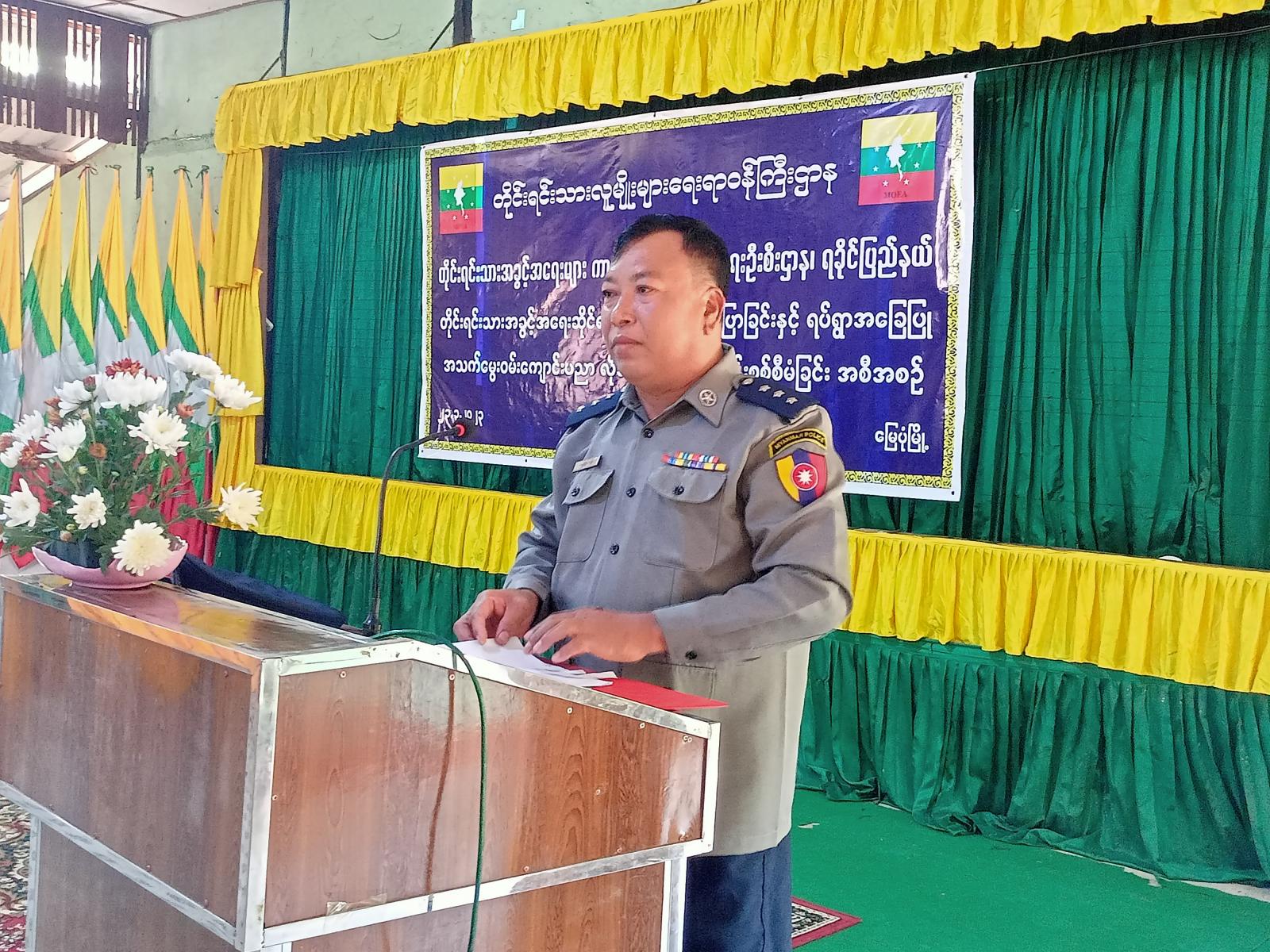 ဆက်လက်၍ မြို့နယ်ရဲတပ်ဖွဲ့မှူးရုံးမှ ဒုတိယရဲမှူး စောဦးထွန်းက လူကုန်ကူးမှုနှင့်မူးယစ် ဆေးဝါး တားဆီးကာကွယ်ရေးအကြောင်း သိကောင်းစရာများကိုရှင်းလင်းပြောကြားပြီး တိုင်းရင်းသား အခွင့် အရေးများ ကာကွယ်စောင့်ရှောက်ရေးဦးစီးဌာန၊ ရခိုင်ပြည်နယ်ညွှန်ကြားရေးမှူးရုံးမှ ဒုတိယညွှန်ကြားရေးမှူး ဒေါ်သိန်းဦးက တိုင်းရင်းသားလူမျိုးများ၏ အခွင့်အရေး၊ ကာကွယ်စောင့်ရှောက်သည့် နည်းဥပဒေနှင့် ရပ်ရွာအခြေပြုအသက်မွေးဝမ်းကျောင်း ပညာလိုအပ်ချက်တို့ကို ဆန်းစစ်စီမံခြင်း၊ စစ်တမ်းကောက်ယူခြင်းတို့ကို Projector စက်ဖြင့်ရှင်းလင်းတင်ပြပြောကြားသည်။