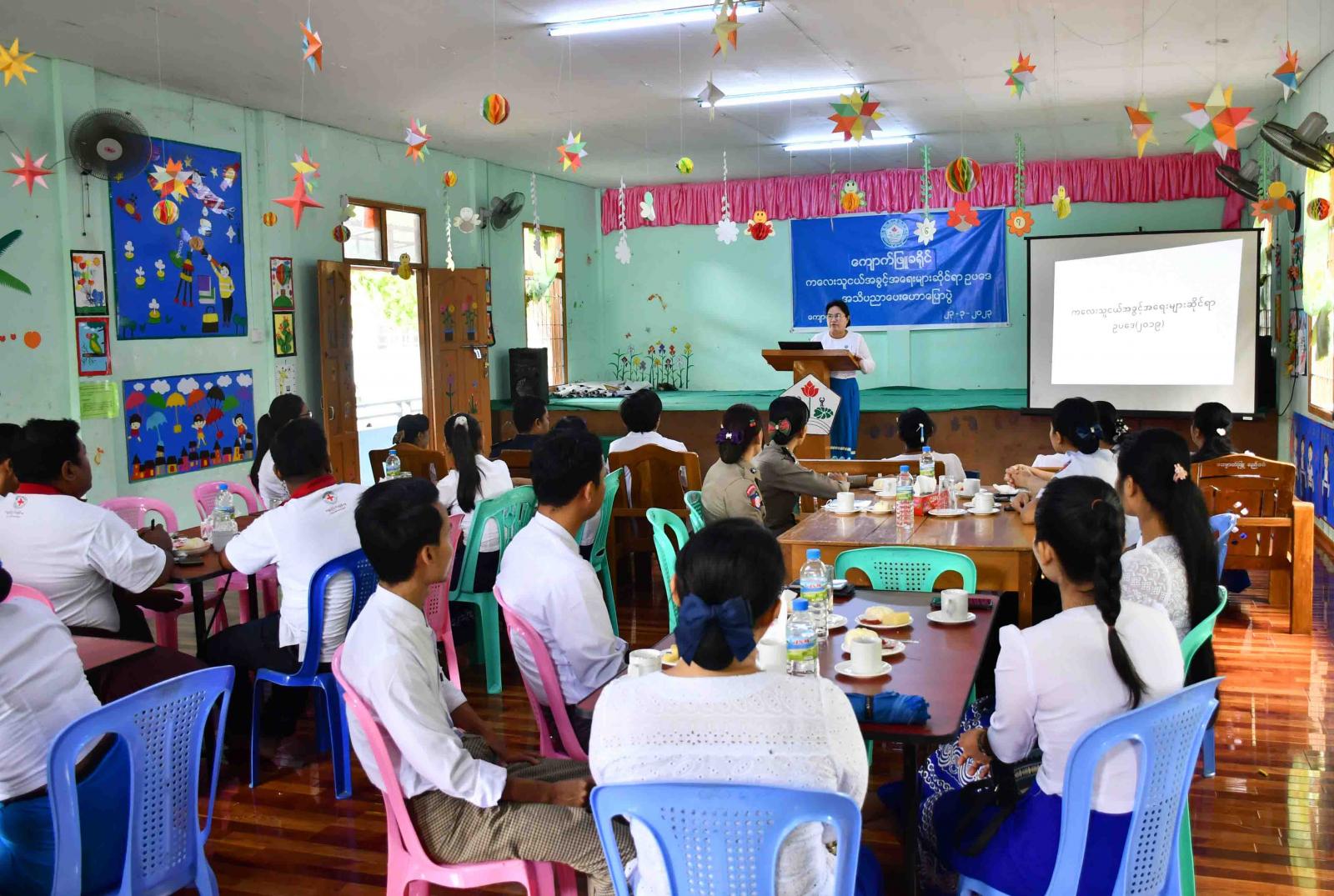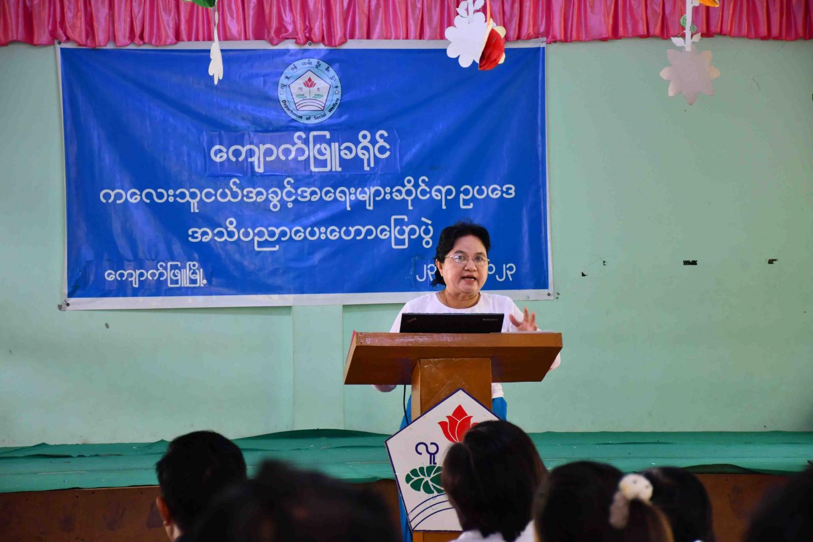 အခမ်းအနားတွင် ခရိုင်လူမှုဝန်ထမ်းဦးစီးဌာနမှ ဒုတိယညွှန်ကြားရေးမှူး ဒေါ်ခင်နွယ်ထွန်းက မြန်မာနိုင်ငံအပါအဝင် ကမ္ဘာနှင့်အဝန်းတွင် ကလေးသူငယ်များအပေါ် အကြမ်းဖက်ခြင်း၊ လစ်လျူရှုခံရခြင်း၊ ခေါင်းပုံဖြတ်ခြင်းများတွေ့ရှိကြားသိနေရပြီး ကလေးသူငယ်မှု ခင်းများ လည်းဖြစ်ပွားလျက်ရှိပါကြောင်း၊ မြန်မာနိုင်ငံသည် ကလေးသူငယ်အခွင့်အရေးများကို အပြည်အဝဖြည့်ဆည်းပေးနိုင်ရေးအတွက် ကလေးသူငယ်အခွင့်အရေးများဆိုင်ရာ အမျိုးသားကော်မတီ(NCRC)ကို ဖွဲ့စည်းခဲ့ပြီး ပြည်နယ်၊ ခရိုင်၊ မြို့နယ်(CRC)ကော်မတီများကို ဖွဲ့စည်းဆောင်ရွက်ခဲ့ပါကြောင်း မိမိတို့မြို့နယ်တွင်လည်း မြို့နယ် အဆင့်ကော်မတီကိုဖွဲ့စည်းပြီး ကလေးသူငယ်များ အကျိုးဆောင်ရွက်လျက်ရှိပါကြောင်းနှင့် ကလေးသူငယ်အခွင့်အရေးများ ဆိုင်ရာဥပဒေ၊ နည်းဥပဒေများကို အကျယ်တဝင့်ရှင်းလင်းဟောပြောခဲ့ရာ တက်ရောက်လာ ကြသူများမှ မိမိတို့သိရှိလိုသည်များအား အပြန်/အလှန်မေးမြန်းဆွေးနွေးခဲ့ကြသည်။