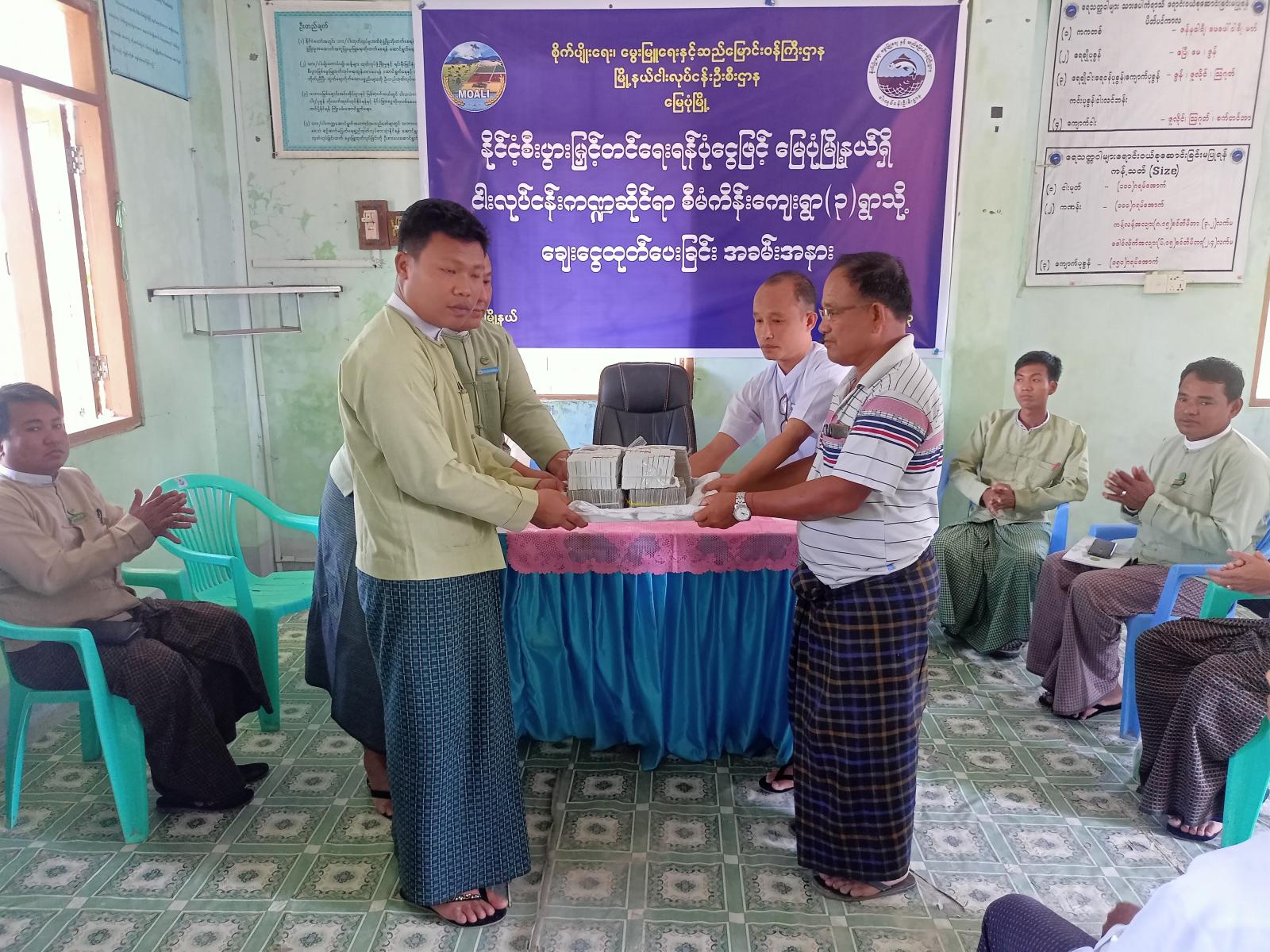 ယနေ့ကျင်းပသော နိုင်ငံ့စီးပွားမြှင့်တင်ရေးစီမံကိန်းမတည်ရန်ပုံငွေလွှဲပြောင်းပေးအပ်ပွဲတွင် မြေပုံမြို့နယ်မှ ငါးလုပ်ငန်းအဓိကလုပ်ကိုင်သော ကျေးရွာ(၃)ရွာသို့ တစ်ရွာလျှင်မတည်ရန်ပုံငွေ ကျပ်သိန်း (၆၀၀)စီ လွှဲပြောင်းပေးအပ်သည်။