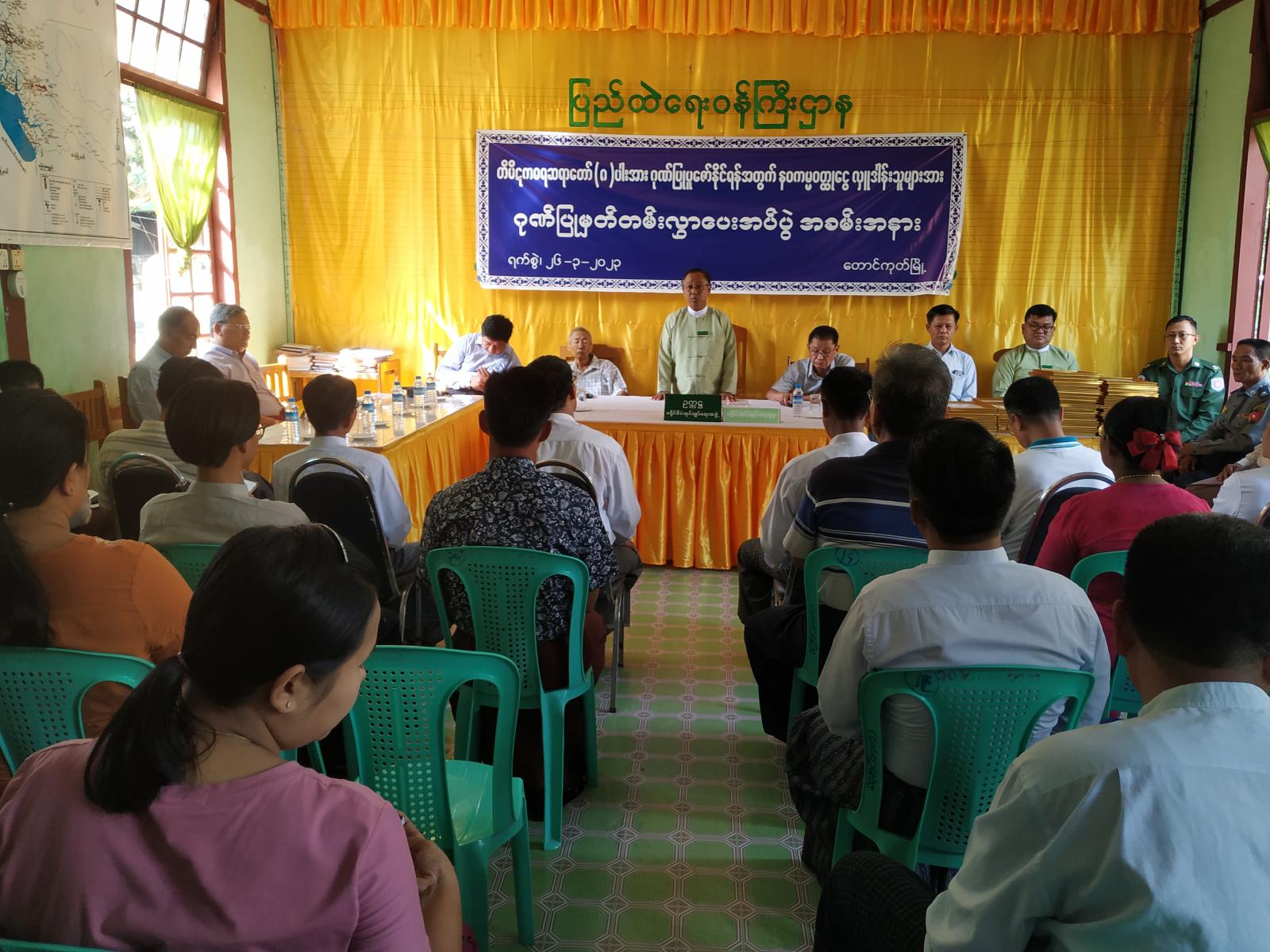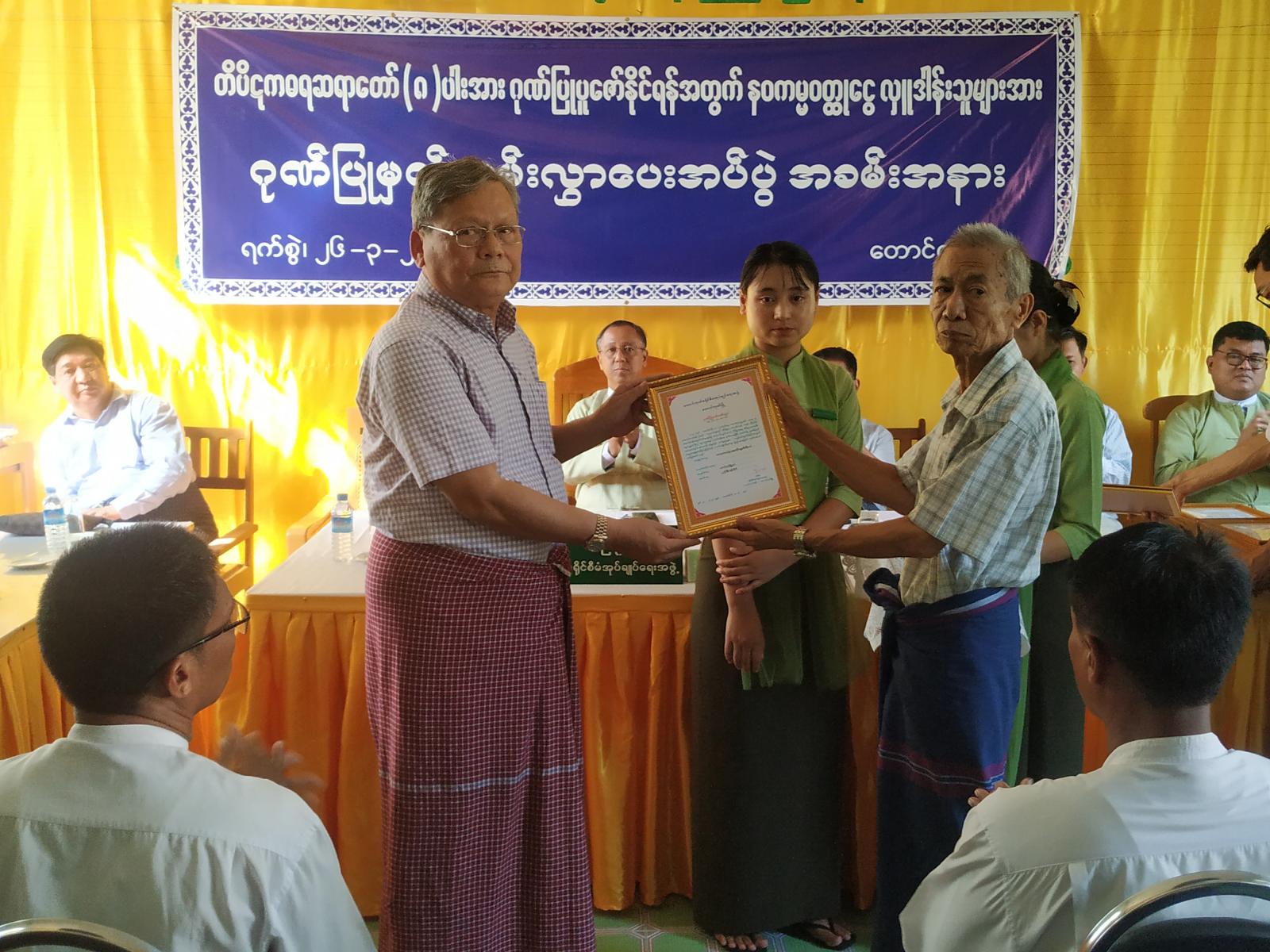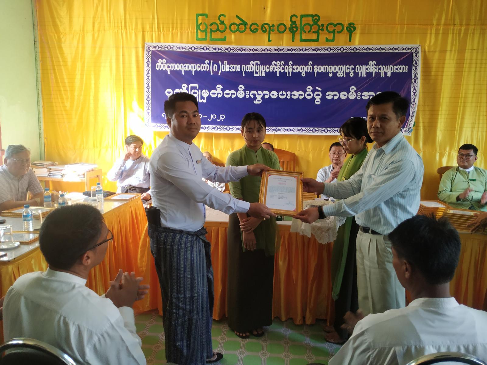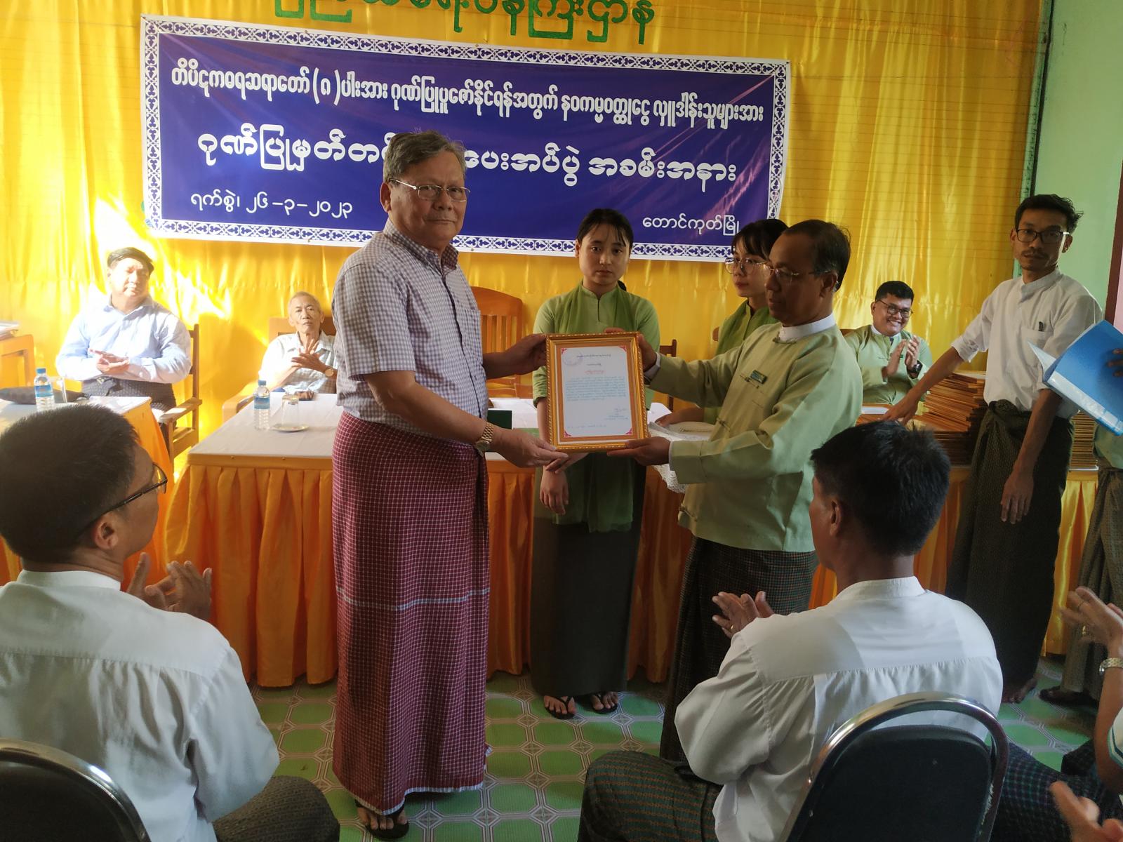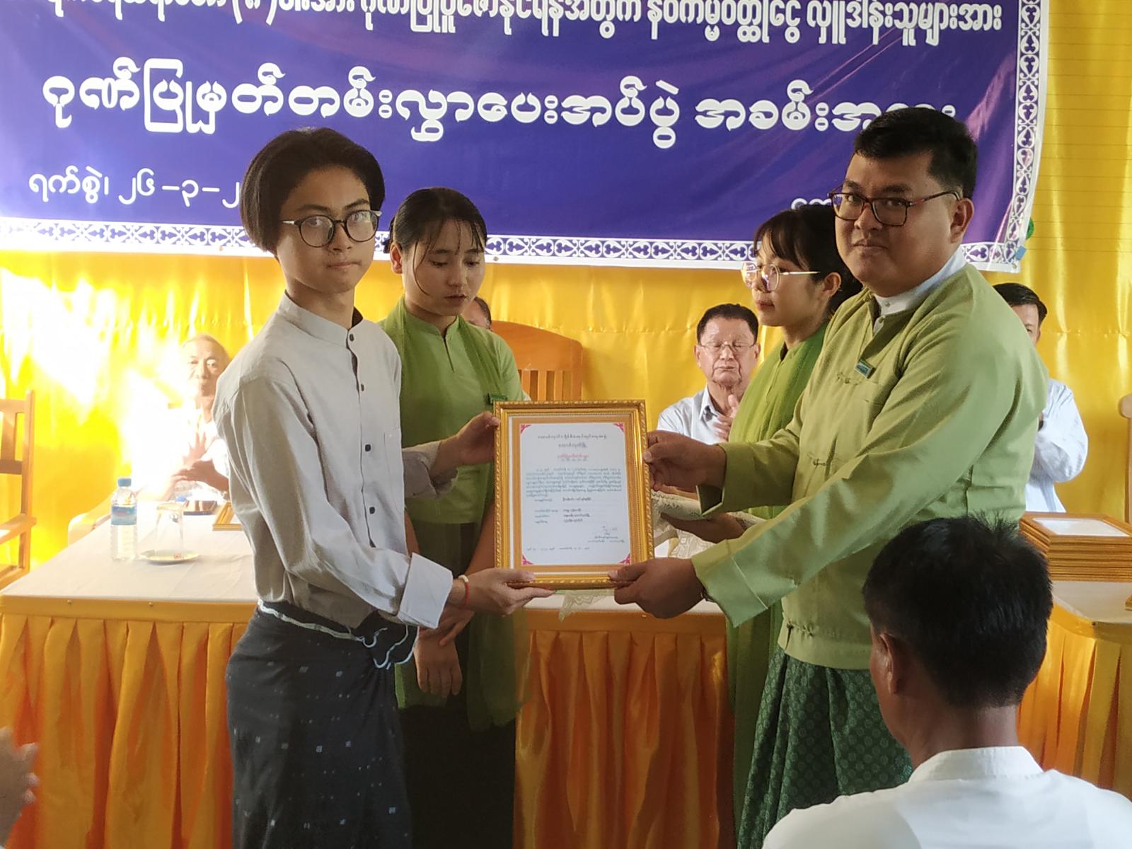ဆက်လက်၍ ခရိုင်စီမံအုပ်ချုပ်ရေးအဖွဲ့ဝင် ဦးမောင်ပုကအလှူငွေများ လက်ခံရရှိမှုနှင့်သုံးစွဲမှုအခြေအနေများကို ရှင်းလင်းပြီးနောက်ခရိုင်စီမံအုပ်ချုပ်ရေးအဖွဲ့ဥက္ကဋ္ဌ ဦးကျော်မြင့်လှိုင်နှင့် တာဝန်ရှိသူများက အလှူရှင်များသို့ ဂုဏ်ပြုမှတ်တမ်းလွှာများ ပေးအပ်သည်။