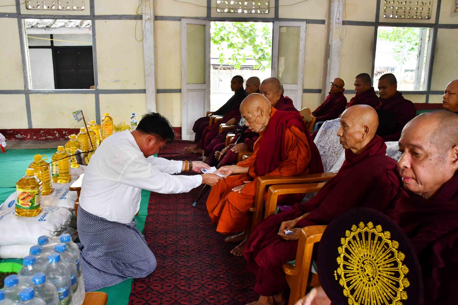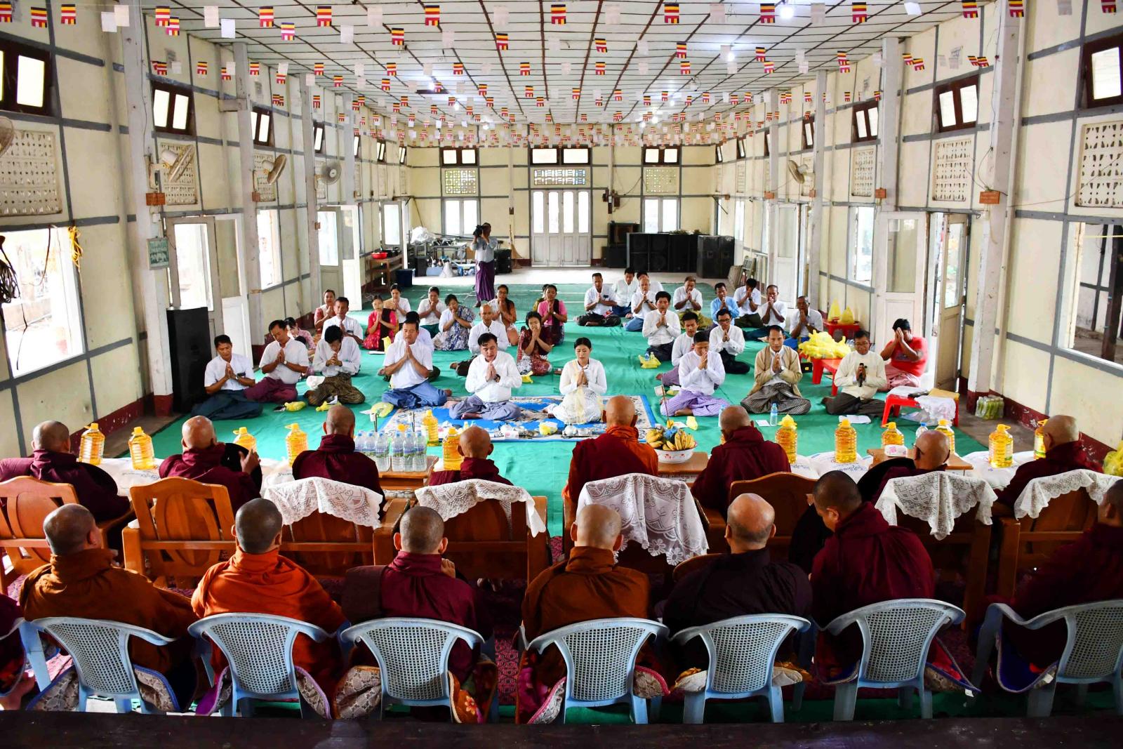 ရှေ့ဦးစွာ အခမ်းအနားကို သံဃာတော်များနှင့်ပရိတ်သတ်များက အခမ်းအနားကို “နမောတဿ” သုံးကြိမ်ရွတ်ဆို ဘုရားကန်တော့ပြီး နဂါးကျောင်းတိုက် ဦးစီးပဓာနနာယက နိုင်ငံတော်ဩဝါဒါ စရိယ အဘိဓဇမဟာရဋ္ဌဂုရု၊ အဂ္ဂမဟာပဏ္ဍိတ၊ ဘဒ္ဒန္တ စကိန္ဒာဘိဝံသ အရှင်သူမြတ်ထံမှ ငါးပါးသီလ ခံယူဆောက်တည်ခဲ့ကြသည်။ ဆက်လက်၍ ခရိုင်စီမံအုပ်ချုပ်ရေးအဖွဲ့ဥက္ကဋ္ဌ ဦးရဲလင်းမောင်နှင့်ဇနီး၊ ခရိုင်စီမံအုပ်ချုပ်ရေးအဖွဲ့ဝင်များ၊ မြို့နယ်စီမံအုပ်ချုပ်ရေးအဖွဲ့ဥက္ကဋ္ဌ၊ ဦးမျိုးမင်းထွဏ်းနှင့် မြို့နယ် စီမံအုပ်ချုပ်ရေးအဖွဲ့ဝင်များ၊ ခရိုင်/မြို့နယ်ဌာနဆိုင်ရာများနှင့် ကြံတိုင်းအောင်မိသားစုတို့က ပင့်သံဃာဆရာတော်ကြီးများအား လှူဖွယ်ပစ္စည်းများနှင့် ဝတ္ထုငွေများ ဆက်ကပ်လှူဒါန်းပြီး လှူဒါန်းမှု အစုစုတို့အတွက် မြို့နယ်သံဃနာယကအဖွဲ့ ဥက္ကဋ္ဌ ၊ ဓမ္မဆာယာကျောင်းတိုက် ဆရာတော် ဘဒ္ဒန္တ စန္ဒာဝရမှ ရေစက်သွန်းချအမျှပေးဝေခဲ့ပြီး အခမ်းအနားကို ဗုဒ္ဓသာသနံစိရံတိဌတု “သုံးကြိမ်” ရွတ်ဆိုဆုတောင်းကာ အခမ်းအနားကို ရုပ်သိမ်းခဲ့သည်။
