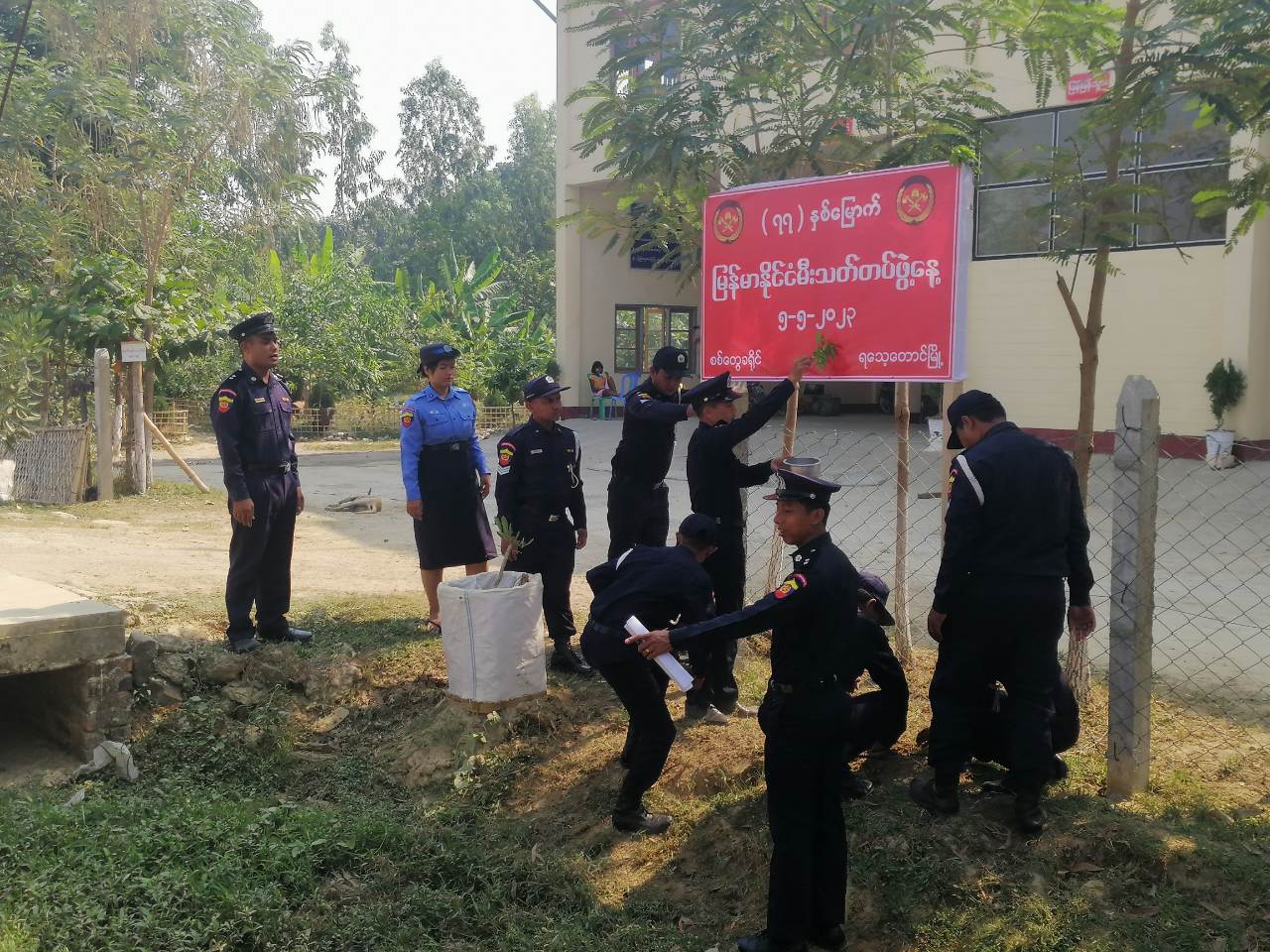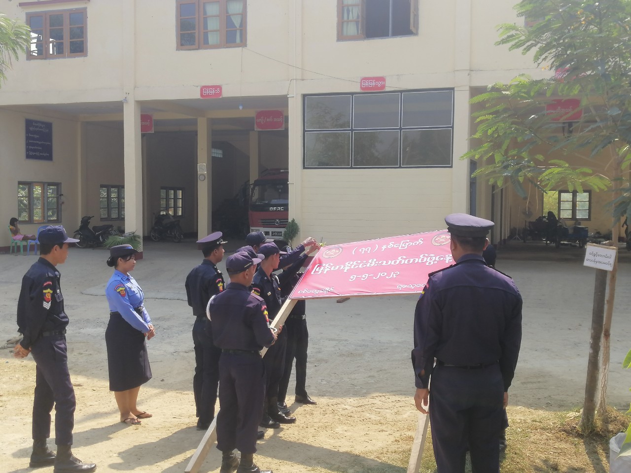 ထိုသို့ ဆိုင်းဘုတ်စိုက်ထူရာတွင် မြို့နယ်မီးသတ်ဦးစီးဌာနမှ ဦးစီးအရာရှိ ဦးလူမော် ဦးဆောင်သော သန္ဓေတပ်ဖွဲ့ဝင်များနှင့် အရန်မီးသတ်တပ်ဖွဲ့ဝင်များသည် မီးသတ်ဦးစီးဌာနရုံးရှေ့ရှိ (၇၇) နှစ်မြောက် မြန်မာနိုင်ငံ မီးသတ်ဖွဲ့နေ့အား ဂုဏ်ပြုကြိုဆိုပါ၏ စာသားပါ ဆိုင်းဘုတ်ကို စိုက်ထူခဲ့ကြပြီး အမွှေးနံသာရည်နှင့် သပြေခက်များဖြင့် ပက်ဖျန်းခဲ့ကြကြောင်း သိရသည်။