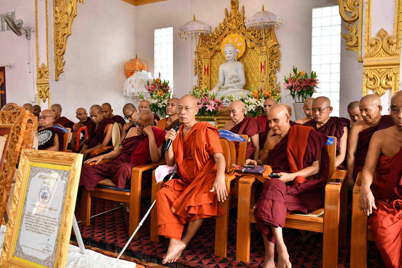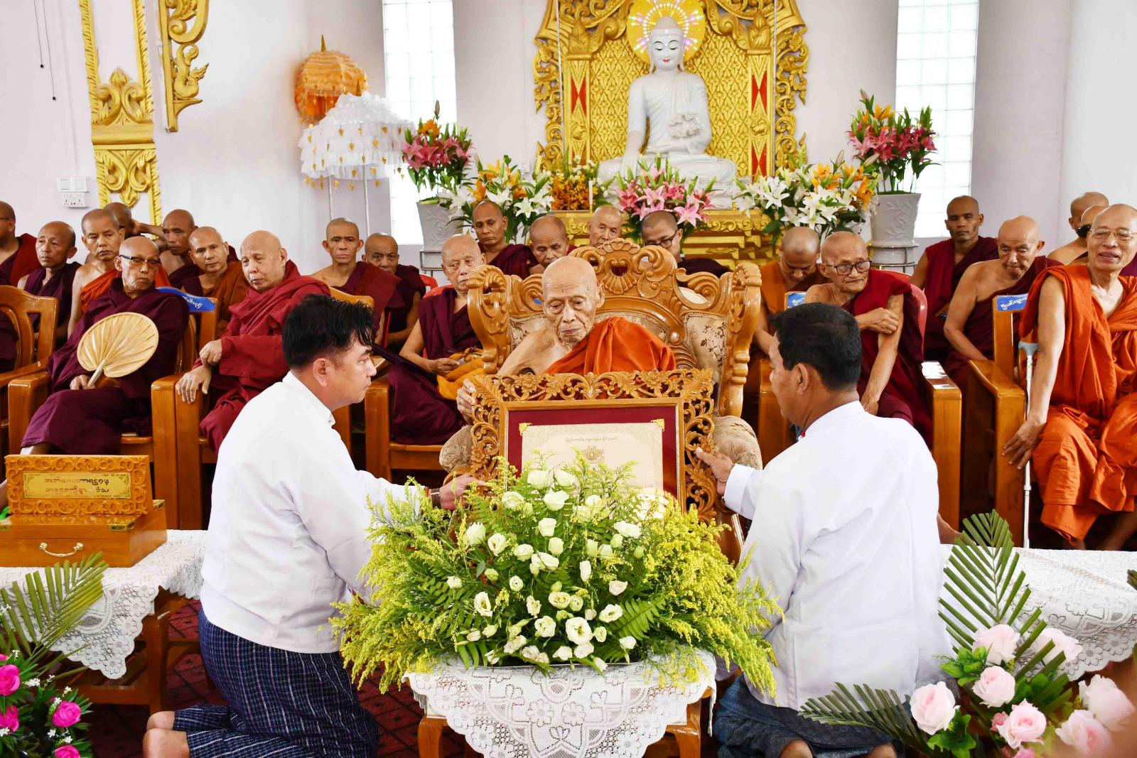 ၂၀၂၃ ခုနှစ် သာသနာတော်ဆိုင်ရာ အဘိဓဇမဟာရဋ္ဌဂုရု ဘွဲ့တံဆိပ်တော်ရ ရခိုင်ပြည်နယ်၊ ကျောက်ဖြူမြို့၊ နဂါးကျောင်း ပရိယတ္တိစာသင်တိုက် ဦးစီးပဓာန နာယက နိုင်ငံတော်ဩဝါဒစရိယ အဂ္ဂမဟာပဏ္ဍိတ အဂ္ဂမဟာဂန္တဝါစကပဏ္ဍိတ ဘဒ္ဒန္တစက္ကိန္ဒာဘိဝံသ ဆရာတော်ကြီးအား ဂုဏ်ပြုပွဲ အခမ်းအနားကို ယမန်နေ့ နံနက်ပိုင်းက ကျောက်ဖြူမြို့၊ အနောက်ပိုင်းရပ်ကွက်၊ နဂါးကျောင်း ပရိယတ္တိစာ သင်တိုက်ရှိ သီရီသုခရတနာဓမ္မာရုံတွင် ပြုလုပ်သည်။