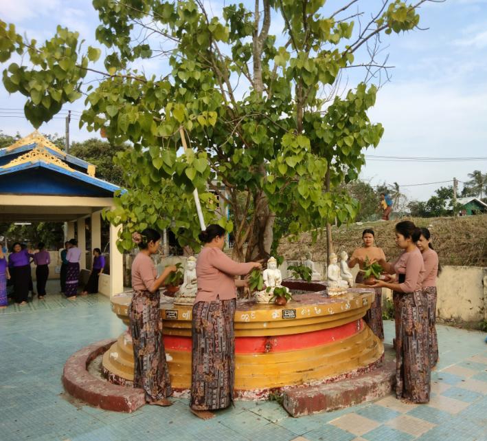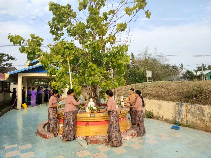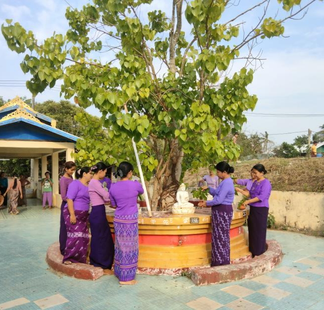 ရှေးဦးစွာ ပေါက်တောမြို့နယ် မိခင်နှင့်ကလေးစောင့်ရှောက်ရေးအသင်းဥက္ကဋ္ဌ ဒေါ်မသန်းစောနှင့် အဖွဲ့ဝင်များ၊ မြို့နယ်အမျိုးသမီးရေးရာအဖွဲ့ဝင်များ၊ မြို့နယ်မိသားစုစည်းရုံးရေးနှင့် စည်းကမ်းထိန်းသိမ်းရေးကော်မတီဝင်များ၊ ရပ်ကွက်နေပြည်သူများက ဘဝမ်းချောင်းဝစုရပ်ကွက် ဘုန်းတော်ကြီးကျောင်းဝင်းအတွင်းရှိ မဟာဗောဓိညောင်ပင်ပတ်ဝန်းကျင်ရှိ တံမြက် စည်းလှည်းခြင်း၊ ဘုရားဆင်ထုတော်များအား ရေသပ္ပယ်ပူဇော်ခြင်း၊ ပန်း၊ရေချမ်း၊ဆီးမီးများ ကပ်လှူပူဇော်ပြီး မဟာဗောဓိညောင်ပင်အား ညောင်ရေသွန်းလောင်းပူဇော်ခဲ့ကြကြောင်း သိရသည်။