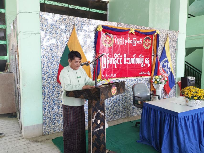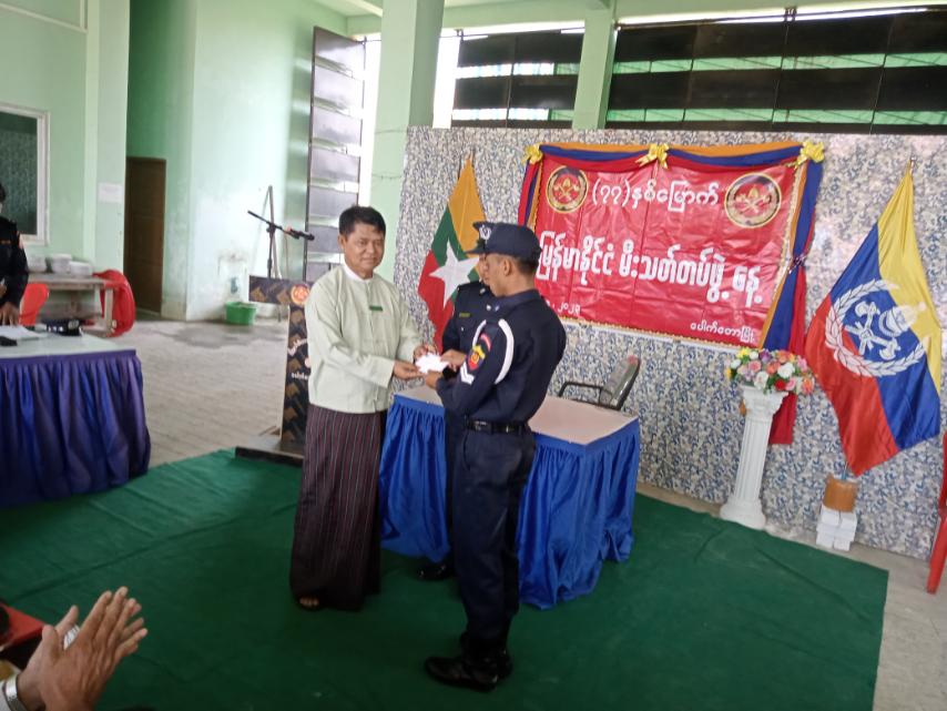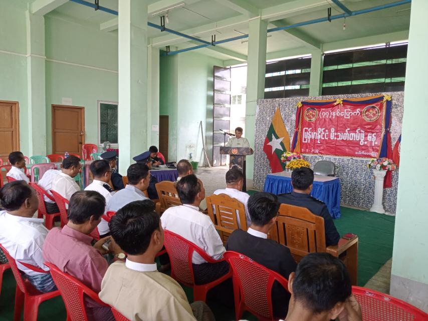 ရှေးဦးစွာ ပြည်ထဲရေးဝန်ကြီးဌာန၊ပြည်ထောင်စုဝန်ကြီး၊ဒုတိယဗိုလ်ချုပ်ကြီး စိုးထွဋ်ထံမှပေးပို့သော (၇၇)နှစ်မြောက် မြန်မာနိုင်ငံမီးသတ်တပ်ဖွဲ့နေ့ သဝဏ်လွှာအား မြို့နယ်စီမံအုပ်ချုပ်ရေးအဖွဲ့ ဥက္ကဋ္ဌ ဦးကျန်အေးက ဖတ်ကြားပေးသည်။