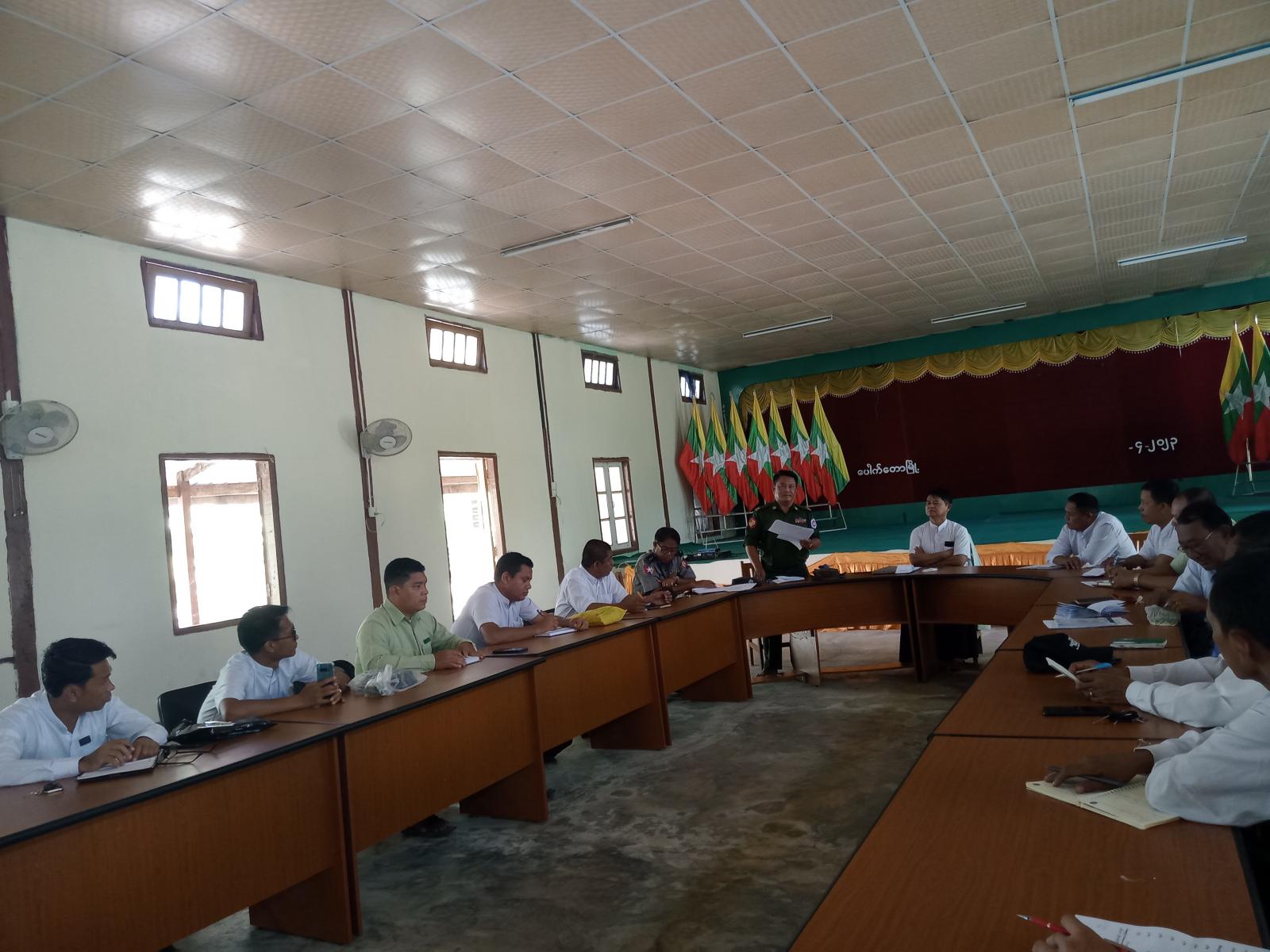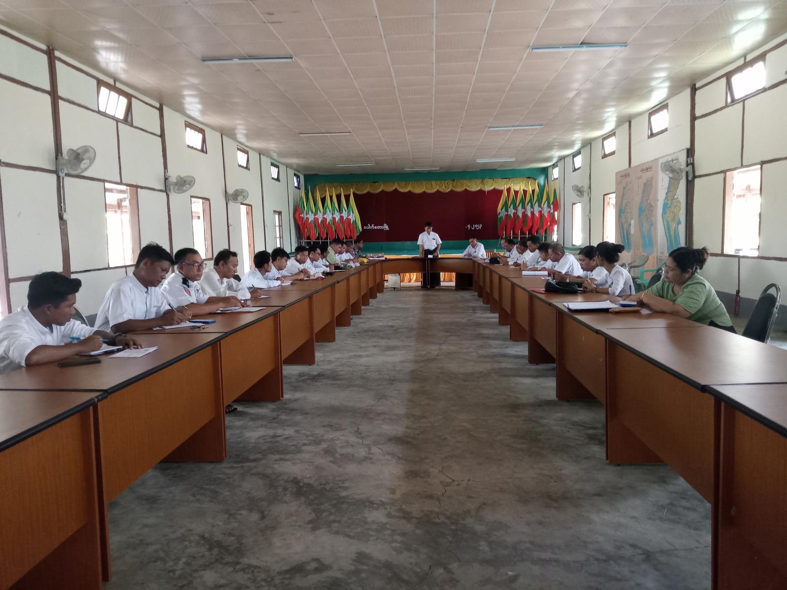 ရှေးဦးစွာ မြို့နယ်စီမံအုပ်ချုပ်ရေးအဖွဲ့ဥက္ကဋ္ဌ ဦးကျန်အေးက ဘင်္ဂလားပင်လယ်အော် အရှေ့တောင်ပိုင်း၌ မေလ(၇)ရက်နေ့တွင် လေဖိအားနည်းရပ်ဝန်း (Law Pressure Area) တစ်ခုဖြစ်ပေါ်နိုင်ပြီး အဆိုပါ လေဖိအားနည်းရပ်ဝန်းသည် ပိုမိုအားကောင်းလာနိုင်ကာ မေ(၈)ရက်နေ့တွင် မုန်တိုင်းငယ်(Depression)အဖြစ်သို့ ရောက်ရှိနိုင်ပြီး မြောက်ဘက်သို့ ဆက်လက်ရွေ့လျားနိုင်ကာ ဘင်္ဂလားပင်လယ်အော်အလယ်ပပိုင်း၌ ဆိုင်ကလုန်းမုန်တိုင်းအဖြစ်သို့ အားကောင်းလာနိုင်သော အခြေအနေများကြောင့် မိမိတို့မြို့နယ်အနေဖြင့် မုန်တိုင်းအန္တရာယ် ကျရောက်ပါက ကူညီကယ်ဆယ်ရေးလုပ်ငန်းများကို အချိန်နှင့်တစ်ပြေးညီ တုန့်ပြန်ဆောင်ရွက်နိုင်ရေးအတွက် သက်ဆိုင်ရာ ဌာနများအလိုက် ဖွဲ့စည်းထားသော လုပ်ငန်းကော်မတီများအနေဖြင့် စုပေါင်းဆောင်ရွက်ကြရမည်ဖြစ်ကြောင်းနှင့် မုန်တိုင်းနှင့် ပတ်သက်သည့် သတင်းအချက်အလက်များကို ပြည်သူများသို့ အချိန်နှင့်တစ်ပြေးညီ အသိပေးပြန်ကြားနိုင်ရေးတို့ကို ဆောင်ရွက်ရန်လိုအပ်ကြောင်း၊ မြို့နယ်အတွင်း ရေအခက်အခဲရှိရာ နေရာများကို ရေရရှိရေးအတွက် ဆောင်ရွက်ရမည့်ကိစ္စရပ်များ၊ နိုင်ငံ့စီးပွါးဖွံ့ဖြိုးတိုးတက်ရေးအတွက် ဌာနဆိုင်ရာ အသီးသီးမှ ချေးငွေလုပ်ငန်းကြီးကြပ်ရေးကော်မတီဝင်များအနေဖြင့် ဆောင်ရွက်ကြရမည့် ကိစ္စရပ်များ၊ လက်ရှိဆောင်ရွက်လျက်ရှိသော တစ်လမ်းမောင်းစနစ် ရှေ့ဆက်ဆောင်ရွက်ရမည့် ကိစ္စရပ်များ၊ ဌာနဆိုင်ရာများနှင့် ပြည်သူများကို ကိုဗစ်-၁၉ ရောဂါကာကွယ်ဆေး Booster Doses ထိုးနှံရေးကိစ္စရပ်များ၊ ဌာနဆိုင်ရာ အကြီးအကဲများအနေဖြင့် မိမိတို့ဌာန လုပ်ငန်းဆောင်ရွက်မှုများကို ရှင်းလင်းတင်ပြပေးကြရန် ဆွေးနွေးပြောကြားသည်။