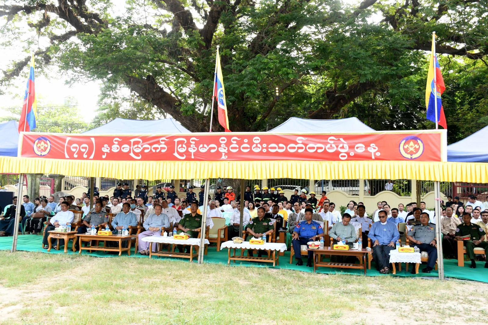 အခမ်းအနားတွင် ပြည်နယ်ဝန်ကြီးချုပ်ကိုယ်စား ပြည်နယ်လုံခြုံရေးနှင့် နယ်စပ်ရေးရာဝန်ကြီး ဗိုလ်မှူးကြီး ကျော်သူရ က (၇၇)နှစ်မြောက် မြန်မာနိုင်ငံမီးသတ် တပ်ဖွဲ့နေ့ မိန့်ခွန်းပြောကြားသည်။ ထို့နောက် တိုင်းမှူးနှင့် ဧည့်ပရိသတ်များက ခန်းမအတွင်း ခင်းကျင်းပြသထားသော ရှာဖွေကယ်ဆယ် ရေးပစ္စည်းများ၊ မီးသတ်တပ်ဖွဲ့၏ ပြည်သူ့အကျိုးပြု လုပ်ငန်းဆောင်ရွက်မှု မှတ်တမ်းဓာတ်ပုံများ၊ ရှာဖွေကယ်ဆယ်ရေး ဆောင်ရွက်မှု မှတ်တမ်းဓာတ်ပုံပြခန်းများအား လှည့်လည်ကြည့်ရှုအားပေးကြ သည်။