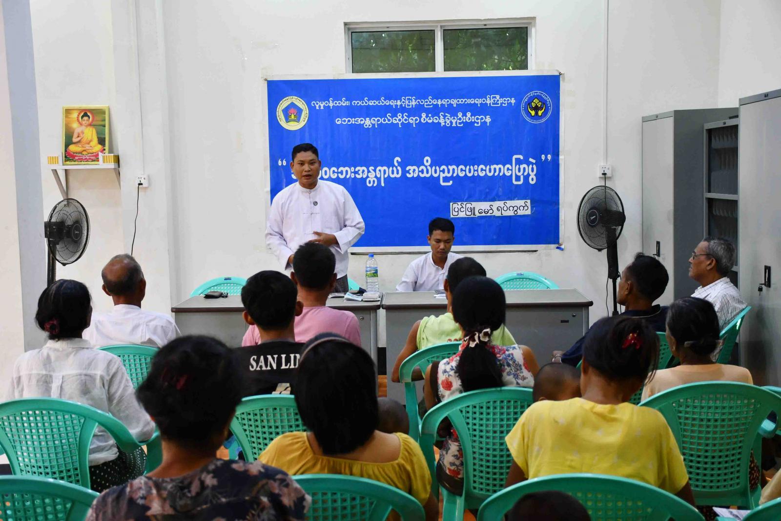 ဟောပြောပွဲတွင် ခရိုင်ဘေးအန္တရာယ်ဆိုင်ရာစီမံခန့်ခွဲမှုဦးစီးဌာနမှ ဦးစီးမှူးဦးချမ်းမြေ့ထွန်းက မိုးဦးကာလ မေလ(၇)ရက် နေ့တွင် လေဖိအားနည်းရပ်ဝန်း(Law Pressure Area)တစ်ခုဖြစ်ပေါ်နိုင်ပြီး မေ(၈)ရက်နေ့တွင် မုန်တိုင်းငယ် (Depression)အဖြစ်သို့ ရောက်ရှိနိုင်ကြောင်း၊ လူမှုကွန်ရက်များတွင်လည်း မေ ၁၂ ရက်နေ့တွင် ဘင်္ဂလားပင်လယ်အော် အရှေ့တောင်ပိုင်းတွင် နာဂစ်ကဲ့သို့မုန်တိုင်းကြီးများ ကျရောက်နိုင်ကြောင်း ခန့်မှန်းချက်များ ထွက်ပေါ်နေသဖြင့် ပင်လယ်၊ ချောင်းကမ်းနားရှိ ရပ်ကွက်နေပြည်သူများအနေဖြင့် မုန်တိုင်းဘေးအန္တရာယ်ကြောင့် ဆိုးကျိုးများဖြစ်သည့် သစ်ပင်၊ အဆောက်အဦများပြိုလဲခြင်း၊ ရေလွှမ်းမိုးခြင်းနှင့် လေတွင်လွင့်ပါလာသော ပစ္စည်းများကြောင့် သေကြေပျက်စီး နိုင်ကြောင်း၊ ထူးကဲဒီရေ/ဒီလှိုင်းများတက်လာခြင်းကြောင့် ဆားငန်ရေဝင်၍ ရေတွင်း၊ ရေကန်များနှင့် စိုက်ပျိုးမြေများ ပျက်စီးပြီး မသန့်ရှင်းသောရေကြောင့် ရောဂါပိုးများပြန့်ပွားကာ ဝမ်းရောဂါဖြစ်ပွားနိုင်သဖြင့် မုန်တိုင်းမတိုက်မီ ကြိုတင်ပြင်ဆင်ရန်အချက်များ၊ မုန်တိုင်းသတိပေးချက်ရလျှင် ဆောင်ရွက်ရန်အချက်များ၊ မုန်တိုင်းဖြစ်ပေါ် နေချိန်တွင် ရှောင်ရှားသင့်သည့်အချက်များအား အကျယ်တဝင့် ရှင်းလင်းဟောပြောသည်။ ထို့နောက် ပြန်ကြားရေးနှင့်ပြည်သူ့ဆက်ဆံရေးဦးစီးဌာနမှ ဦးစီးအရာရှိ ဦးသိန်းထွန်းအောင်က သက်ဆိုင်ရာအစိုးရဌာနမှ ထုတ်ပြန်ကြေညာသည့် မိုးလေဝသသတင်းများကို စဉ်ဆက်မပြတ်နားထောင်ပြီး အကြံပြုချက်များကို လိုက်နာရမည်ဖြစ်ကြောင်း၊ အခြားသူများကိုလည်း သိရှိစေရန်ဖြန့်ဝေပေးရမည်ဖြစ်ကြောင်းနှင့် မုန်တိုင်းများ၏ အန္တရာယ်ကို နားလည်သဘောပေါက်လွယ်စေမည့် အရောင်ဖြင့်သတိပေးစနစ်များကို ရပ်ကွက်နေပြည်သူများအား အသိပညာပေးဟောပြောပြီး သဘာဝဘေးအသိပညာပေး လက်ကမ်းစာစောင်များကို အခမဲ့ဖြန့်ဝေပေးခဲ့သည်။