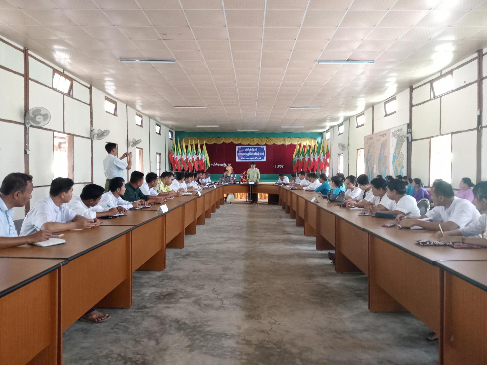 ရှေးဦးစွာ မြို့နယ်သဘာဝဘေးအန္တရာယ်ဆိုင်ရာ စီမံခန့်ခွဲမှုကော်မတီဥက္ကဋ္ဌ ဦးကျန်အေးက ဘင်္ဂလားပင်လယ်အော်အရှေ့တောင်ပိုင်းတွင် (၈.၅.၂၀၂၃) ရက်နေ့၌ လေဖိအားနည်းရပ်ဝန်း (Low Pressure Area) တစ်ခုဖြစ်ပေါ်နိုင်သဖြင့် အဆိုပါလေဖိအားနည်းရပ်ဝန်း (Low Pressure Area)သည် ပိုမိုအားကောင်းလာနိုင်ပြီး၊ (၉.၅.၂၀၂၃)ရက်နေ့တွင် မုန်တိုင်းငယ်(Depression)အဖြစ်သို့ ရောက်ရှိနိုင်ကာ၊ မြောက်ဘက်သို့ ဆက်လက်ရွေ့လျားနိုင်ပြီး (၁၀.၅.၂၀၂၃) ရက်နေ့တွင် ဘင်္ဂလားပင်လယ်အော် အရှေ့တောင်ပိုင်း၌ ဆိုင်ကလုန်းမုန်တိုင်း (Cyclonic Storm)အဖြစ်သို့ အားကောင်းလာနိုင်သည်ဟု မိုးလေဝသနှင့်ဇလဗေဒညွှန်ကြားမှုဦးစီးဌာန (နေပြည်တော်) ထုတ်ပြန်ချက်များအရ မိမိတို့မြို့နယ်အတွင်းရှိ ဘေးလွှတ်ရာနေရာများ သတ်မှတ်ရှာဖွေထားရန်၊ ရေလုပ်ငန်းလုပ်ကိုင်နေသူများကို ကြိုတင်အသိပေးထားရှိရန်၊ အရေးပေါ်ကူညီကယ်ဆယ်ရေး ယာဉ်များထားရှိရန်၊ ရေကြောင်းသတိပေးချက်များကို အချိန်နှင့်တစ်ပြေးညီ ဖြန့်ဝေခြင်းများဆောင်ရွက်ရန်၊ အရေးပေါ်ဆေးကုခန်းများ ဖွင့်လှစ်နိုင်ရေးဆောင်ရွက်ထားရန်၊ Cyclone Shelter များတွင် ခိုလှုံနိုင်မည့်လူအင်အားများ ထားရှိမှုအခြေအနေနှင့် ပြင်ဆင်မှုများ၊ စားနပ်ရိက္ခာ၊ ရေနှင့်အရေးပေါ် ကူညီကယ်ဆယ်ရေးပစ္စည်းများကို အဆင့်သင့်ထားရှိရန်အတွက် မြို့နယ်အဆင့်သဘာ၀ဘေးအန္တရာယ် ကြိုတင်ကာကွယ်ရေးကြီးကြပ်မှုကော်မတီ နှင့်ဆပ်ကော်မတီ များအလိုက် ဆောင်ရွက်ရမည့်ကိစ္စရပ်များ၊ သဘာဝဘေးအန္တရာယ်ကျရောက်လာပါက မိမိတို့ကော်မတီဝင်များအလိုက် စနစ်တကျ ကူညီကယ်ဆယ်ရေးလုပ်ငန်းများကို လုပ်ကိုင်ကြရမည်ဖြစ်ကြောင်း၊ NGO/INGOsအဖွဲ့အစည်းများနှင့် ချိတ်ဆက်ပူးပေါင်းကာ ထိခိုက်ဆုံးရှုံးမှုအနည်းဆုံးနှင့် အချိန်နှင့်တစ်ပြေးညီ အထိရောက်ဆုံး ကာကွယ်တာဆီးနိုင်ရေး အစွမ်းကုန်အားထုတ်ကြိုးပမ်း ဆောင်ရွက်သွားရမည်ဖြစ်ကြောင်း ဆွေးနွေးပြောကြားသည်။