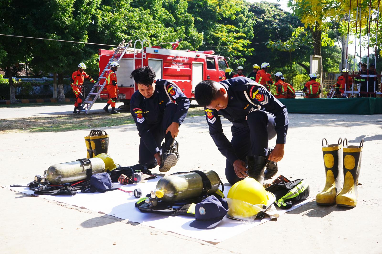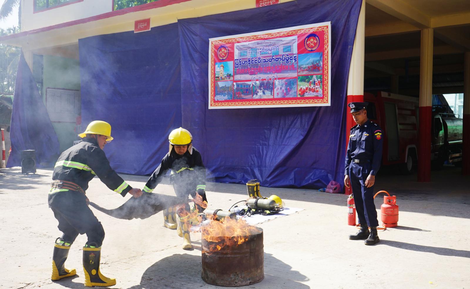 ထို့နောက် ဆုရရှိသော မီးသတ်တပ်ဖွဲ့ဝင်များအား မြို့နယ်မီးသတ်ဦးစီးမှူး ထွန်းရွှေခိုင်က ဆုများအသီးသီး ချီးမြှင့်ပေးအပ်ခဲ့ပြီး ခရိုင်မီးသတ်ဦးစီးမှူးရုံးမှ ဒုတိယမီးသတ်ဦးစီးမှူး ဇော်ဦးလှိုင်ဦးဆောင်၍ တပ်ဖွဲ့ဝင်များက မီးလောင်ကျွမ်းမှု အမျိုးမျိုးအား မီးငြှိမ်းသတ် သရုပ်ပြခြင်း၊ သဘာဝဘေးအန္တရာယ်များ ဖြစ်ပွားလာပါက အလျင်အမြန် တုံ့ပြန်နိုင်ရေးနှင့် အခြားသော ဘေးန္တရာယ်များကျရောက်သည့်အခါ အရေးပေါ်ရှာဖွေ ကယ်ဆယ်နိုင်ရေး လက်တွေ့ လေကျင့် စေခြင်းများကို သရုပ်ပြဆောင်ရွက်ခဲ့ကြကြောင်း သိရသည်။