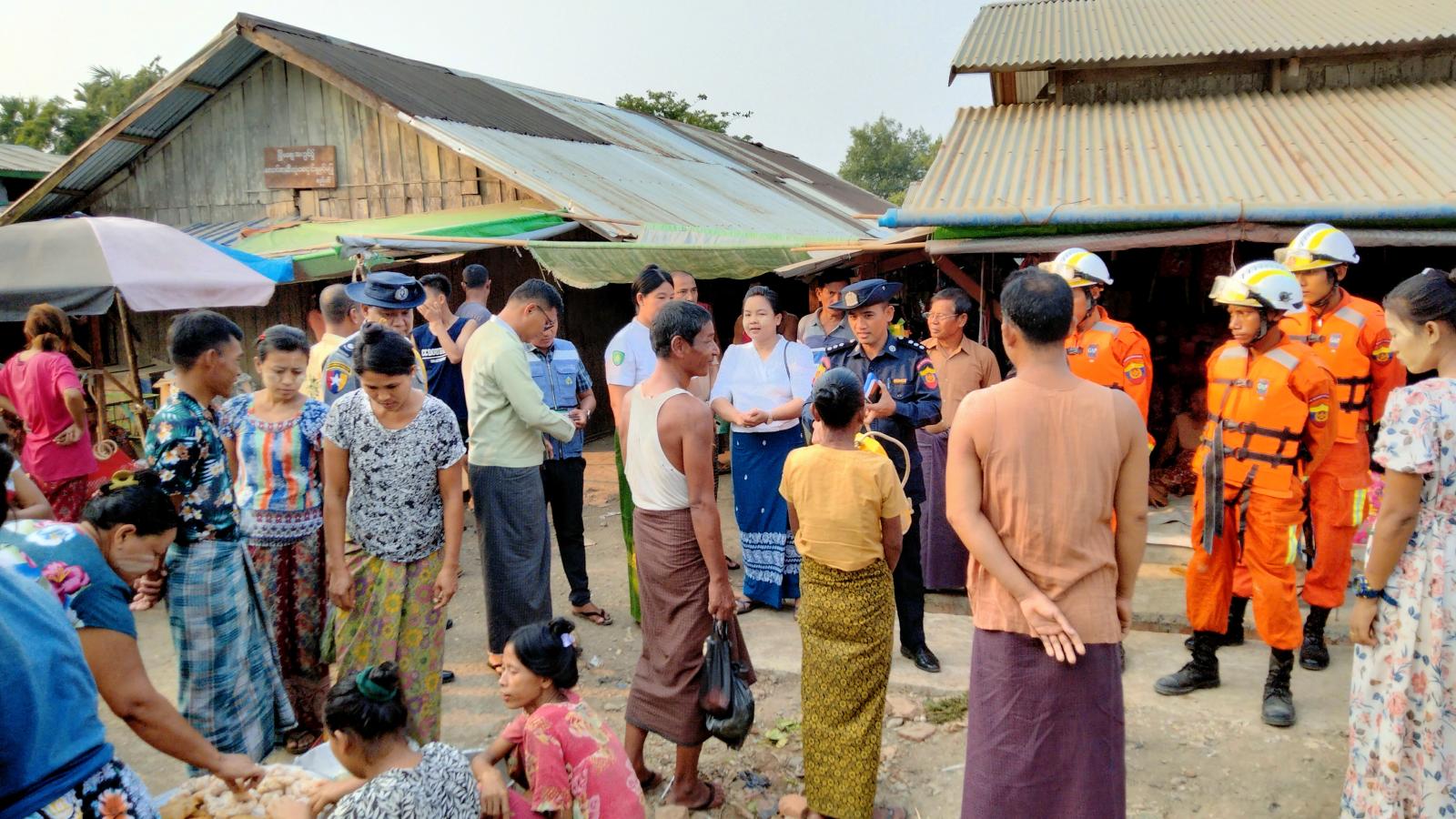 ထို့နောက် မြို့နယ်မီးသတ်ဦးစီးမှူးဦးလူမော်က မိမိတို့ဌာနဆိုင်ရာများသည် ပြည်သူများကို ဝန်ဆောင်မှုပေးနေကြသူများ ဖြစ်ကြောင်းသက်ကြီးရွယ်အိုများ၊ ကလေးသူငယ်များနှင့် ကိုယ်ဝန် ဆောင်မိခင်များအား ကူညီရွှေ့ပြောင်းပေးခြင်း၊ ရှာဖွေကယ်ဆယ်ရေးလုပ်ငန်းများ ဆောင်ရွက် ခြင်းစသည့်တိုကို ဆောင်ရွက်လျက်ရှိကြောင်း ပြောကြားပြီးမီးသတ်တပ်ဖွဲ့ဝင်များနှင့် ဒေသခံပြည်သူများက မုန်တိုင်းဘေးအန္တရာယ်သဏ္ဍာန်တူ ဇာတ်တိုက်လေ့ကျင့်ကြသည်။ ယခုလို ဇာတ်တိုက်လေ့ကျင့်သကဲ့သို့ မုန်တိုင်းဖြစ်ပေါ်လာနိုင်သည့် အရောင်အဆင့်အလိုက် ဆက်လက် လုပ်ဆောင်သွားကြရမည် ဖြစ်ကြောင်း၊ ရပ်ကွက်နေပြည်သူများနှင့် ထိတွေ့ပြီး ကူညီကယ်ရေး လုပ် ဆောင်နိုင်ရန် ပြင်ဆင်ဆောင်ရွက်လျက်ရှိကြောင်း၊ မိဘပြည်သူများအနေနှင့်လည်း မိမိတို့ ကူညီဆောင်ရွက်နိုင်မည့် အခြေအနေများကို ကူညီဆောင်ရွက်ပေးကြပါ ရန်မုန်တိုင်းစတင် ဖြစ်ပေါ်လာနိုင်သည့် အချိန်မှစတင်ပြီး ၄ ရက်တာ ကာလအတွင်း အထူးဂရုပြု နေထိုင်ကြရန်နှင့် မြို့နယ် သဘာဝဘေးအန္တရာယ်ဆိုင်ရာ စီမံခန့်ခွဲမှုအဖွဲ့အနေဖြင့် သဘာဝဘေး မုန်တိုင်းအန္တရာယ်