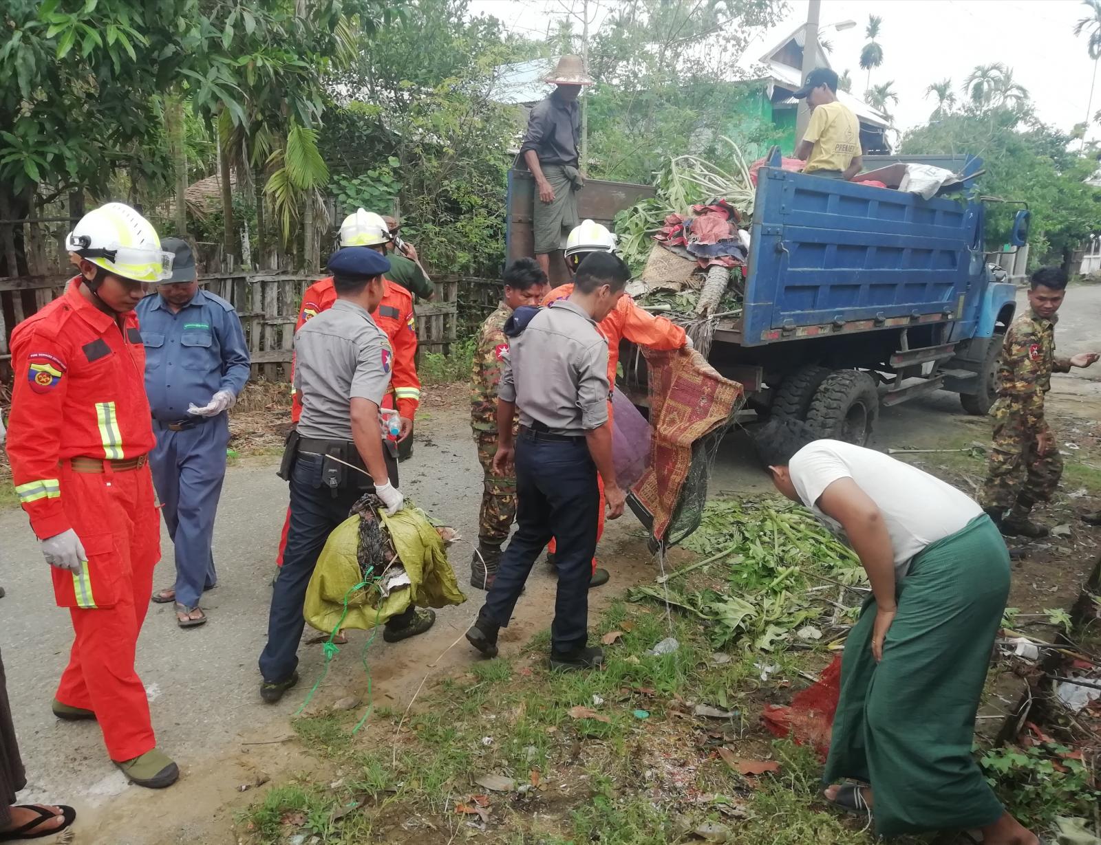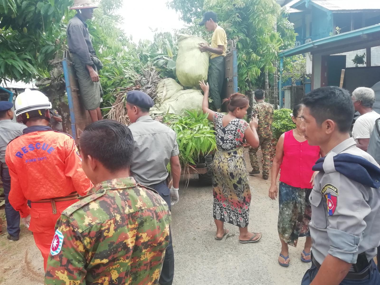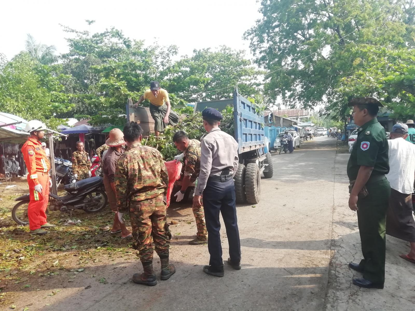 ထိုသို့ ဆောင်ရွက်ရာတွင် မြို့နယ်စီမံအုပ်ချုပ်ရေးအဖွဲ့၊(ခေတ္တ)ဥက္ကဋ္ဌ ဗိုလ်မှူးသူရိန်စိုး ဦးဆောင်မှုဖြင့် မြို့နယ် ဌာနဆိုင်ရာနှင့် ဝန်ထမ်းများ၊ တပ်မတော် တပ်ဖွဲ့ဝင်များ၊မြို့နယ် မီးသတ်တပ်ဖွဲ့ဝင်များ၊ မြန်မာနိုင်ငံရဲတပ်ဖွဲ့ဝင်များ၊ ပြည်သူများပါဝင်သော ပူးပေါင်းအဖွဲ့သည် စာတိုက်အနီးတွင် စုရပ်နေရာ သတ်မှတ်ပြီး မြို့နယ် စည်ပင်သာယာရေးအဖွဲ့ပိုင် ကားဖြင့် လှည့်လည်၍ စာတိုက်လမ်း၊ ဦးဥတ္တမလမ်း၊သင်္ဘောဆိပ်လမ်း၊ မြို့သစ်ရပ်ကွက်ရှိ စည်ပင်သာယာလမ်းတို့တွင် ပျံ့ကြဲနေသော သစ်ကိုင်း၊ သစ်ခက်၊သစ်ရွက်၊အမှိုက်များကို လှည့် လည်သိမ်းဆည်းခြင်း၊ မြို့မ စည်ပင်သာယာစျေးအတွင်း လဲကျနေသော သစ်ပင်၊ သစ်ကိုင်း၊သစ်ခက်များကို ခုတ်ထွင် ရှင်းလင်းခြင်းများ ဆောင်ရွက်ပြီး အမှိုက်များကို စနစ်တကျ စွန့်ပစ်ခဲ့ကြသည်။