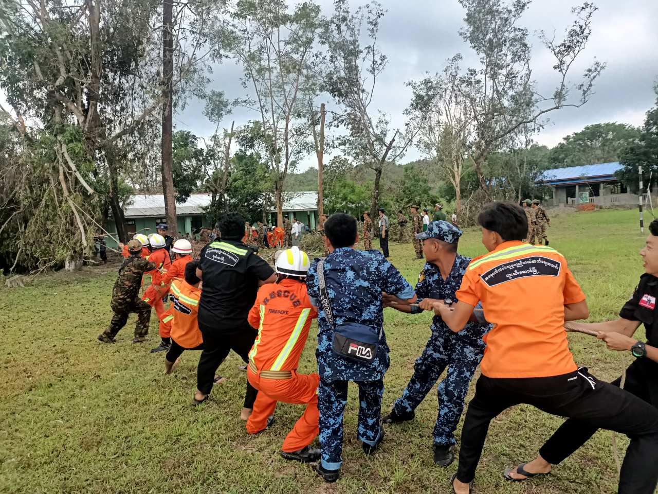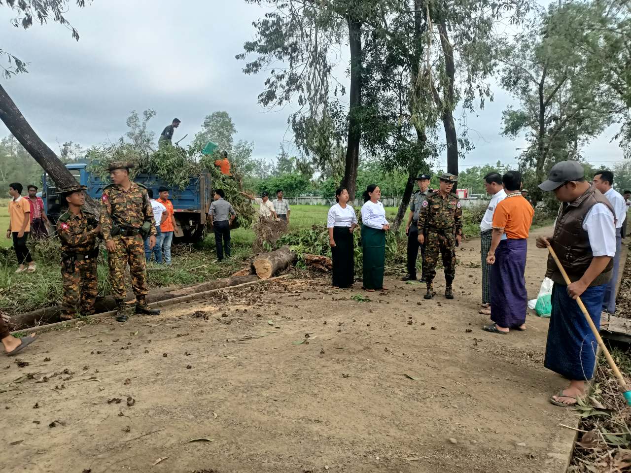 ထိုသို့စုပေါင်းသန့်ရှင်းရေးရှင်းလင်းဆောင်ရွက်ရာတွင် မြို့နယ်အဆင့်ဌာနဆိုင်ရာ ဝန်ထမ်းများ၊ တပ်မတော်တပ်ဖွဲ့ဝင်များ၊ မြို့နယ်မီးသတ်တပ်ဖွဲ့ဝင်များ၊ မြန်မာနိုင်ငံရဲတပ်ဖွဲ့ဝင်များ၊ အမှတ်(၃) နယ်ခြားစောင့်ရဲတပ်ဖွဲ့ဝင်များ၊လူမှုရေးအသင်း အဖွဲ့ (WDAB၊ ရွှေဘူးသီး)အသင်းအဖွဲ့များ အင်အား (၂၀၀)ဦး ပူးပေါင်းအဖွဲ့သည် အ.ထ.က လက်ဝဲဒက်ပုဇွန်ချောင်းကျောင်း၊ ဂန္ဓမာကျေးရွာ အခြေခံပညာ မူလတန်းကျောင်း၊ အမှတ်(၁) အခြေခံပညာအထက်တန်းကျောင်းတို့၌ မိုခါမုန်တိုင်းကြောင်းလဲကျနေသော သစ်ပင်၊ သစ်ကိုင်း၊ သစ်ခက်အမှိုက်များကိုခုတ်ထွင် ရှင်းလင်းခြင်းများဆောင်ရွက်ပြီး အမှိုက်သိမ်းကားများဖြင့် အမှိုက်များကို စနစ်တကျစွန့်ပစ်ခဲ့ကြသည်။