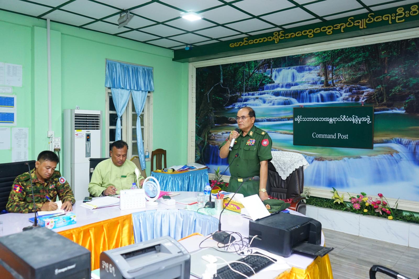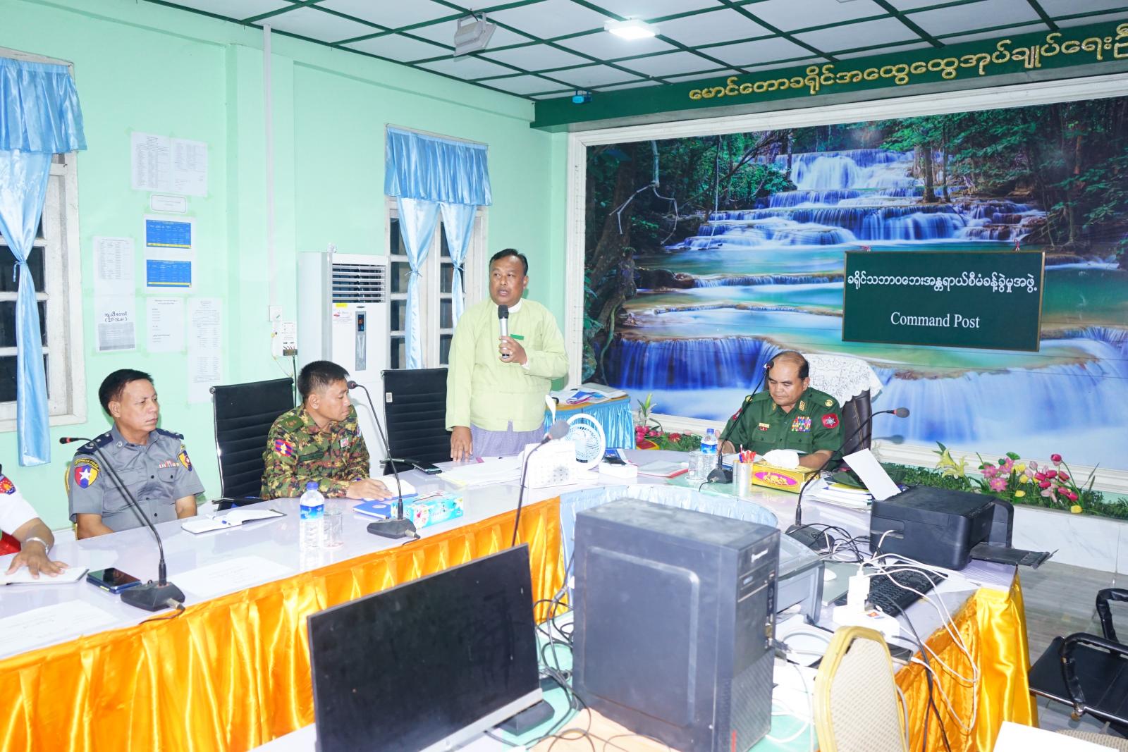 ယင်းနောက် ပြန်လည်ထူထောင်ရေးဆောင်ရွက်နိုင်ရေးအတွက် ရောက်ရှိနေသော ဗိုလ်မှူးချုပ် တင်ဆွေသည် ညနေပိုင်းခရိုင်အထွေထွေအုပ်ချုပ်ရေးဦးစီးဌာနရုံးခန်းမ၌ ခရိုင်/မြို့နယ်အဆင့် ဌာနဆိုင်ရာများနှင့်တွေ့ဆုံရာ မုန်တိုင်းဘေးကြောင့် လေဘေးသင့်ခဲ့သော ကျေးရွာများတွင် စာရင်းများ ကောက်ယူရာတွင် ပျက်စီးဆုံးရှုံးမှုအား စနစ်တကျ စာရင်းကောက်ယူပြီးစာရင်း၊ ဇယားများအား တိကျမြန်ဆန် မှန်ကန်စေရန်လိုအပ်ပါကြောင်း၊ ဇွန်လတွင်လည်း အခြေခံပညာကျောင်းများ ဖွင့်လှစ်မည့် ဖြစ်သည့်အတွက် ပျက်စီးဆုံးရှုံးခဲ့သော ကျောင်းများအား အမြန်ဆုံး ပြုပြင်ဆောင်ရွက်ရန်လိုကြောင်း စသည့်တို့ကို မှာကြားခဲ့သည်။ ဆက်လက်၍ ခရိုင်စီမံအုပ်ချုပ်ရေးအဖွဲ့ဉက္ကဋ္ဌ ဦးနေဦးက ကျေးရွာများအတွင်း မုန်တိုင်းဘေးကြောင့် လေဘေးသင့်ခဲ့သော ကျေးရွာများတွင် ယနေ့အထိ ပျက်စီးဆုံးရှုံးမှု စာရင်းများကောက်ခံပြီးစီးမှု အခြေအနေများ၊ စာရင်းဇယားမှန်ကန်မှု ရှိစေရေးအတွက် ဌာနဆိုင်ရာများအလိုက် စာရင်းကောက်ခံနေမှုများ၊ ပျက်စီးနေသည့် အခြေခံပညာကျောင်းများအား ပြုပြင်ရန်စီစဉ်ဆောင်ရွက်နေပါကြောင်း၊ မိမိအားပေးအပ်ထားသောတာ၀န်အား ဌာနဆိုင်ရာအနေဖြင့် စနစ်တကျ လိုက်နာစေလိုပါကြောင်း စသည့်တို့ကိုပြောကြားခဲ့ပြီး တက်ရောက်လာကြသော ခရိုင်သဘာ၀ဘေးအန္တရာယ်စီမံခန့်ခွဲမှုအဖွဲ့များက ကော်မတီအလိုက် ပြန်လည်ထူထောင်ရေးကိစ္စများဆောင်ရွက်နေမှု၊ ကျေးရွာများအလိုက် စားရိက္ခာများနှင့် ကယ်ဆယ်ရေးပစ္စည်းများ ထောက်ပံ့ပေးခဲ့မှုများ၊ စာရင်းဇယားကောက်ယူရေး အဖွဲ့များမှ စာရင်းကောက်ယူခဲ့မှု အခြေအနေမျအား ရှင်းလင်းတင်ပြကြရာ တင်ပြဆွေးနွေးချက်များ အပေါ် ဗိုလ်မှူးချုပ်မှ လိုအပ်ချက်များအား ပေါင်းစပ်ညှိနှိုင်းဆောင်ရွက် ပေးခဲ့ကြောင်းသိရသည်။