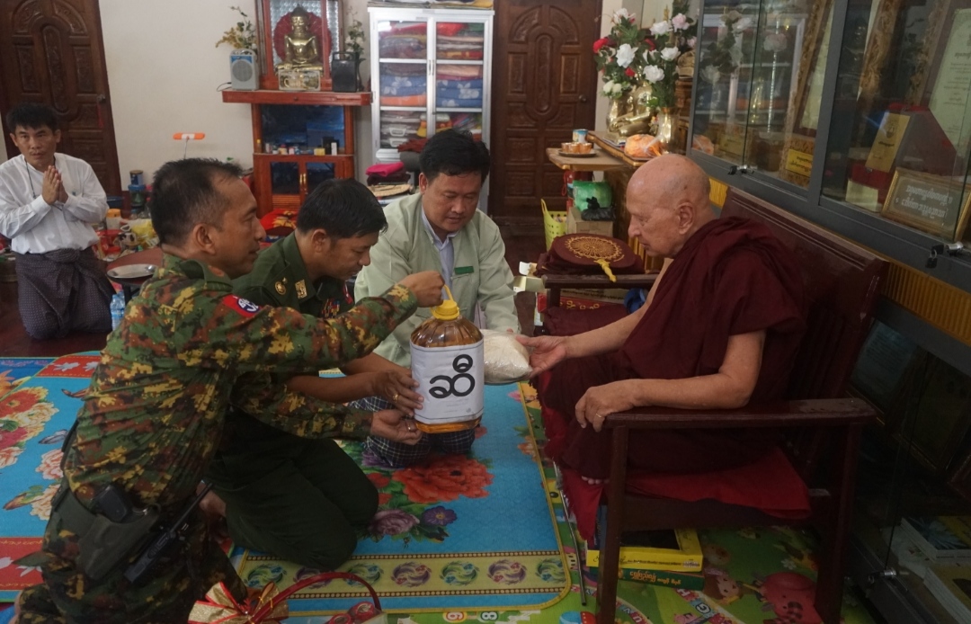 မြောက်ဦးမြို့ပေါ်ရှိ ဘုန်းတော်ကြီး ကျောင်းများအား ဆွမ်းဆန်တော်များနှင့် လှူဖွယ်ဝတ္ထုများ ဆပ်ကပ်လှူဒါန်းရာသို့ ဗိုလ်ချုပ် သောင်းထိုက်ရွှေ၊ နယ်မြေခံတပ်မမှူး၊ ခရိုင်သဘာဝဘေးအန္တရာယ်ဆိုင်ရာစီမံခန့်ခွဲမှုအဖွဲ့ ဥက္ကဋ္ဌခရိုင်အုပ်ချုပ်ရေးမှူး ဦးကောင်းမြတ်နိုင်၊ ခရိုင်စီမံအုပ်ချုပ်ရေးအဖွဲ့ဝင်(၁) ဒုတိယဗိုလ်မှူးကြီး တင်ထူးလှိုင်၊ ခရိုင်စီမံအုပ်ချုပ်ရေးအဖွဲ့ အတွင်းရေးမှူး ဒုတိယ ရဲမှူးကြီးခင်မောင်စိုး၊ မြို့နယ်သဘာဝဘေးအန္တရာယ်ဆိုင်ရာစီမံခန့်ခွဲမှုအဖွဲ့ ဥက္ကဋ္ဌ မြို့နယ် အုပ်ချုပ်ရေးမှူး ဦးစိုးစိုးသက်နှင့်တာဝန်ရှိသူများက ပျက်စီးသွားသည့် ဘုန်းတော်ကြီးကျောင်းများအား ပြန်လည်ပြုပြင်နိုင်ရန်နှင့်ဆွမ်းဆန်များအဆင်ပြေစေရန်အတွက် သွားရောက် ဆပ်ကပ်လှူဒါန်ပေးခဲ့ကြောင်း သိရသည်။
