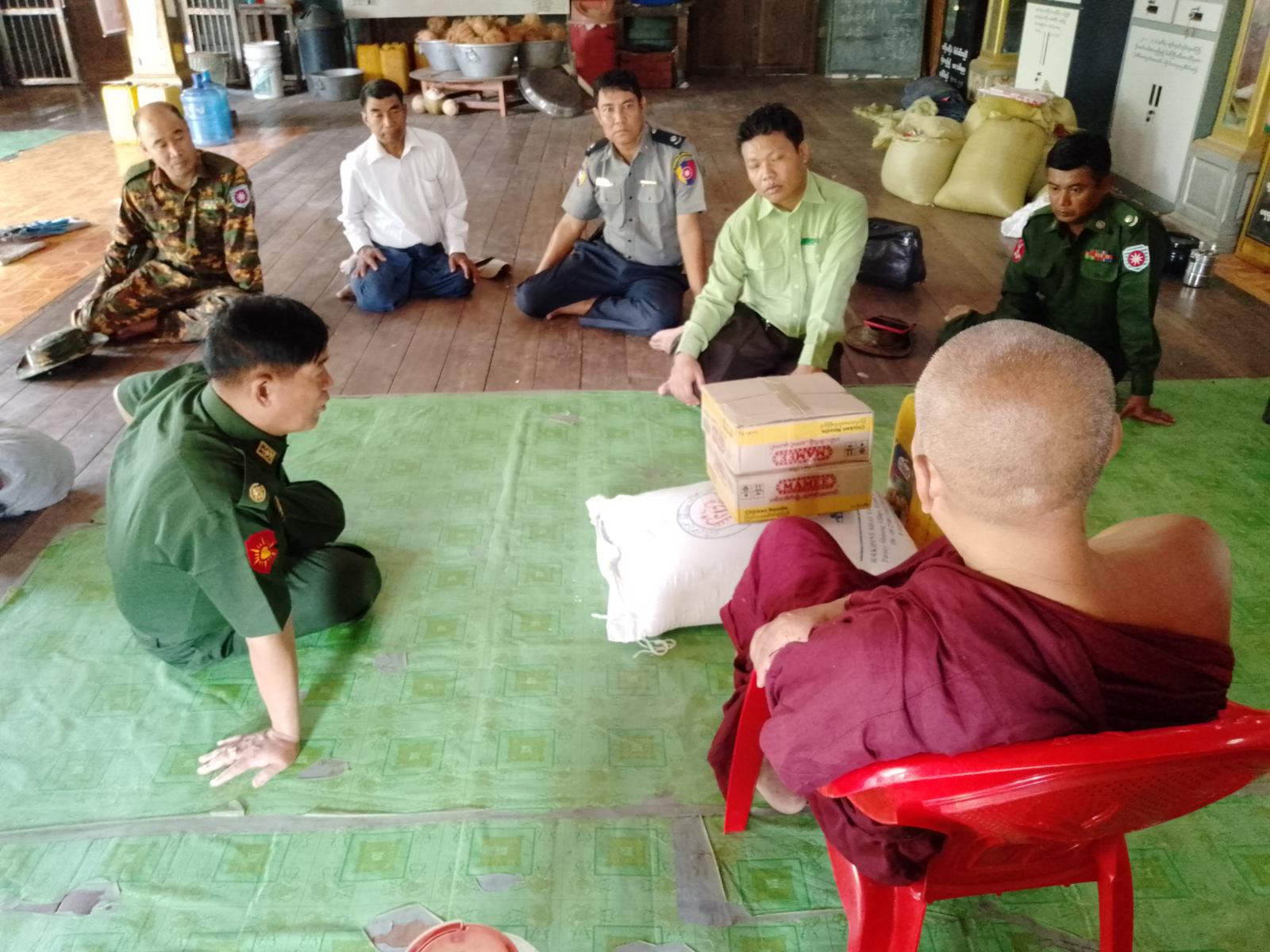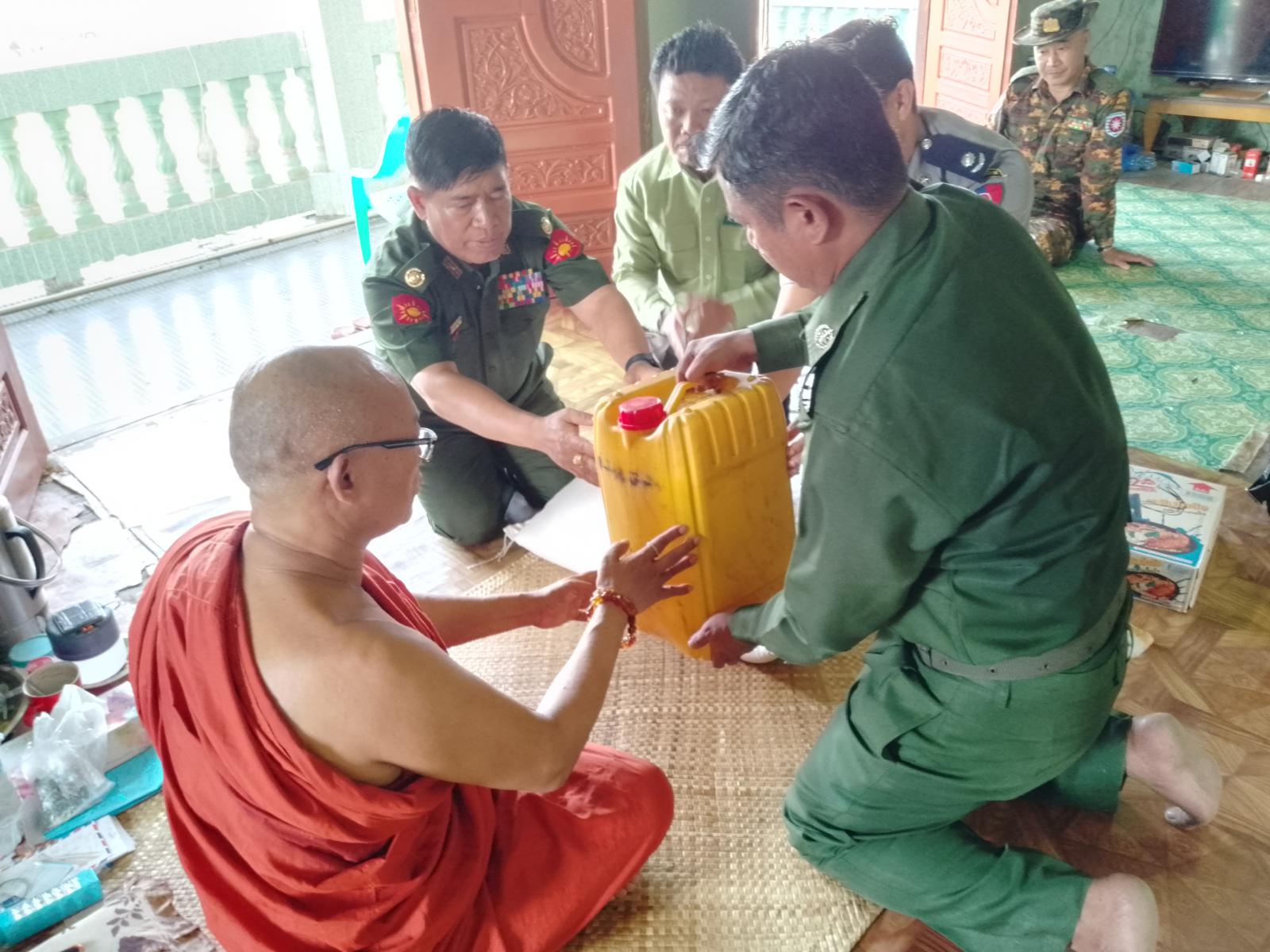 ထို့နောက် မြေပုံမြို့ပေါ်ရှိ လေဘေးခိုလှုံရာစခန်းဖွင့်လှစ်ခဲ့သည့် မြို့မကုသိနာရုံ ပရိယတ္တိစာသင်တိုက်သို့ သွားရောက်ကာ ကျောင်းထိုင် ဆရာတော်ကြီး ဦးရာဇိန္ဒအား ဖူးမြှော်ာ်ပြီး ဆန်၊ ဆီ၊ ခေါက်ဆွဲ ခြောက်များ လှူဒါန်းကာ ဆရာတော်ကြီးထံမှ ဩဝါဒခံယူသည်။ ဆက်လက် ၍ တောင်ကျောင်း ပရိယတ္တိစာသင်တိုက်သို့ သွားရောက်၍ ကျောင်းထိုင်ဆရာတော်ကြီး ဦးသိရောမဏိအား ဖူးမျှော်ပြီး ဆန်၊ ဆီ၊ ခေါက်ဆွဲခြောက်များ လှူဒါန်းကာ ဆရာတော်ကြီးထံမှ ဩဝါဒခံယူသည်။