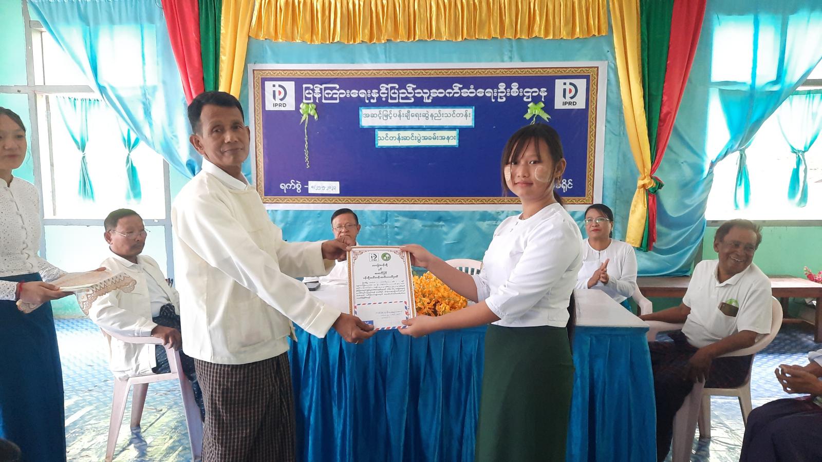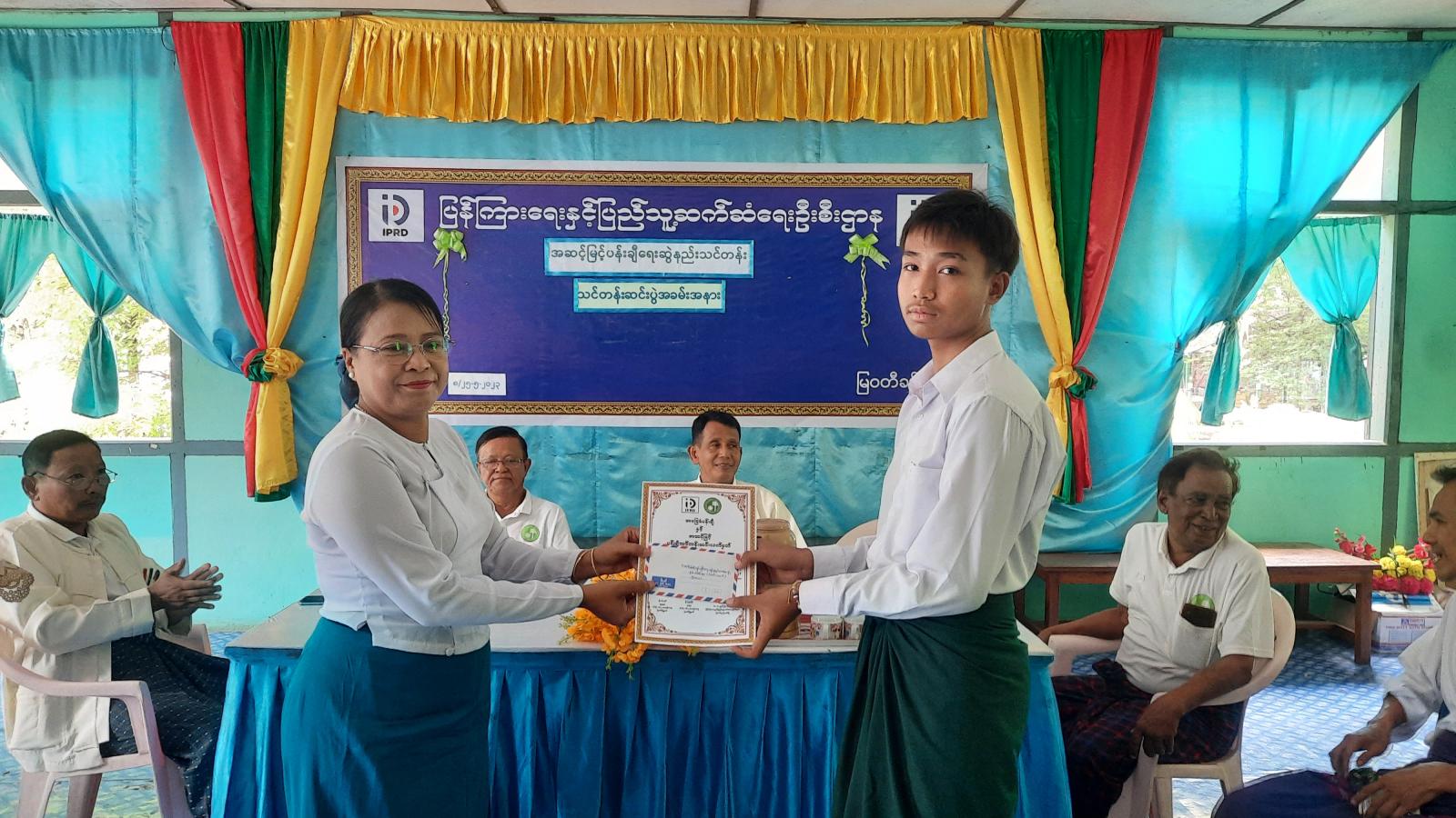 ဆက်လက်၍ မြဝတီခရိုင် ပြန်ကြားရေးနှင့်ပြည်သူ့ဆက်ဆံရေးဦးစီးဌာနမှ ခရိုင်ဦးစီးမှူးဒေါ်မာမာရီက မြဝတီမြို့နယ် ပန်းချီပန်းပု အစည်းအရုံးမှ သင်တန်းနည်းပြဆရာများအား ဂုဏ်ပြုမှတ်တမ်းလွှာများပေးအပ်သည်။