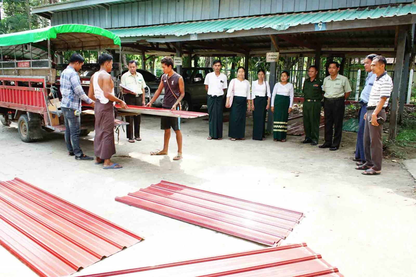 ရခိုင်ပြည်နယ်၊ သံတွဲခရိုင်စီမံအုပ်ချုပ်ရေးအဖွဲ့ဥက္ကဋ္ဌ ဦးမျိုးချစ်နှင့် တာဝန်ရှိသူများသည် ယမန်နေ့ နံနက် ၉နာရီက သံတွဲမြို့နယ် ကျားကိုက်ကျေးရွာ မူလတန်းကျောင်းသို့ ရောက်ရှိကာ အမိုးသွပ်ပြားများ လေဘေးသင့်မှုကြောင့် ပျက်စီးဆုံးရှုံးမှု အခြေအနေများကို လှည့်လည်ကြည့်ရှုစစ်ဆေးခဲ့ပြီး ပြန်လည်မိုးရန်လိုအပ်သည့် အမိုးသွပ်ပြား (၁၀)ချပ်အားထောက်ပံ့ပေးအပ်ခဲ့သည်။