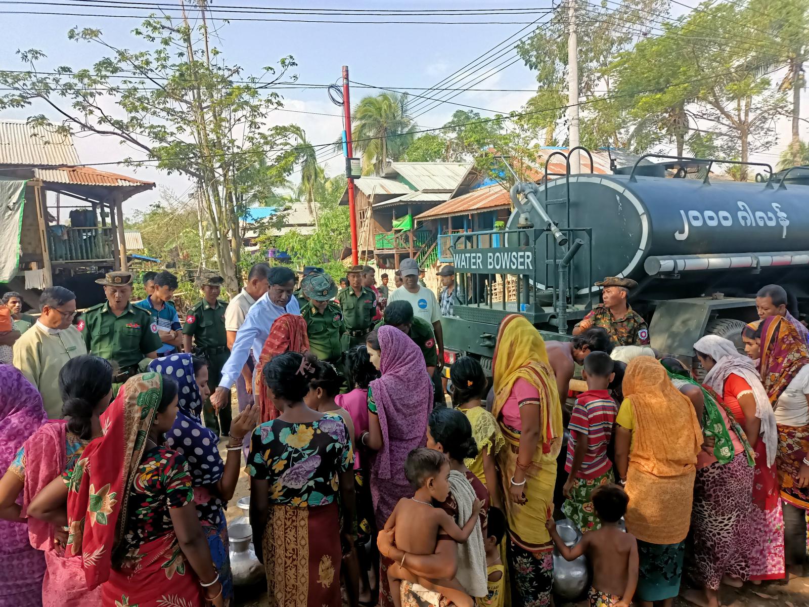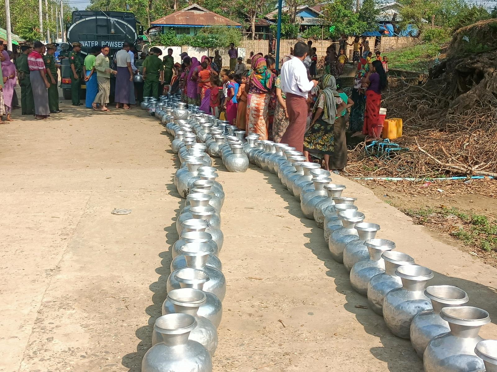 ရခိုင်ပြည်နယ်၊ မောင်တောခရိုင်၊ ဘူးသီးတောင်မြို့နယ်တွင် မိုခါမုန်တိုင်းတိုက်ခတ်ပြီးနောက် ရပ်ကွက်/ကျေးရွာများ၌ သောက်သုံးရေရှားပါးလျက်ရှိရာ တပ်မတော်မှ ရေသန့်ဂါလန် (၂၀၀၀)ဆံ့ တပ်မတော်ရေသယ်ယာဥ်ဖြင့် သောက်ရေသန့်များ ဆက်လက်ပေးဝေလှူဒါန်း လျက်ရှိရာ ယနေ့နံနက် ၈ နာရီခွဲအချိန်က ဘူးသီးတောင်မြို့၊ အမှတ်(၂)ရပ်ကွက်ရှိ ဟိန္ဒူလူမျိုးများနေထိုင်ရာ ရပ်ကွက်အတွင်းနှင့် မြို့နယ်မီးသတ်ဦးစီးဌာနရုံးရှေ့တို့၌ စုရပ်ထားရှိကာ ဝန်ထမ်းမိသားစုများနှင့် ရပ်ကွက်နေပြည်သူများအား သောက်ရေသန့် ဂါလန်(၂၀၀၀)တို့ကို သွားရောက်လှူဒါန်းခဲ့ကြသည်။