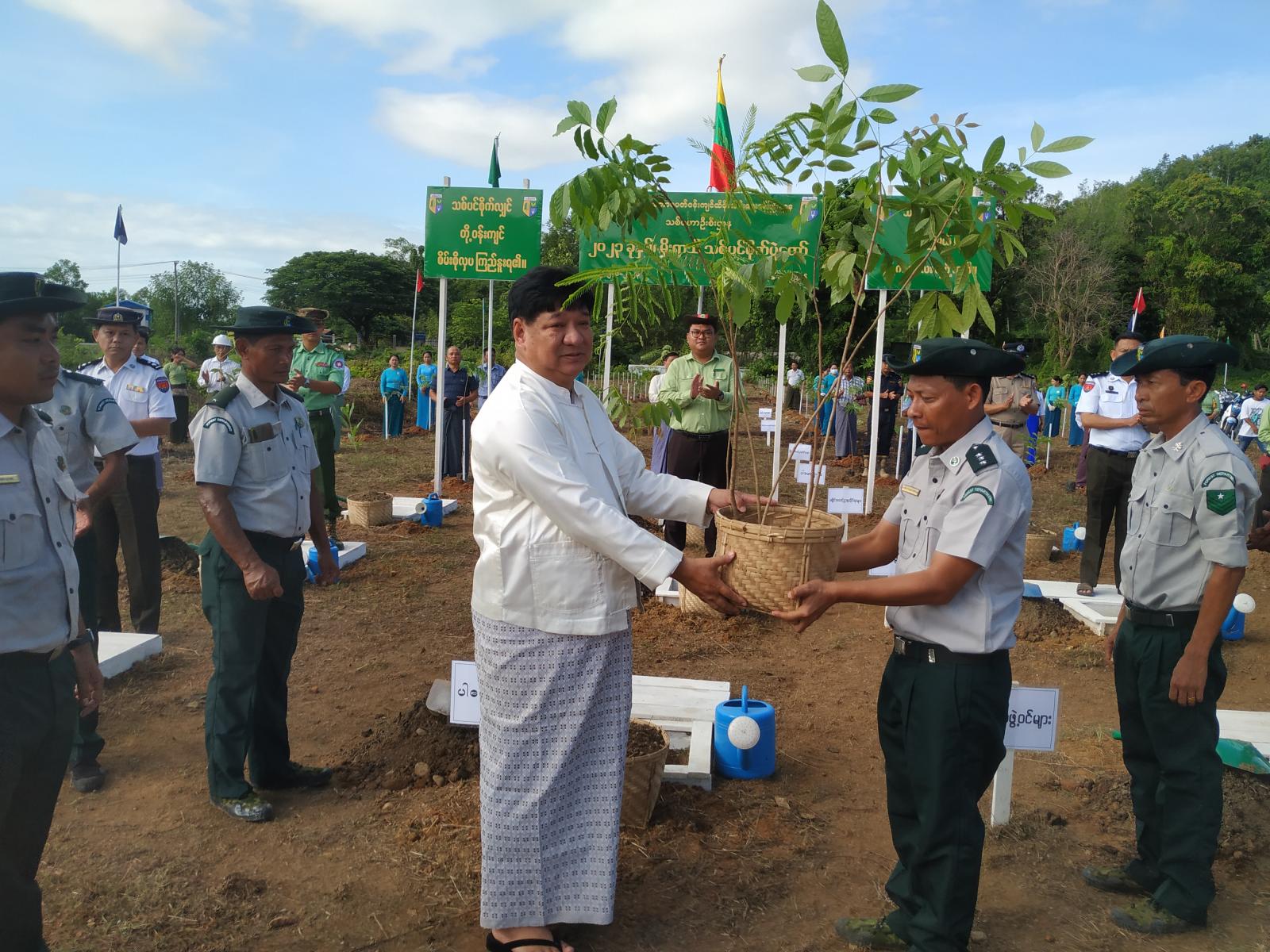 အခမ်းအနားတွင် မြို့နယ်သစ်တောဦးစီးဌာန ဦးစီးအရာရှိ ဦးအေးချမ်းဖြိုးက တောင်ကုတ်တက္ကသိုလ်ပါမောက္ခချုပ် ဒေါက်တာသန်းထွဋ်လွင်၊ ခရိုင်စီမံအုပ်ချုပ်ရေးအဖွဲ့ အတွင်းရေးမှူး ဒုတိယရဲမှူးကြီး ကျော်ဇင်သန့်၊ မြို့နယ်စီမံအုပ်ချုပ်ရေးအဖွဲ့ ဥက္ကဋ္ဌ ဦးဇာနည်တိုးနှင့် ဌာနဆိုင်ရာများ၊ လူမှုရေးအသင်းအဖွဲ့များထံ ပျိုးပင်များလွှဲပြောင်းပေးအပ်ပြီးနောက် စုပေါင်းသစ်စိုက်ပျိုးကြသည်။