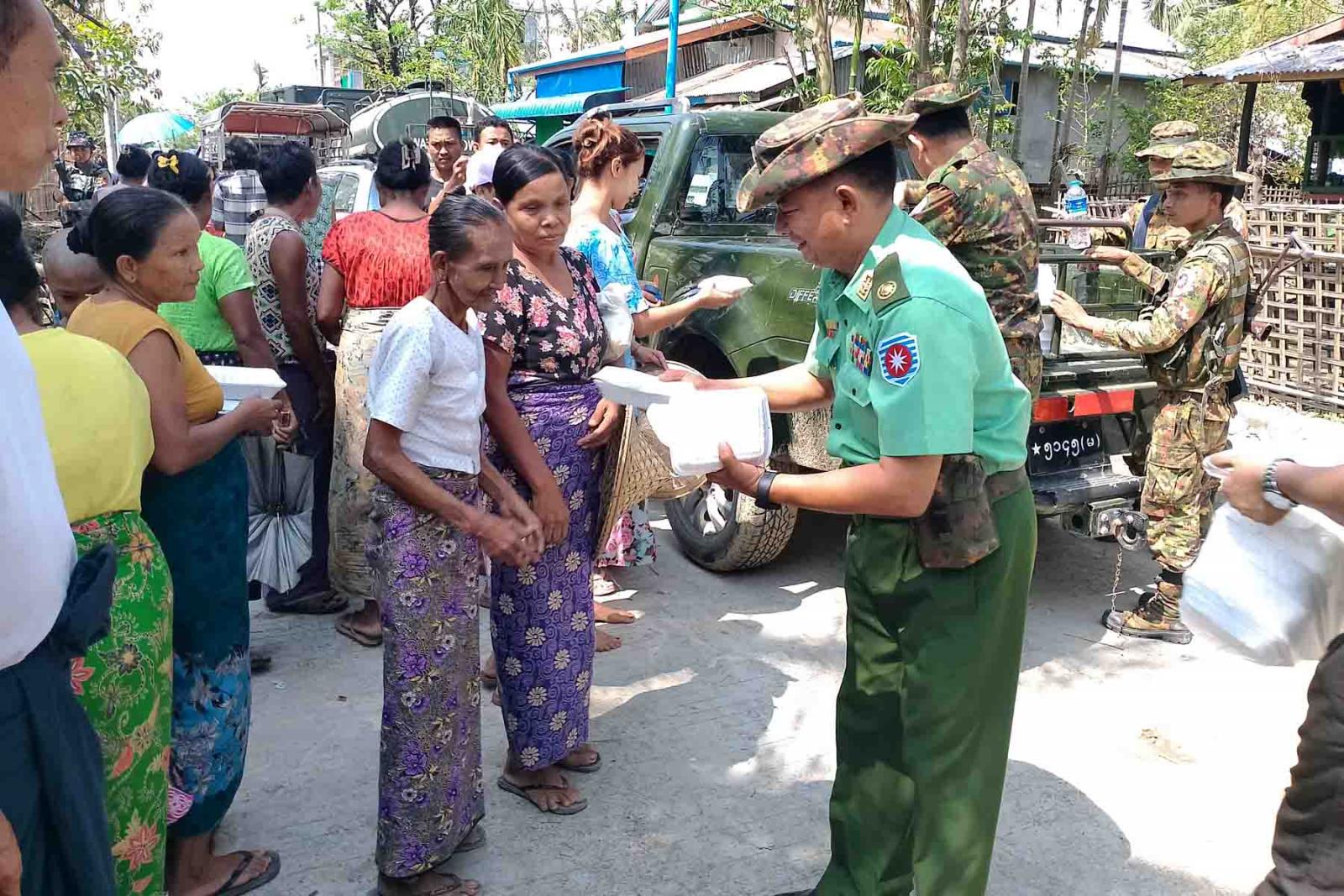 ဆက်လက်၍ ပုဏ္ဏားကျွန်းမြို့ ရွာဟောင်းရပ်ကွက်တွင် အနောက်ပိုင်းတိုင်းစစ်ဌာနချုပ် ၊ တပ်မတော် နယ်လှည့်ဆေးကုသရေးအဖွဲ့မှ ဒေသခံ ပြည်သူများအား အခမဲ့ ဆေးကုသပေးနေမှုများ၊ သောက်ရေသန့် ဖြန့်ဝေပေးနေမှုများကို ကြည့်ရှုအားပေးပြီး၊ ရွာဟောင်းရပ်ကွက်ရှိ ပြည်သူများ၊ ပုဏ္ဏားကျွန်းမြို့ အခြေခံပညာ အထက်တန်းကျောင်းတွင် ပြန်လည်ထူထောင်ရေး လုပ်ငန်းများ ဆောင်ရွက်နေမှုတို့ကို ကြည့်ရှုစစ်ဆေးပြီး၊ ဆရာ၊ ဆရာမများနှင့် ကျောင်းသား၊ ကျောင်းသူများအား ရင်းရင်းနှီးနှီး တွေ့ဆုံ၍ အားပေး စကားများ ပြောကြားကာ ဒံပေါက်ထမင်း ဘူးများ ပေးဝေလှူဒါန်းခဲ့ကြောင်း သိရသည်။