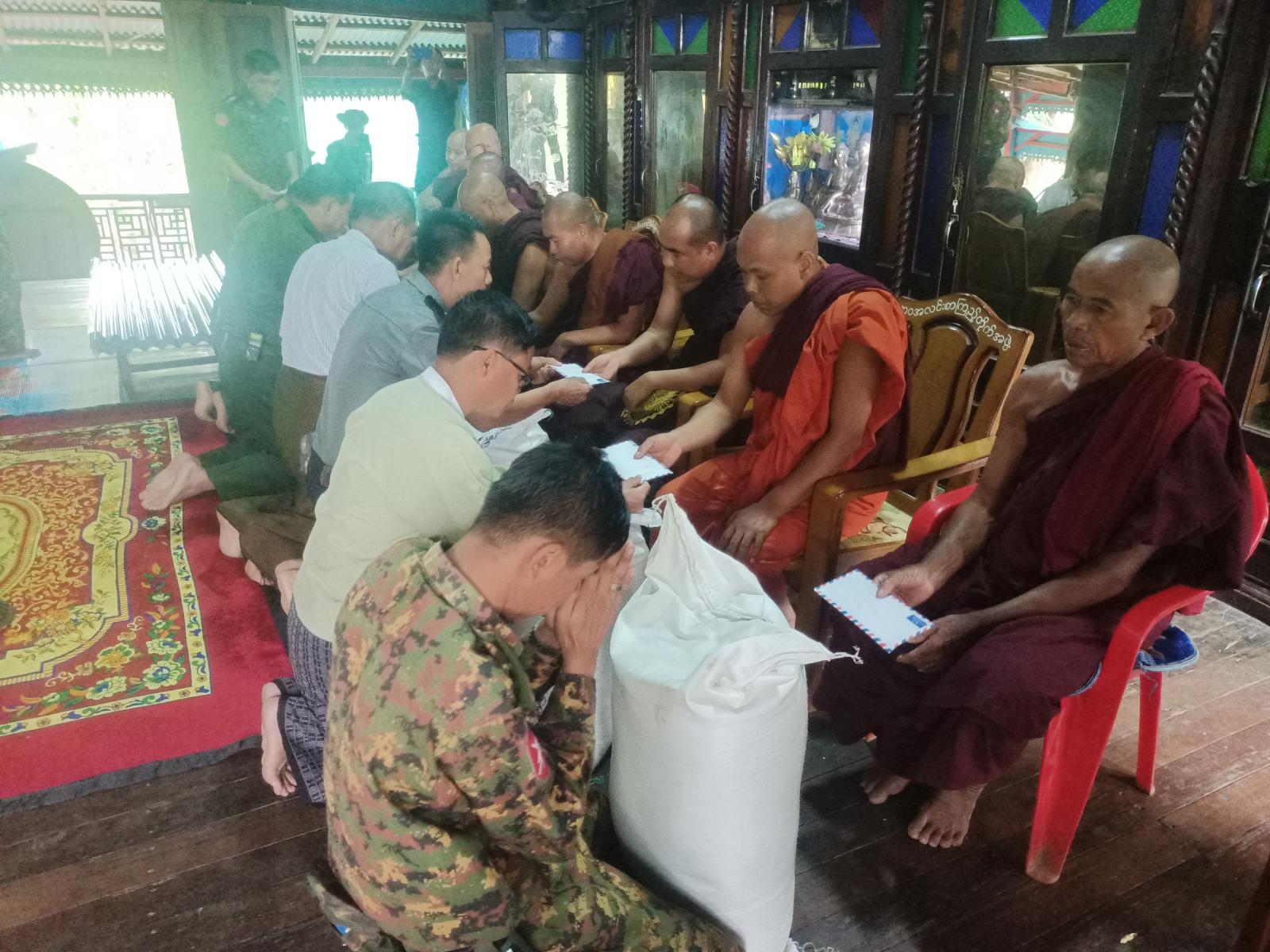 ရခိုင်ပြည်နယ်၊ မောင်တောခရိုင်၊ ဘူးသီးတောင်မြို့နယ်အတွင်း ပြန်လည်ထူထောင်ရေးလုပ်ငန်းများ ဆောင်ရွက်ရန်ရောက်ရှိနေသော ဒုတိယဗိုလ်ချုပ်ကြီး အေးဝင်းနှင့် တာဝန်ရှိသူများသည် ယနေ့နံနက် (၁၀း၀၀) အချိန်က ဘူးသီးတောင်မြို့ လမ်းမဘုန်းတော်ကြီးကျောင်း ဓမ္မာရုံတွင် တပ်မတော်နယ်လှည့် ဆေးကုသရေးအဖွဲ့မှ ပြည်သူလူထုများသို့ နယ်လှည့်ဆေးကုသရေးအဖွဲ့မှ ဆေးကုသပေးနေမှုအခြေအနေများအား သွားရောက်ကြည့်ရှုကာ အားပေးစကားများ ပြောကြားခဲ့ပြီး လမ်းမဘုန်းတော်ကြီးကျောင်း၊ ကျောင်းထိုင်ဆရာတော် ဘဒ္ဒန္တတေဇောဘာသအားဖူးမျှော်ကာ ဩဝါဒခံယူပြီး မိုခါမုန်တိုင်းကြောင့် အမိုးလန် ပျက်စီးသွားသော လမ်းမဘုန်းတော်ကြီးကျောင်း၊ ရွာမဘုန်းတော်ကြီးကျောင်း၊ လေးမျက်နှာတောရဘုန်းတော်ကြီးကျောင်း၊ သာသနာ့ရိပ်သာဘုန်းတော်ကြီး ကျောင်း၊ ရွှေဗိမ္မာန်ဘုန်းတော်ကြီးကျောင်း၊ ဂန္ဓာရီဘုန်းတော်ကြီးကျောင်း၊ နန္ဒဝံတပ်ဦးဘုန်းတော်ကြီးကျောင်း၊ မင်္ဂလာမြို့ဦးဘုန်းတော်ကြီးကျောင်း စုစုပေါင်း ဘုန်းတော်ကြီးကျောင်း (၈) ကျောင်းတို့အတွက် ပြန်လည်ပြုပြင်ရန်လိုအပ်သော အမိုးသွပ်၊ ဆန်များနှင့် ဘေးအန္တရာယ်ဆိုင်ရာ စီမံခန့်ခွဲမှုဦးစီးဌာနမှ မုန်တိုင်းဒဏ်သင့် ဘုန်းတော်ကြီးကျောင်းများထံသို့လှူဒါန်းသော နဝကမ္မငွေသားများ ကျောင်းထိုင်ဆရာတော်ကြီးများအား ဆက်ကပ်လှူဒါန်းခဲ့ကြောင်း သိရသည်။