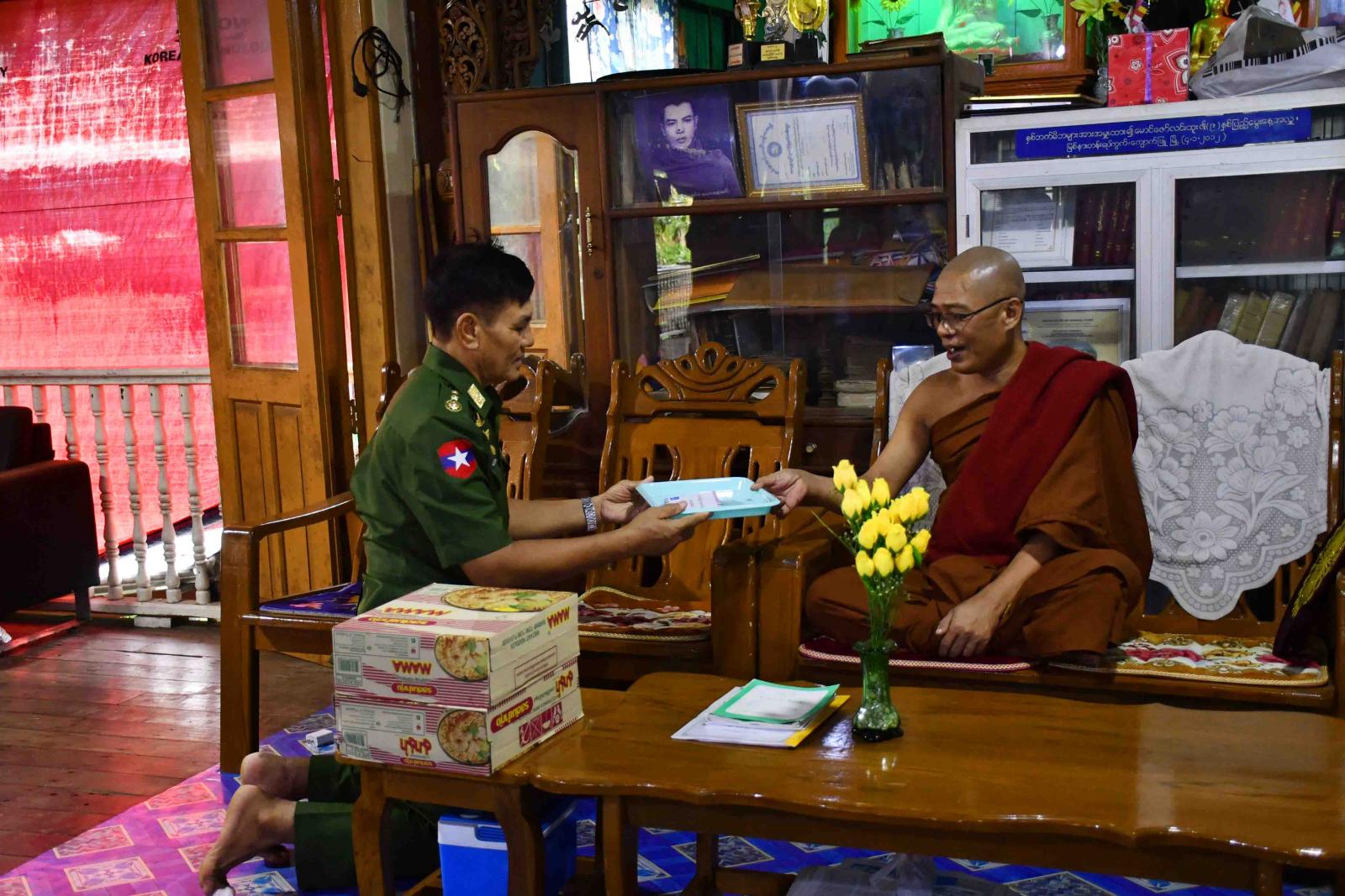 ရှေးဦးစွာ ဒုတိယဗိုလ်ချုပ်ကြီးလူအေးနှင့် တာဝန်ရှိသူများသည် ကျောက်ဖြူမြို့၊ တောင်ရင်းရပ်ကွက်ရှိ ဗောဓိသိပ္ပံဘုန်းတော်ကြီးကျောင်းနှင့် စေတီတောင်ရပ်ကွက်ရှိ လူငယ်ဖွံဖြိုးရေးပရဟိတဂေဟာဘုန်းတော်ကြီး ကျောင်းများသို့ သွားရောက်၍ ဆရာတော်များအား ဖူးမျှော်ကြည်ညိုပြီး နဝကမ္မအလှူငွေနှင့် စားသောက်ဖွယ်ရာများ လှူဒါန်းခဲ့ကာ ၎င်းကျောင်းတိုက်များအတွင်း ဖွင့်လှစ်ထားရှိသည့် ဘုန်းတော်ကြီးသင် ပညာရေးကျောင်းများမှ ကျောင်းသား၊ ကျောင်းသူများအား ကျောင်းသုံးစာအုပ်နှင့် စာရေးကိရိယာများ လှူဒါန်းခဲ့ပြီး ဆရာ၊ဆရာမနှင့် ကျောင်းသား၊ ကျောင်းသူများကို ရင်းရင်းနှီးနှီး တွေ့ဆုံနှုတ်ဆက်၍ အားပေးစကားပြောကြားသည်။