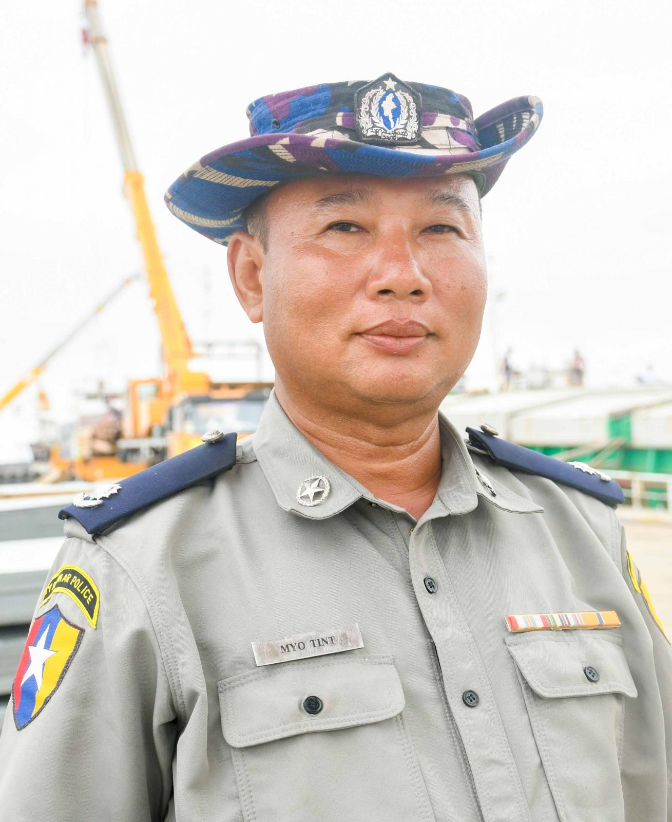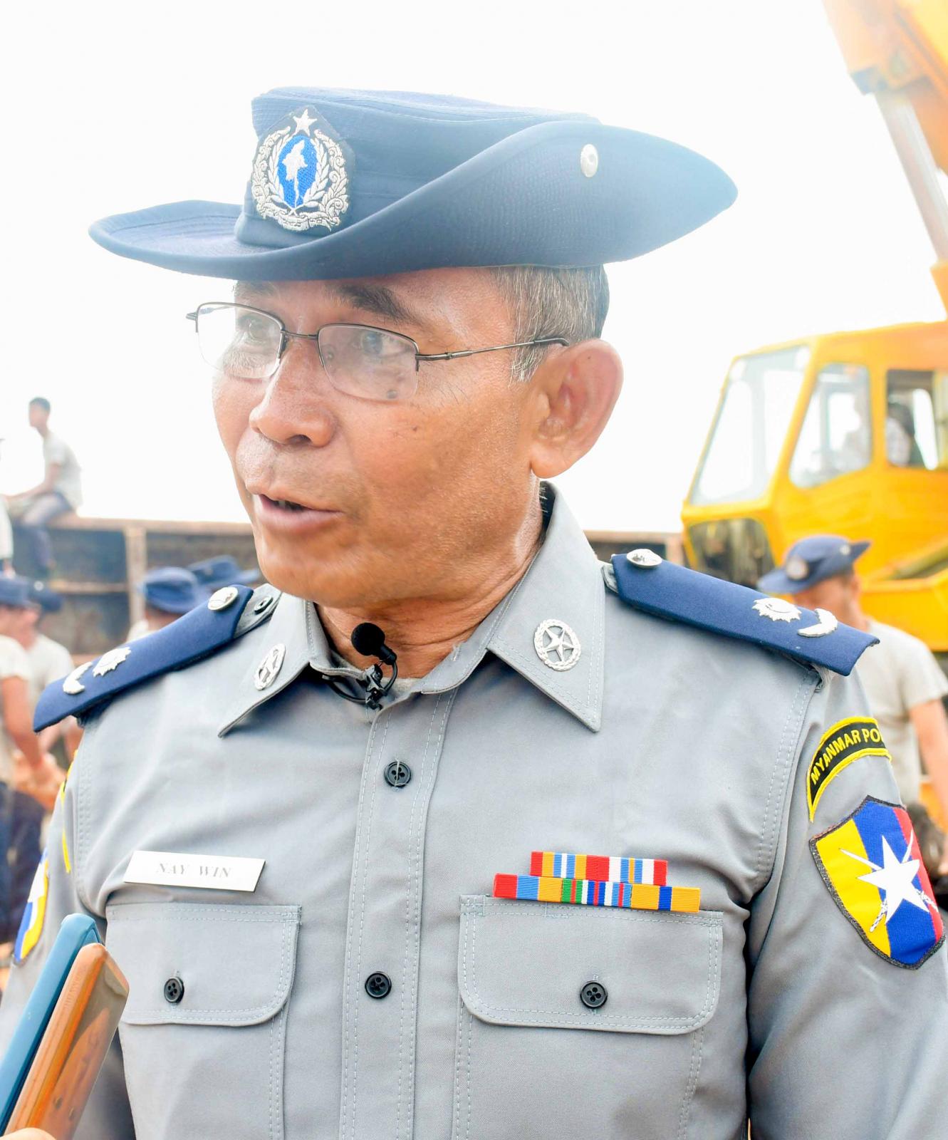 ဖြေ။ ။ ကျွန်တော်ကတော့ ရခိုင်ပြည်နယ်ရဲတပ်ဖွဲ့မှူး ရဲမှူးကြီး သက်လွင်ကိုယ်စား စစ်တွေမြို့၊ ဘက်စုံသုံးဆိပ်ကမ်းမှာ နိုင်ငံတော်က ရေကြောင်းနဲ့ ပေးပို့ရောက်ရှိလာတဲ့ သင်္ဘောတွေက ကုန်ပစ္စည်းတွေကို မုန်တိုင်းသင့် မြို့နယ်တွေက ပြည်သူတွေဆီကို အချိန်နဲ့တပြေးညီရောက်ရှိနိုင်ဖို့အတွက် ကြီးကြပ်ပေးနေတာဖြစ်ပါတယ်။