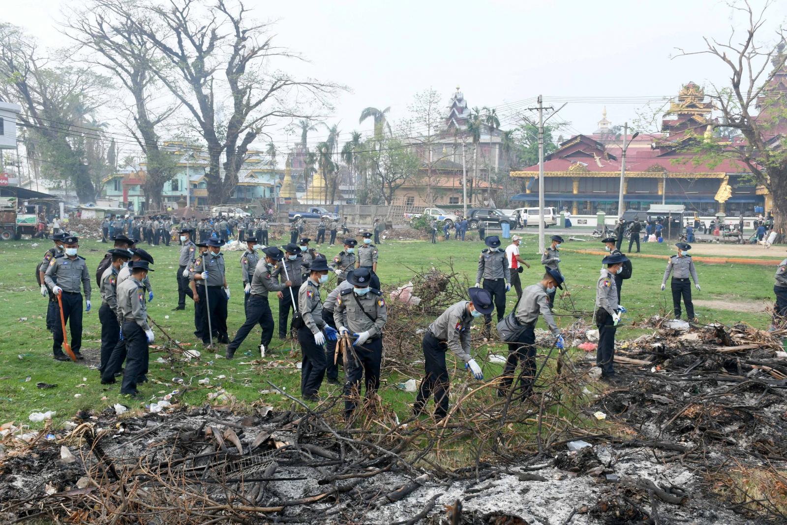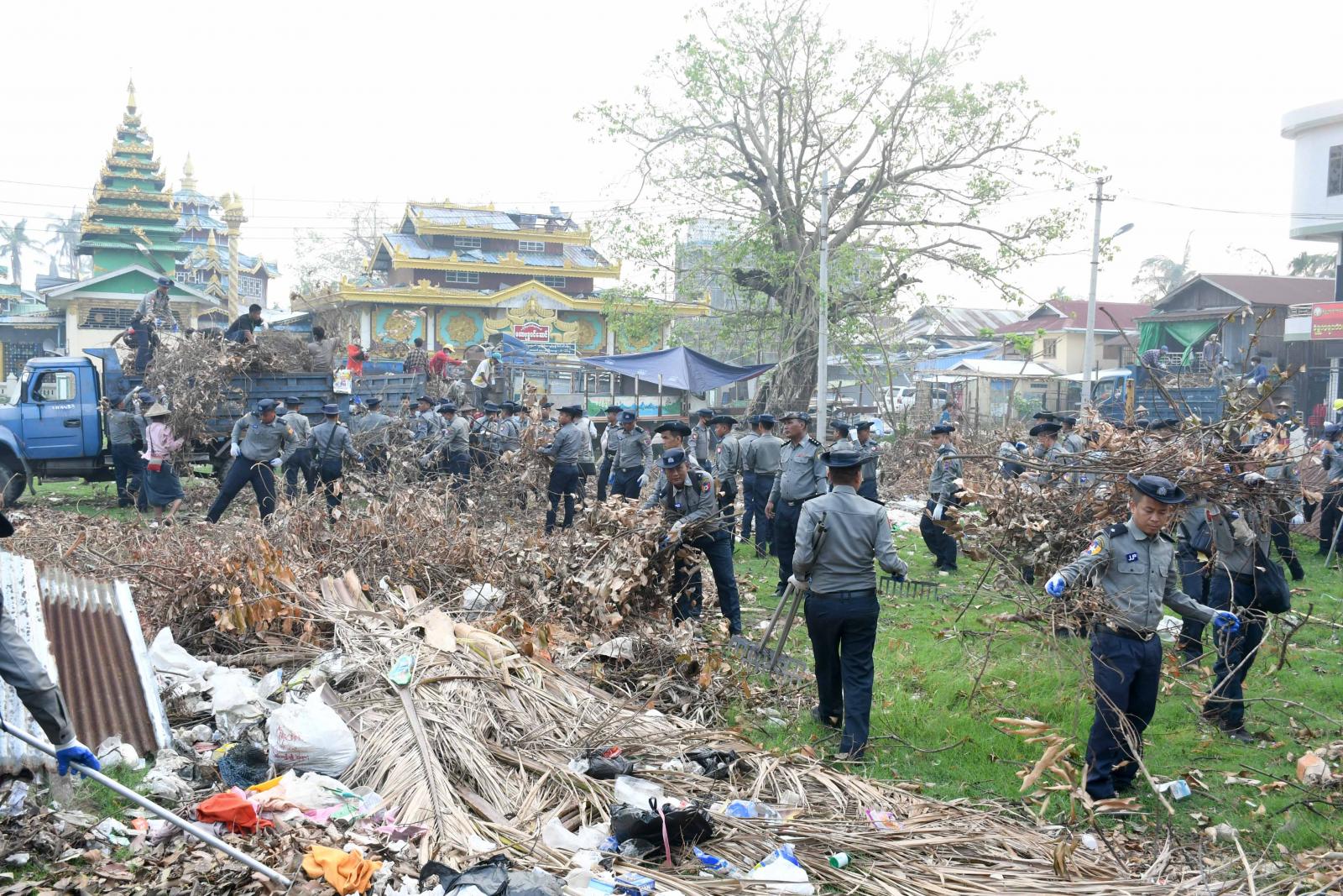 ဖြေ။ ။ ဟုတ် ဒီလိုရှင်းလင်းတဲ့ နေရာမှာ မြန်မာနိုင်ငံရဲတပ်ဖွဲ့အနေနဲ့ ရခိုင်ပြည်နယ်ရဲတပ်ဖွဲ့အပါအဝင် အမှတ်(၂) ရဲလေ့ကျင့်ရေးကျောင်း၊ ဝက်ထီးကန်၊ ပြည်မြို့၊ အမှတ်(၃) ရဲလေ့ကျင့်ရေးကျောင်း၊ စစ်ကိုင်း၊ အမှတ်(၄) ရဲလေ့ကျင့်ရေးကျောင်း၊ တောင်လေးလုံး၊ ရဲအကြပ်အတတ်သင်ကျောင်း(လှော်ကား)၊ ရန်ကုန်၊ ရဲအရာရှိအတတ်သင်ကျောင်း၊ မန္တလေးတို့က တပ်ဖွဲ့ဝင်စုစုပေါင်းအင်အား ၂၀၀၀ ကျော်တို့ဟာ မေလ ၁၉ ရက်နေ့ကစပြီးတော့ ဒေသအသီးသီးက နေ့အလိုက်ရောက်ရှိလာကြပြီးတော့ မြို့တွင်းရှင်းလင်းရေးနဲ့ သန့်ရှင်းရေးလုပ်ငန်းတွေကို ပူးပေါင်းဆောင်ရွက်လျက်ရှိပါတယ်၊ ဒါအပြင် မြို့နယ်အလိုက် ရဲတပ်ဖွဲ့ဝင်တွေကလည်း ရဲတပ်ဖွဲ့ရဲ့ရည်မှန်းချက် တာဝန်(၄)ရပ်ဖြစ်တဲ့ ပြည်သူ့အကျိုးပြုလုပ်ငန်း တာဝန်တွေကို သက်ဆိုင်ဒေသအလိုက် တပ်မတော်၊ မီးသတ်တပ်ဖွဲ့၊ ဌာနဆိုင်ရာတွေ၊ လူမှုရေးအဖွဲ့အ စည်းတွေ၊ ဒေသခံပြည်သူတွေနဲ့ ပူးပေါင်းဆောင်ရွက်လျက်ရှိပါတယ်။