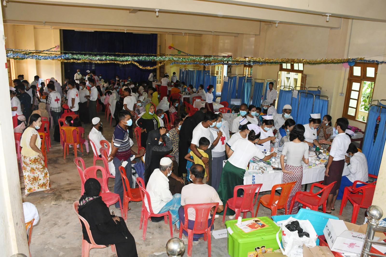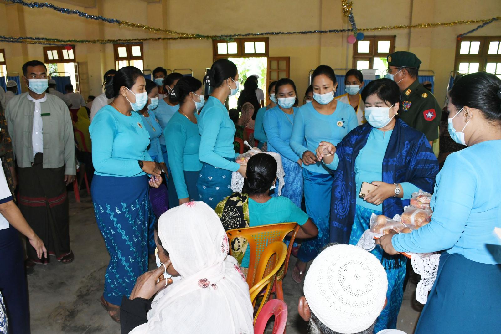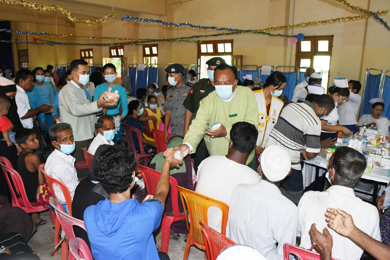 ပြန်လည်ထူထောင်ရေးအတွက် ရောက်ရှိနေသော ဗိုလ်မှူးချုပ်တင်ဆွေ၊ ခရိုင်စီမံအုပ်ချုပ်ရေးအဖွဲ့ ဉက္ကဋ္ဌ ဦးနေဦး၊ မြို့နယ်စီမံအုပ်ချုပ်ရေးအဖွဲ့ဉက္ကဋ္ဌ ဦးကံထွန်းအောင်နှင့် တာဝန်ရှိသူများနှင့်အတူ ယနေ့ နံနက်ပိုင်းက သာသနာ့ဗိမာန်တော်ကြီးတွင် ခွဲစိတ်အထူးကု၊ ကလေးအထူးကု၊ သမားတော်၊ သားဖွားမီးယပ်၊ အရိုးအထူးကုစသည့် ဆရာဝန်များကပြည်သူများအား ကျန်းမာရေးစောင့်ရှောက်ပေးနေမှုများအား သွားရောက်ကြည့်ရှုအားပေးပြီး လိုအပ်သည်များအား ပေါင်းစပ်ကူညီဆောင်ရွက်ပေးခဲ့ကာ လာရောက်ဆေးကုသမှုခံယူကြသော ပြည်သူများအား တာဝန်ရှိသူများက အာဟာရဖြည့်စွက်စာများထောက်ပံ့ပေးအပ်ခဲ့ကြသည်။ အဆိုပါ အထူးကုဆရာဝန်ကြီးများက ကျန်းမာရေးစောင့်ရှောက်မှုပေးရာတွင် ဒေသခံပြည်သူ ၄၅၀ ဦးခန့် လာရောက်ဆေးကုသမှုခံယူကြပြီး အမျိုးသမီးရေးရာ အဖွဲ့ဝင်များ၊ မိခင်နှင့်ကလေးစောင့်ရှောက်ရေး အသင်းနှင့် ကြက်ခြေနီတပ်ဖွဲ့ဝင်များ၊ ရပ်ကွက်ကျေးရွာအုပ်ချုပ်ရေးမှူးများနှင့် တာဝန်ရှိသူများက ကူညီဆောင်ရွက်ပေးခဲ့ကြသည်။