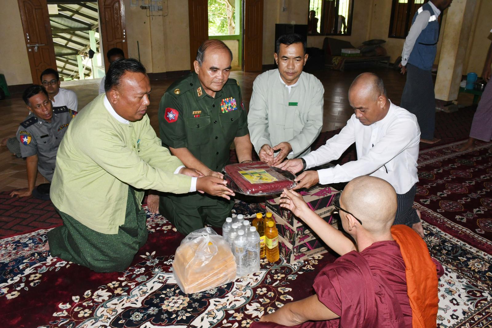 ရခိုင်ပြည်နယ်မောင်တောမြို့တွင် ပြန်လည်ထူထောင်ရေးအတွက်ရောက်ရှိနေသော ဗိုလ်မှူးချုပ်တင်ဆွေ၊ ခရိုင်စီမံအုပ်ချုပ်ရေးအဖွဲ့ဉက္ကဋ္ဌ ဦးနေဦးနှင့် တာ၀န်ရှိသူများနှင့်အတူ ဇူလိုင် ၄ ရက်နေ့ နံနက်ပိုင်းက အထူးကုဆရာဝန်များက သာသနာ့ဗိမာန်တော်ကြီးတွင် ပြည်သူများအား ကျန်းမာရေးစောင့်ရှောက်ပေးနေမှုများအား ကြည့်ရှုအားပေးပြီးဆေးကုသရန် လာရောက်ကြသည့် ပြည်သူများအား အာဟာရဖြည့်စွက်စာများ ထောက်ပံ့ပေးအပ်၊ ဘုန်းတော်ကြီးကျောင်းများအား ဝါဆိုသင်္ကန်းနှင့် လှူဖွယ်ဝတ္တူပစ္စည်းများ ဆက်ကပ်လှူဒါန်းခဲ့ကြကြောင်း သိရသည်။