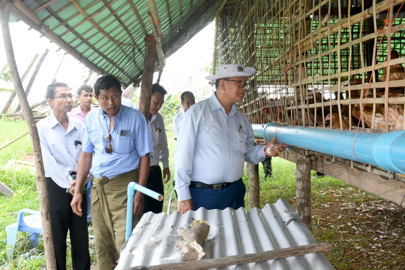 ထို့နောက် ဒုတိယဝန်ကြီးနှင့်အဖွဲ့သည် အောင်မင်္ဂလာကျေးရွာအနီးတွင် ဥစားကြက် မွေးမြူရေးတောင်သူ ဦးမောင်စံမြ၏ ကြက်မွေးမြူရေးခြံသို့ သွားရောက်ကြည့်ရှုအားပေးကြရာ မွေးမြူရေးလုပ်ငန်းရှင်က ဥစားကြက်မွေးမြူထားရှိမှု အခြေအနေများနှင့် လိုအပ်ချက်များကို ရှင်းလင်းတင်ပြသည်။ တင်ပြချက်များအပေါ် ဒုတိယဝန်ကြီးက ဇီဝလုံခြုံမှုအလေးထားရန်၊ ယခုပုံစံမှ ကောင်းမွန်သော မွေးမြူရေးကျင့်စဉ် (GAHP)နှင့်အညီ မွေးမြူနိုင်သော ခြံအဖြစ် တဖြည်းဖြည့်းနှင့် အဆင့်မြှင့်တင် ဆောင်ရွက်သွားရန်မှာကြားပြီး ကြက်ခြံ၏ဇီဝလုံခြုံရေးအတွက် အသုံးပြုရန် ခြံဖျန်းပိုးသတ်ဆေးများကို ထောက်ပံ့ပေးအပ်ခဲ့သည်။