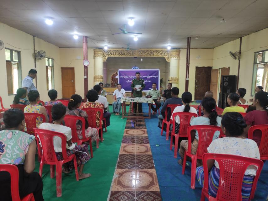 နိုင်ငံရေးစစ်ကြောင်းအဖွဲ့ခေါင်းဆောင် မြို့နယ်စီမံအုပ်ချုပ်ရေးအဖွဲ့ အဖွဲ့ဝင်(၁) ဗိုလ်မှူး ရဲကျော်အောင်မှ မိုခါမုန်တိုင်းနှင့် ပတ်သတ်၍ နိုင်ငံတော်မှထောက်ပံ့ပစ္စည်းများ ရရှိ/ဖြန့်ဝေပေးမှုအခြအနေ၊ နိုင်ငံတော်၏ရှေ့လုပ်ငန်းစဉ်များနှင့် မူဝါဒများကို ရှင်းလင်းပြောကြားပြီး ထူးခြားမှု ရှိပါက သက်ဆိုင်ရာတာဝန်ရှိသူများအား သတင်းပေးပို့ရန် စည်းရုံးမှာကြားသည်။ အုပ်ချုပ်ရေး စစ်ကြောင်းအဖွဲ့ခေါင်းဆောင် မြို့နယ်စီမံအုပ်ချုပ်ရေးအဖွဲ့ဥက္ကဋ္ဌ ဦးခိုင်းလင်းနိုင်က မိမိဒေသဖွံ့ဖြိုးတိုးတက်ရေးအတွက် နိုင်ငံတော်၏ရှေ့လုပ်ငန်းစဉ်များ မူဝါဒများအား ကျေးလက်နပြည်သူများ သိရှိစေရန် ရှင်းလင်းပြောကြားပြီး ရပ်ရွာအေးချမ်းသာယာရေးအတွက် အကြမ်းဖက်အဖွဲ့နှင့် ဆက်နွယ်မှုမပြုကြုရန်နှင့် ကျေးရွာဖွံ့ဖြိုးတိုးတက်ရေးအတွက် အနှောက်အယှက် ထူးခြားဖြစ်စဉ် အကြောင်းအရာရှိပါက သက်ဆိုင်ရာတာဝန်ရှိသူများ ထံသတင်းပေးရန် စည်းရုံးမှာကြားသည်၊ ဒေသဖွံ့ဖြိုးရေးစစ်ကြောင်းအဖွဲ့ဝင် မွေး/ကုဦးစီးဌာနမှ ဒေါက်တာဝင်းထိုက်က မိုခါမုန်တိုင်းအလွန်ကာလ၌ ကျေးရွာများအတွင်း မွေးမြူထားသော တိရိစ္ဆာန်များအား ကာကွယ်ဆေးထိုးနှံခြင်းတို့၌ ပူးပေါင်းဆောင်ရွက်ရန်ပြောကြားသည်၊ လူမှုရေးစစ်ကြောင်းအဖွဲ့ခေါင်းဆောင် မြို့နယ်ကုသရေးဦးစီးဌာနမှ ဒေါက်တာသန်းထွန်းက မိုခါမုန်တိုင်းနှင့် မုန်တိုင်းအလွန် ကျေးရွာများတွင် ကျန်းမာရေးစောင့်ရှောက်မှုများအား ပူးပေါင်းဆောင်ရွက်သကဲ့သို့ ယခုအခါဖြစ်ပေါ်နေသော သွေးလွန်တုတ်ကွေးရောဂါ ကျဆင်းစေရေးအတွက် ကျန်းမာရေးလုပ်ငန်းများ ဆောင်ရွက်ကြရာ၌ ပူးပေါင်းပါဝင်ဆောင်ရွက်ကြရန် ပြောကြားပြီး စည်းရုံးရေးစစ်ကြောင်းအဖွဲ့ ခေါင်းဆောင် လူဝင်မှုကြီးကြပ်ရေးနှင့် အမျိုးသားမှတ်ပုံတင်ရေးဦးစီးဌာနမှ ဦးဇော်ဇော်လွင်မှ မိုခါမုန်တိုင်း ပျက်စီးဆုံးရှုံးခဲ့သော မှတ်ပုံတင်နှင့် အိမ်ထောင်စုစာရင်းများကို သတ်မှတ်ပုံစံများဖြင့် လှဲလှယ်နိုင်ရေး ဆောင်ရွက်ကြရန် စည်းရုံးပြောကြားသည်။