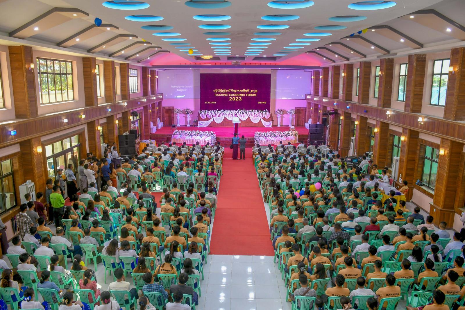 ရခိုင်ပြည်နယ် အစိုးရအဖွဲ့၏ စီစဉ်မှုဖြင့် ပြည်နယ်အတွင်း ဒေသခံစွန့်ဦးတီထွင် စီးပွားရေး လုပ်ငန်းရှင်များ ပေါ်ထွက်လာစေရေးနှင့် ရခိုင်ပြည်နယ်၏ အနာဂတ်စီးပွားရေး ဖွံ့ဖြိုးတိုးတက်မှုလုပ်ငန်းများနှင့် ပတ်သက်၍ ရည်ရွယ်ကျင်းပသည့် ရခိုင်ပြည်နယ်စီးပွားရေးဖိုရမ် (Rakhine Economic Forum 2023) ဖွင့်ပွဲကို ယနေ့ နံနက်ပိုင်းက စစ်တွေမြို့၊ ခိုင်သဇင်ခန်းမ၌ ကျင်းပရာ ရခိုင်ပြည်နယ် ဝန်ကြီးချုပ် ဦးထိန်လင်းနှင့်ဇနီး ဒေါ်ဆွေဆွေမြတ်၊ ပြည်နယ်တရားလွှတ်တော်တရားသူကြီးချုပ်၊ ပြည်နယ်အစိုးရအဖွဲ့ဝင်များ၊ ဌာနဆိုင်ရာများ၊ စီးပွားရေး လုပ်ငန်းရှင်များ၊ နယ်ပယ်အသီးသီးမှ ကျွမ်းကျင်ပညာရှင်များ၊ ရခိုင်လူငယ်များ၊ ကျောင်းသား၊ ကျောင်းသူများနှင့် ဖိတ်ကြားထားသူများ တက်ရောက်ကြသည်။