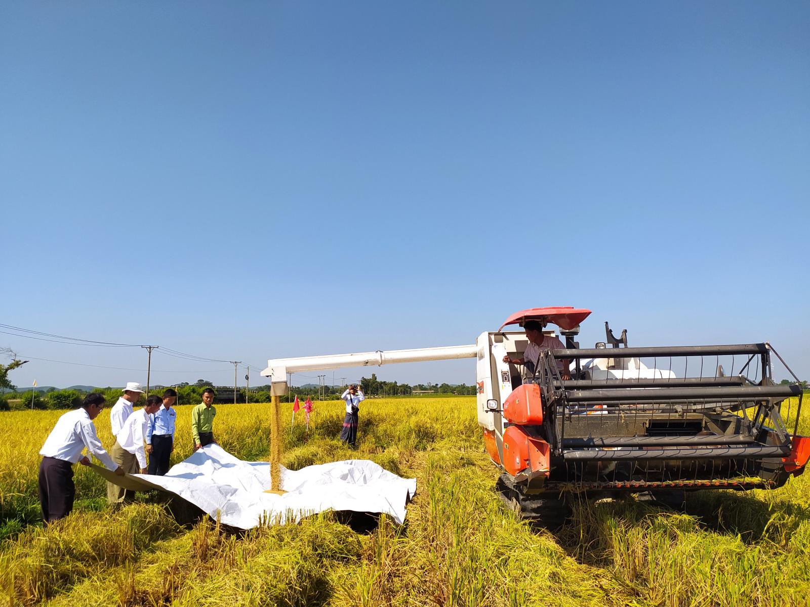 မိုးစပါးစံကွက်(၀.၁၀)ဧက ရိတ်သိမ်းရာ၌ တောင်သူ ဦးထွန်းစိန်အောင် စိုက်ပျိုးထားရှိသည့် နှံကောက်စပါးအမျိုးအစားအား စံကွက်ရိတ်သိမ်းခြင်းဖြစ်ကာ (၀.၁၀) ဧကတွင် အထွက်နှုန်းအစို (၁၂၅) တင်း၊ အခြောက် (၁၁၂.၅) တင်း ထွက်ရှိခဲ့ပြီး မြို့နယ်၏ မိုးစပါးအထွက်နှုန်း ပိုမိုတိုးတက်လာစေရေးအတွက် မျိုးကောင်းမျိုးသန့်သုံးစွဲနိုင်ရေး၊ စိုက်စနစ်မှန်ကန်စေရေးနှင့် အပင်ပြုစုခြင်းဆိုင်ရာ နည်းစနစ်များကို မြိုနယ်စိုက်ပျိုးရေးဦးစီးဌာနမှ ဝန်ထမ်းများက တောင်သူများကို ရှင်းလင်းပြောကြားခဲ့ကြောင်း သိရသည်။