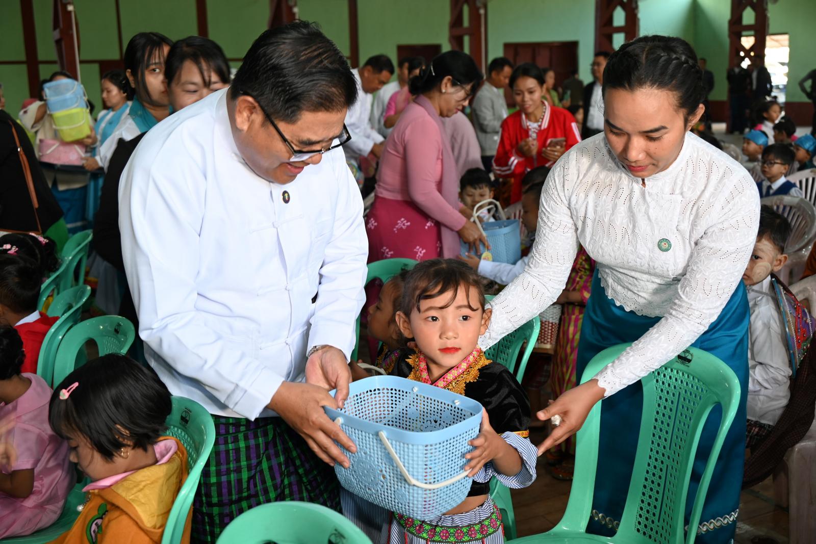 ထို့နောက် ပြည်နယ်ဝန်ကြီးချုပ်နှင့် ဇနီးဒေါ်နန်ဆိုင်း၊ ပြည်နယ်ဝန်ကြီးများနှင့် ၎င်းတို့၏ဇနီးများ၊ ပြည်နယ်အမျိုးသမီးရေးရာအဖွဲ့ဝင်များက အခမ်းအနားတက်ရောက်လာကြသည့် ရင်သွေးငယ်များအား အမှတ်တရ လက်ဆောင်များကို ပေးအပ်ခဲ့ကြပြီး လူမှုဝန်ထမ်းဦးစီးဌာန၊ အမှတ်(၁)မူလတန်းကြိုကျောင်း ရင်သွေးငယ်များက ပြည်နယ်ဝန်ကြီးချုပ်နှင့် အဖွဲ့ဝင်များအား အမှတ်လက်ဆောင်များကို ပြန်လည် ပေးအပ်ခဲ့ကြသည်။