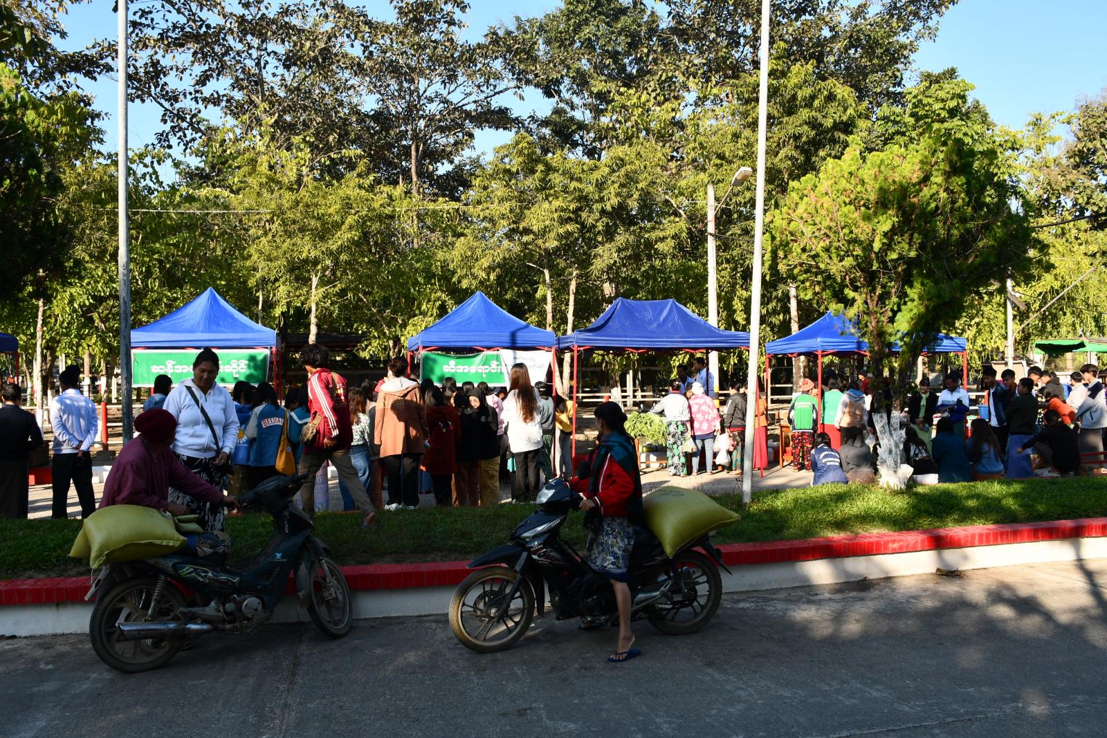 ကချင်ပြည်နယ် ဗန်းမော်မြို့နယ်တွင် ဆရာ၊ ဆရာမ၊ ဝန်ထမ်းများနှင့် ကျောင်းသားကျောင်းသူများအား အခြေခံစားသောက်ကုန်များကို စျေးနှုန်းချိုသာစွာဖြင့် ဝယ်ယူနိုင်ရေးရည်ရွယ်၍ ယနေ့နံနက် (၈) နာရီအချိန်က နမ့်ဖါးရပ်ကွက်ရှိ ဗန်းမော်တက္ကသိုလ် ကျောင်းဝင်းအတွင်း၌ ရောင်းချပေးလျက်ရှိကြောင်း သိရသည်။