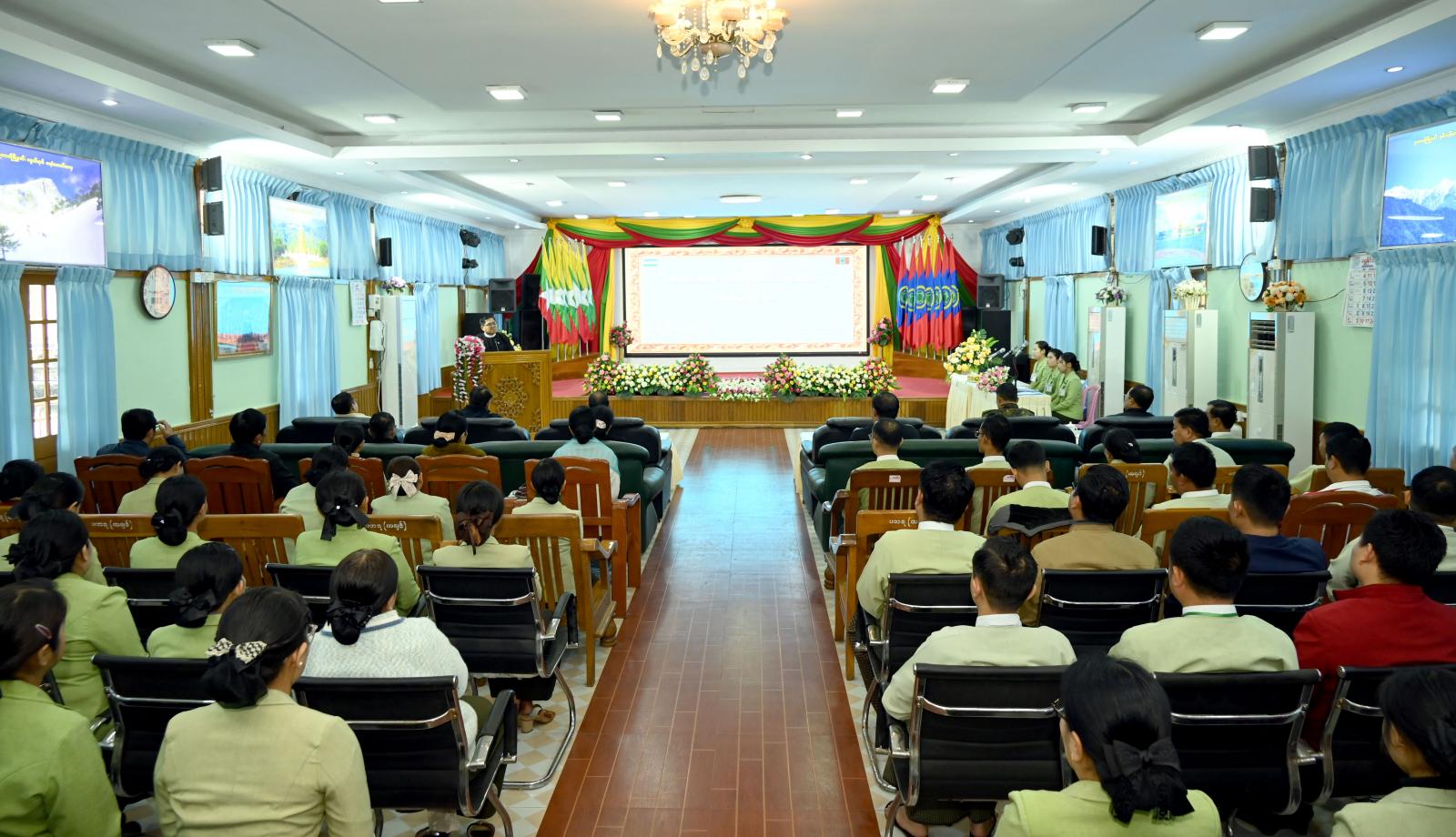 ကချင်ပြည်နယ်အစိုးရအဖွဲ့ကကြီးမှူး၍ ပြည်နယ်အစိုးရအဖွဲ့ရုံးနှင့် ပြည်နယ်အထွေထွေအုပ်ချုပ်ရေးဦးစီးဌာန အရာထမ်း/ အမှုထမ်းများအတွက် အခမ်းအနားမှူးသင်တန်းကို (၄)ရက်ကြာဖွင့်လှစ်သင်ကြားပေးခဲ့ပြီး သင်တန်းဆင်းပွဲအခမ်းအနားကို ယမန်နေ့ နံနက် ၉ နာရီက ပြည်နယ်အစိုးရအဖွဲ့ရုံးဝင်းအတွင်းရှိ ဆမားဒူဝါဆင်ဝါးနော်ခန်းမ၌ကျင်းပပြုလုပ်ရာ ပြည်နယ်ဝန်ကြီးချုပ် ဦးခက်ထိန်နန်က အမှာစကားပြောကြားသည်။