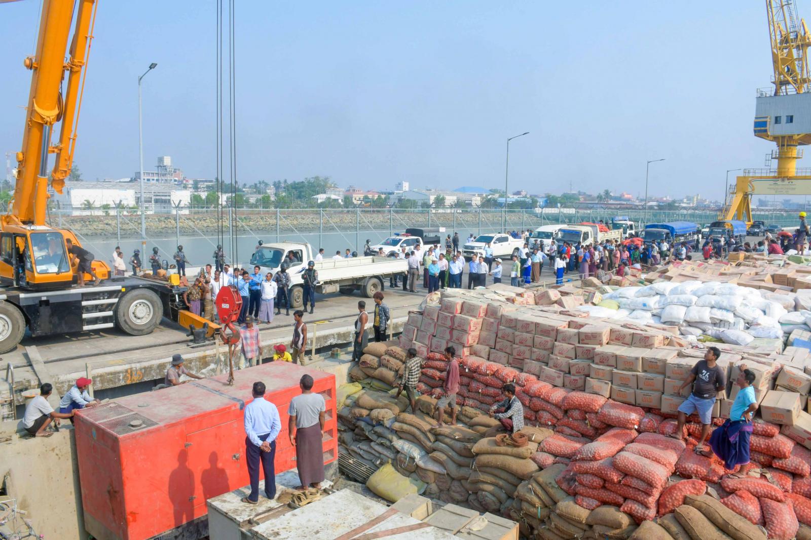 ဆက်လက်၍ ပြည်နယ်ဝန်ကြီးချုပ်နှင့်အဖွဲ့သည် ရန်ကုန်တိုင်းဒေသကြီးအစိုးရအဖွဲ့နှင့် ရခိုင်ပြည်နယ်အစိုးရအဖွဲ့တို့၏ အစီအစဉ်ဖြင့် ရန်ကုန်မြို့မှ စစ်တွေမြို့သို့ အမ်ဗွီ ရွှေသုဝဏ်သင်္ဘောဖြင့် ရောက်ရှိလာသော စားသောက်ကုန်များပစ္စည်းများအား အတင်အချပြုလုပ်နေမှုကို သွားရောက်ကြည့် ရှုစစ်ဆေးကြသည်။