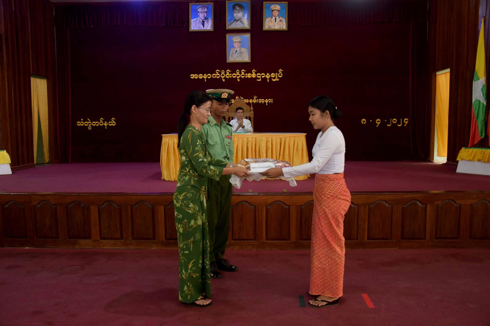ဆက်လက်၍ ပြည်နယ်ဝန်ကြီးချုပ်နှင့်အဖွဲ့သည် နယ်မြေခံတပ်ရင်းခန်းမ၌ သံတွဲတပ်နယ်မှ တပ်မိသားစုဝင်များအား ထောက်ပံ့ငွေနှင့်ပစ္စည်းများပေးအပ်ပွဲသို့ တက်ရောက်ကြသည်။