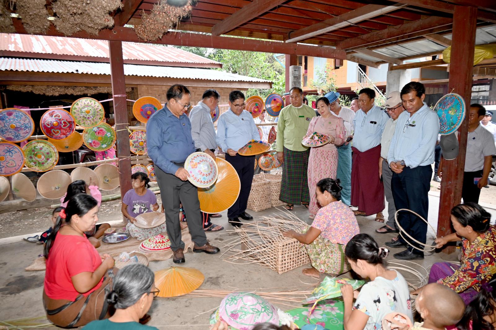 ထို့နောက် အဆိုပါရပ်ကွက်အတွင်း ပိုင်ရှင်ဦးသိန်းဝင်း၏ မိသားစုတစ်ပိုင်တစ်နိုင် စီးပွားရေး လုပ်ငန်းများဖြစ်သည့် ခမောက်လုပ်ငန်း ဆောင်ရွက်နေမှုများကို လည်းကောင်း၊ မိုးဒါးစုရပ်ကွက် အတွင်း ပိုင်ရှင်ဒေါ်စီစီ၏ တံမြက်စည်း လုပ်ငန်းဆောင်ရွက်နေမှုများကို လည်းကောင်း၊ နောင်စွန်း ရပ်ကွက်အတွင်း ပိုင်ရှင်ဦးလှမြိုင်၏ ဝါး၊ ကြိမ်ခြင်းရက်လုပ်ခြင်းလုပ်ငန်း ဆောင်ရွက်နေမှုများကို လည်းကောင်း၊ ထိုမှတစ်ဆင့် နားခါရပ်ကွက်၊ ရန်ကင်းရပ်ရှိ ပိုင်ရှင်ဦးထွန်းဖေ၏ ဝါး၊ ကြိမ်ပစ္စည်းများ အသုံးပြု၍ လူသုံးကုန်ပစ္စည်းအမျိုးမျိုးထုတ်လုပ်မှုလုပ်ငန်း ဆောင်ရွက်နေမှုများကိုလည်းကောင်း၊ ပိုင်ရှင် ဦးထွန်းထွန်း၏ ဝါးခမောက် လုပ်ငန်းဆောင်ရွက်နေမှုများကို လည်းကောင်း လှည့်လည်ကြည့်ရှုစစ်ဆေးခဲ့ကြပြီး မိသားစုတစ်ပိုင်တစ်နိုင် စီးပွားရေးလုပ်ငန်းများ ပိုမိုအကျိုးဖြစ်ထွန်းစေရေး အတွက် ဈေးကွက်ရရှိမှု အခြေအနေများ၊ နိုင်ငံ့စီးပွားမြှင့်တင်ရေး ရန်ပုံငွေဖြင့် ရင်းနှီးမတည်ငွေ ပံ့ပိုးပေးနိုင်ရေးတို့အတွက် ဆွေးနွေးဆောင်ရွက်ခဲ့ကြသည်။