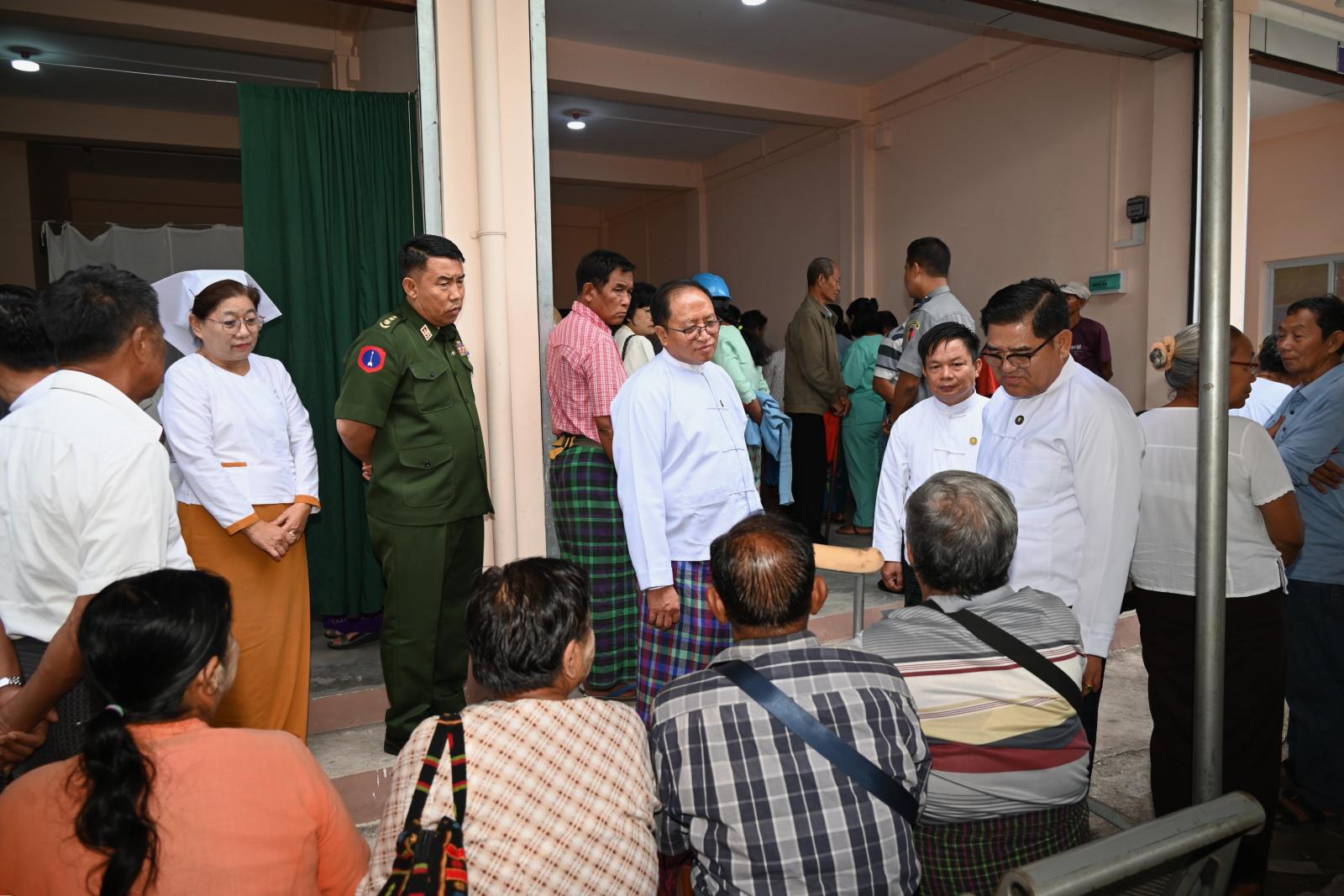 ဆက်လက်၍ ပြည်နယ်ဝန်ကြီးချုပ်နှင့် အဖွဲ့ဝင်များသည် ပြည်သူ့ဆေးရုံကြီး (၃)ထပ် လူနာဆောင်သို့ သွားရောက်ပြီး အရိုးရောဂါကြပ်မတ်ကုသရေးဌာန၌ ဝိုင်းမော်မြို့နယ်အတွင်း နယ်မြေမတည်ငြိမ်မှုဖြစ်စဉ်များကြောင့် ထိခိုက်ဒဏ်ရာရခဲ့ကြသော ပြည်သူများအား သွားရောက်တွေ့ဆုံအားပေးကာ ထောက်ပံ့ပစ္စည်းများကိုလည်းကောင်း၊ ကုသပေးနေမှုအခြေအနေများကိုလည်းကောင်း မေးမြန်းဆွေးနွေးခဲ့ကြပြီး ကျန်းမာရေးဝန်ထမ်းများအတွက် ချီးမြှင့်ထောက်ပံ့ငွေများကို ထောက်ပံ့ပေးအပ်ခဲ့ကြသည်။